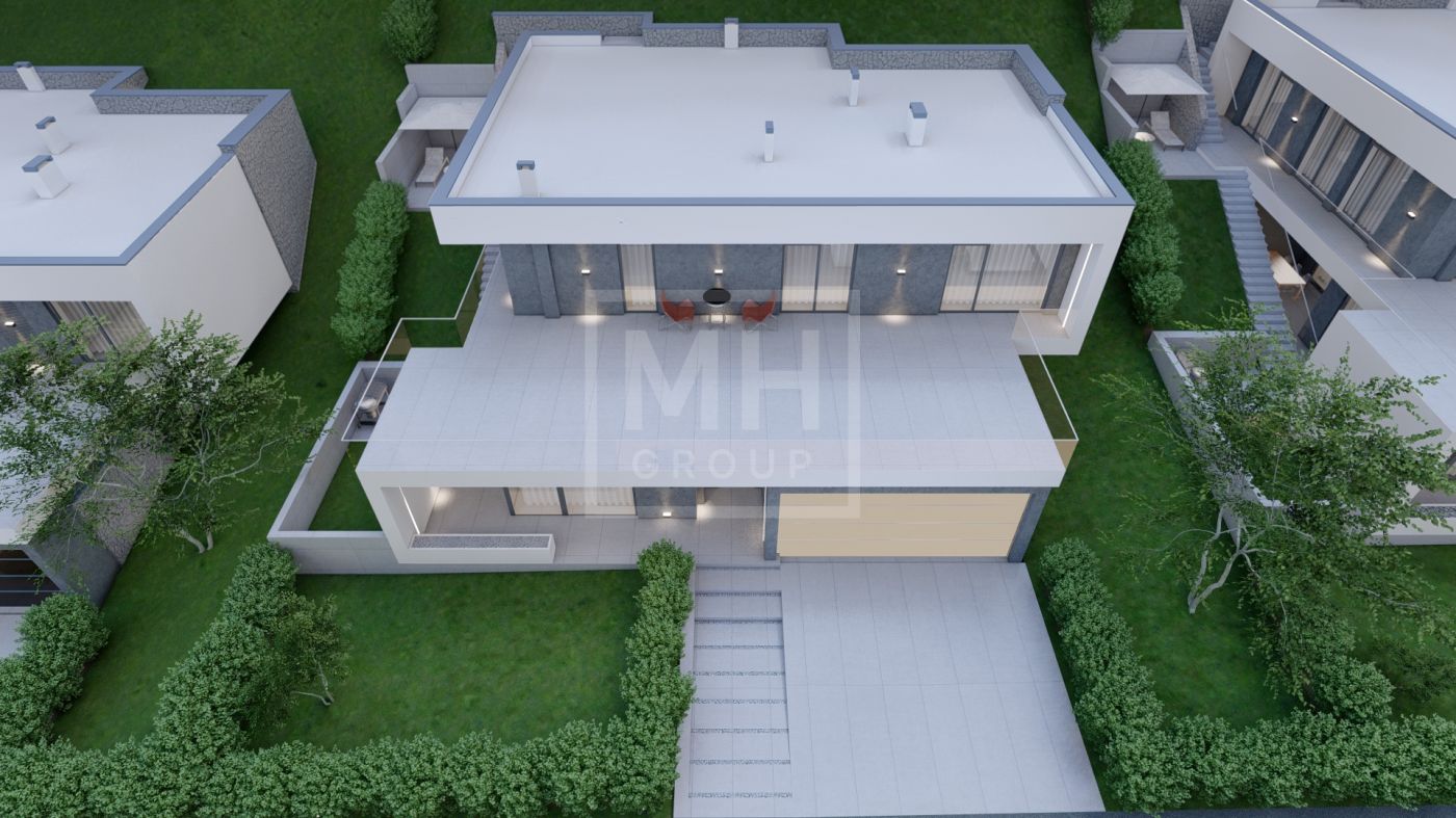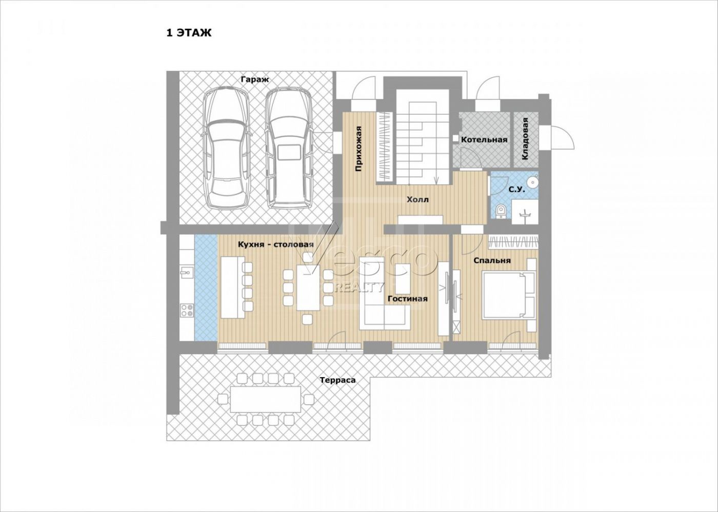 Этаж 1: гостиная-кухня-столовая с выходом на террасу, гостевая спальня или кабинет, санузел, котельная, гараж на 2 м/м;