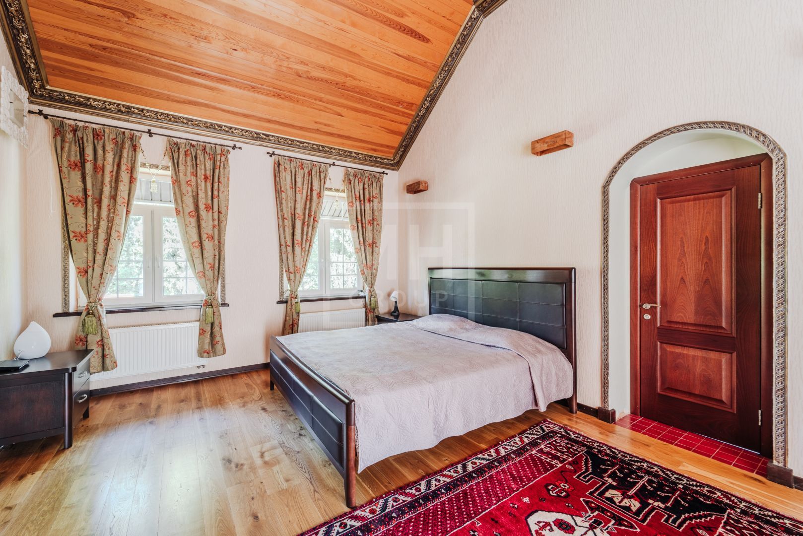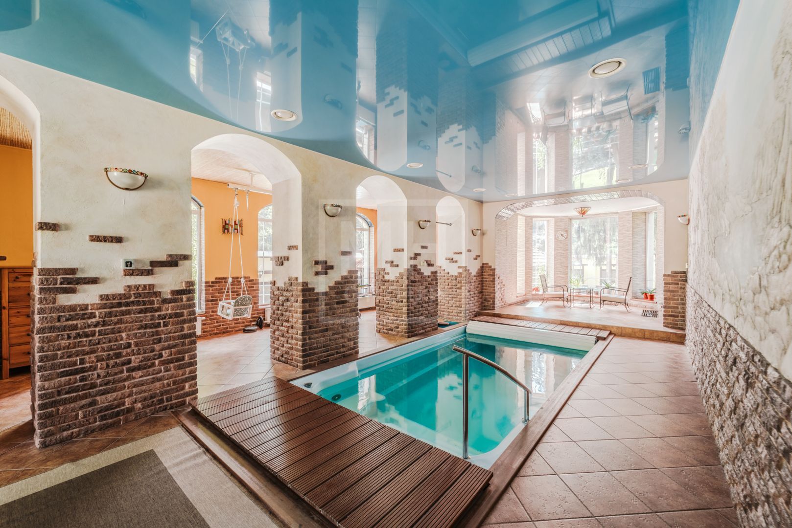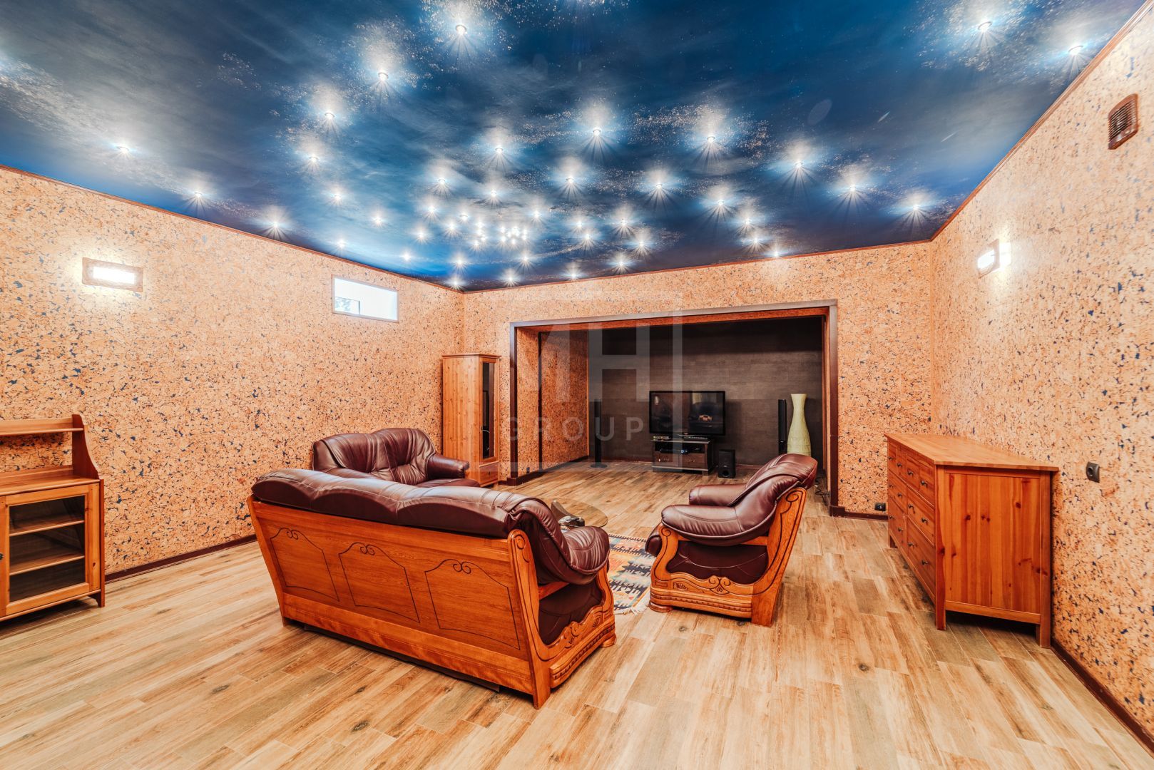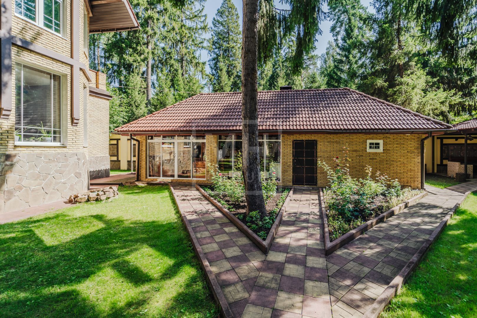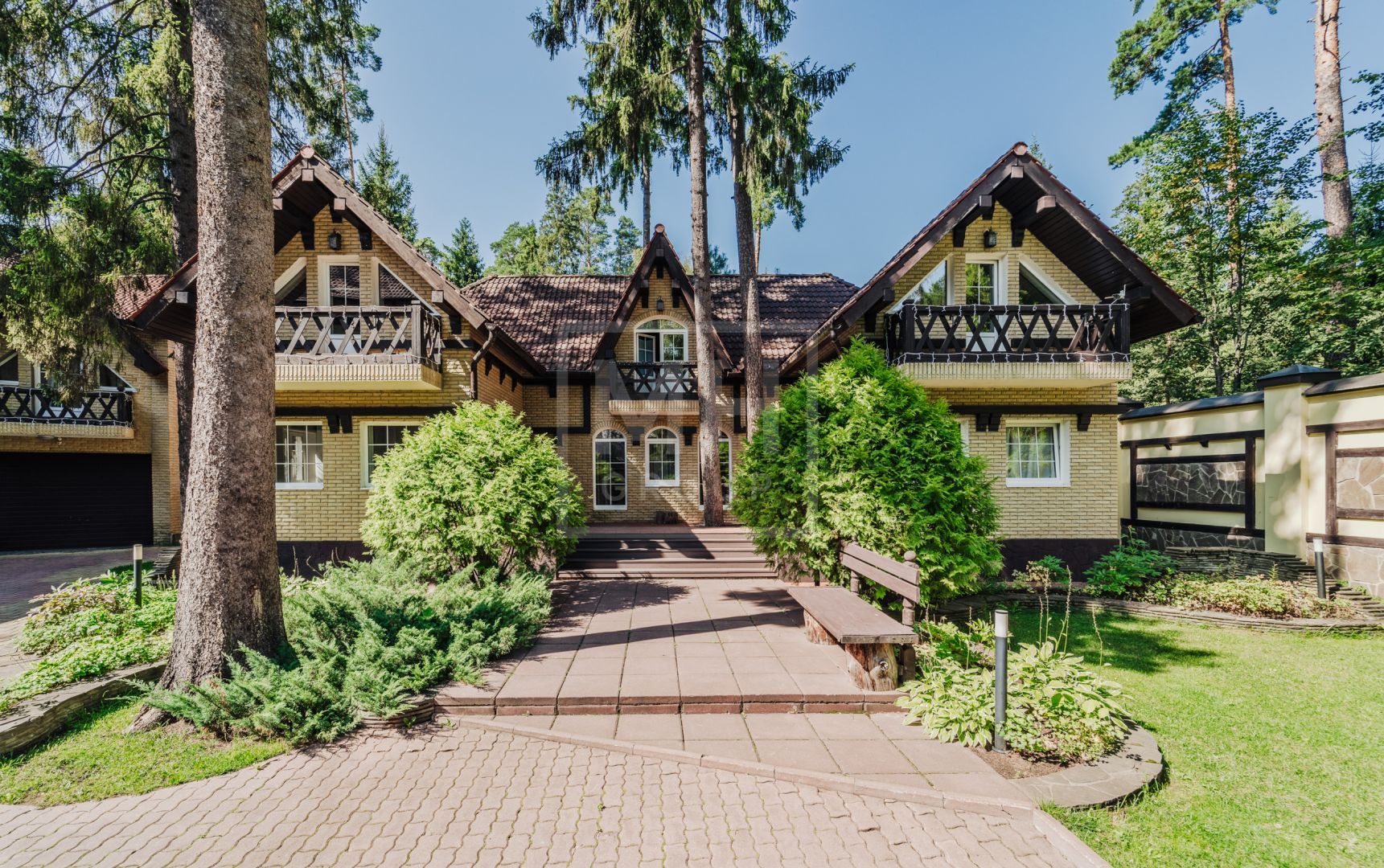 В доме продуманные планировки с просторными комнатами и санузлами при каждой спальне. В контуре дома оборудован бассейн, а также есть встроенный тёплый гараж для двух автомобилей. На территории участка, помимо основного дома, расположены: двухэтажный гостевой дом (1 этаж: холл, гостиная, кухня, санузел; 2 этаж: 4 спальни, 2 санузла), отапливаемая летняя кухня с зоной барбекю и летний гараж на два автомобиля. Все коммуникации центральные, дополнительно резервные скважина и септик.