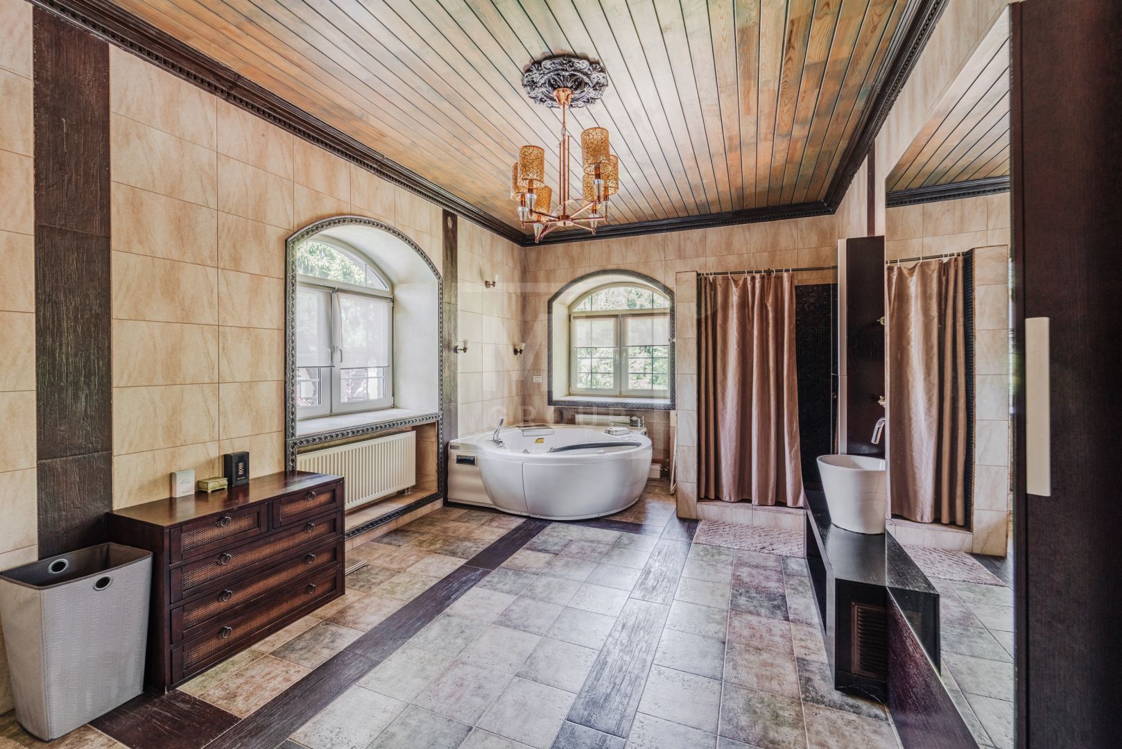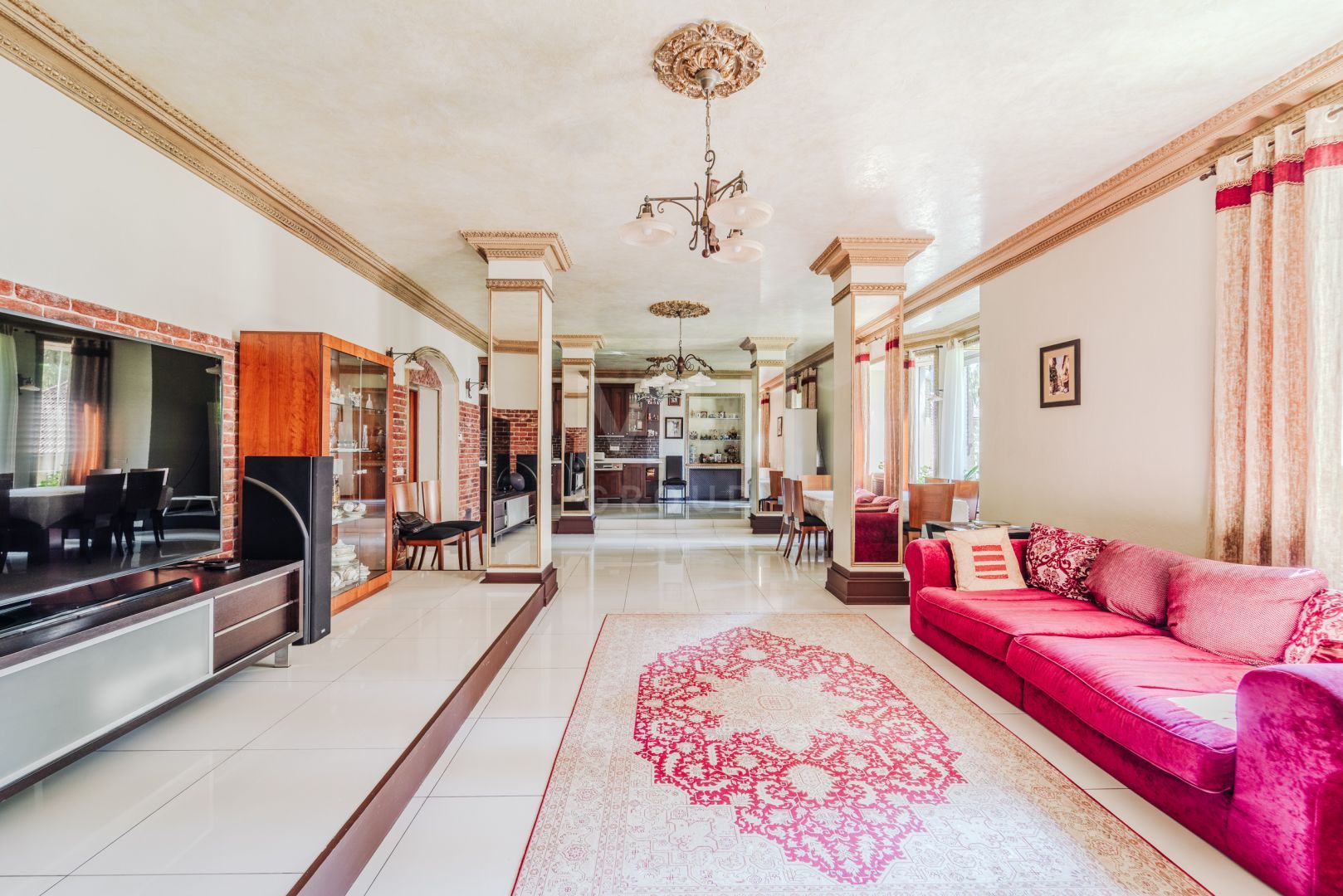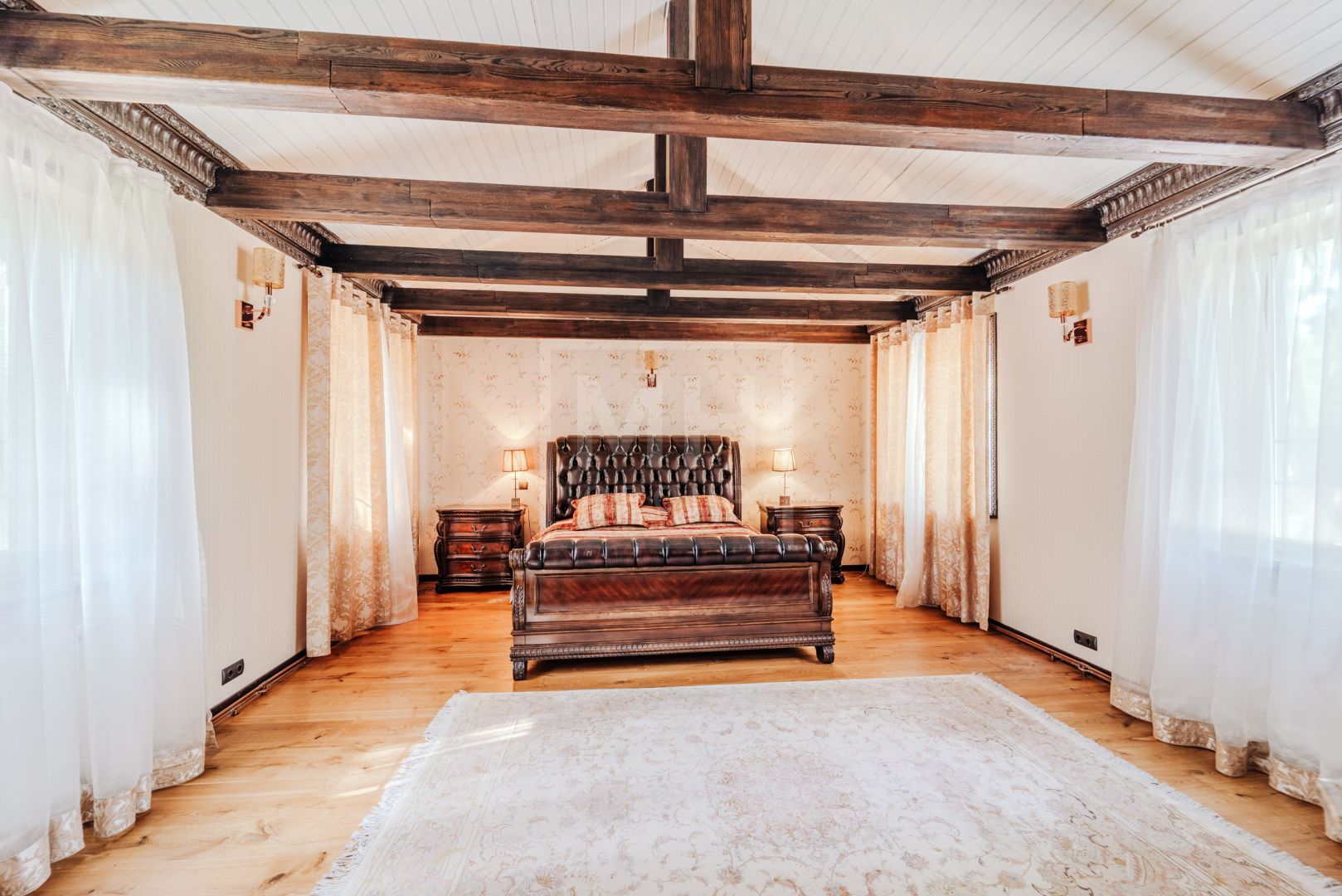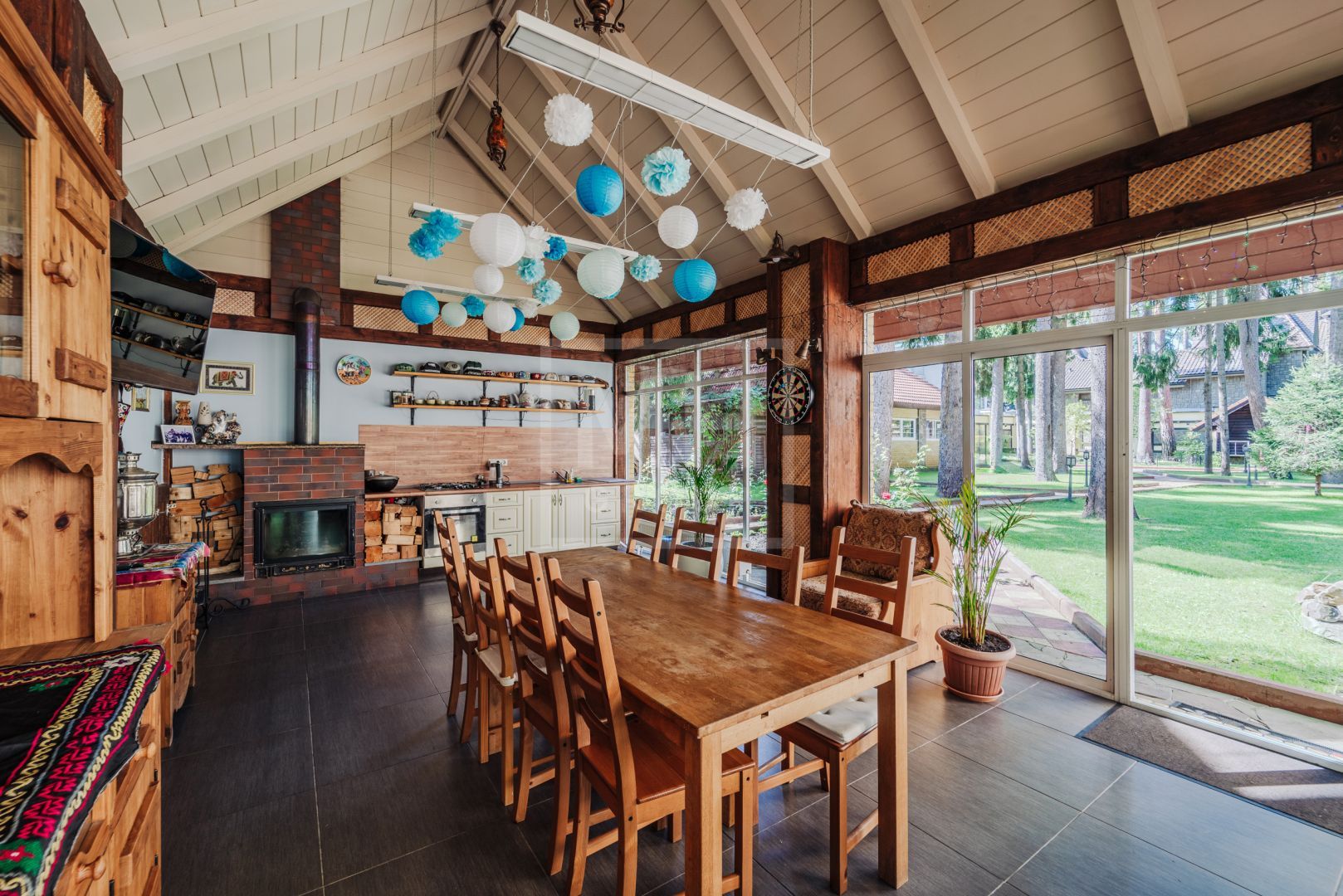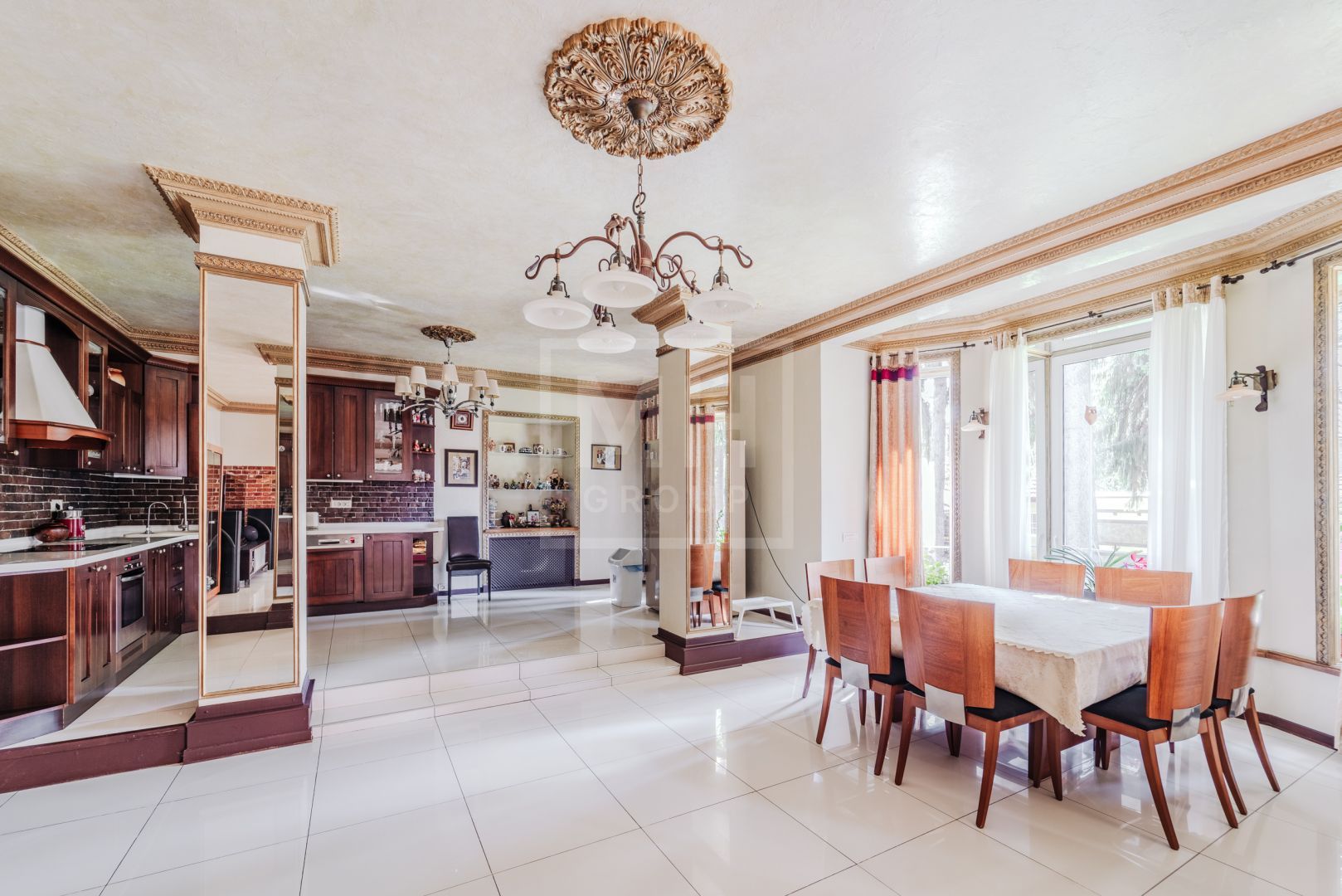 В доме продуманные планировки с просторными комнатами и санузлами при каждой спальне. В контуре дома оборудован бассейн, а также есть встроенный тёплый гараж для двух автомобилей. На территории участка, помимо основного дома, расположены: двухэтажный гостевой дом (1 этаж: холл, гостиная, кухня, санузел; 2 этаж: 4 спальни, 2 санузла), отапливаемая летняя кухня с зоной барбекю и летний гараж на два автомобиля. Все коммуникации центральные, дополнительно резервные скважина и септик.