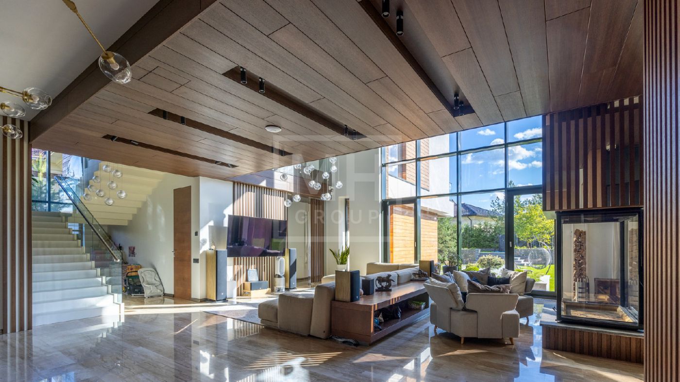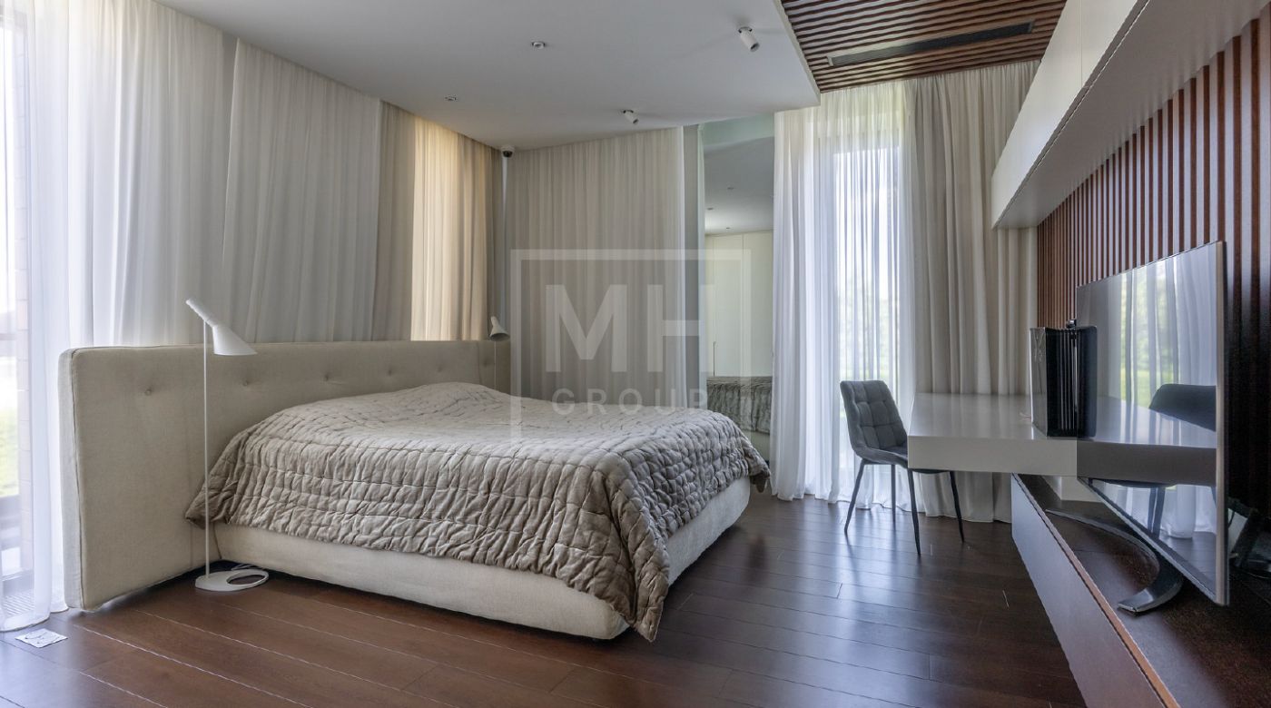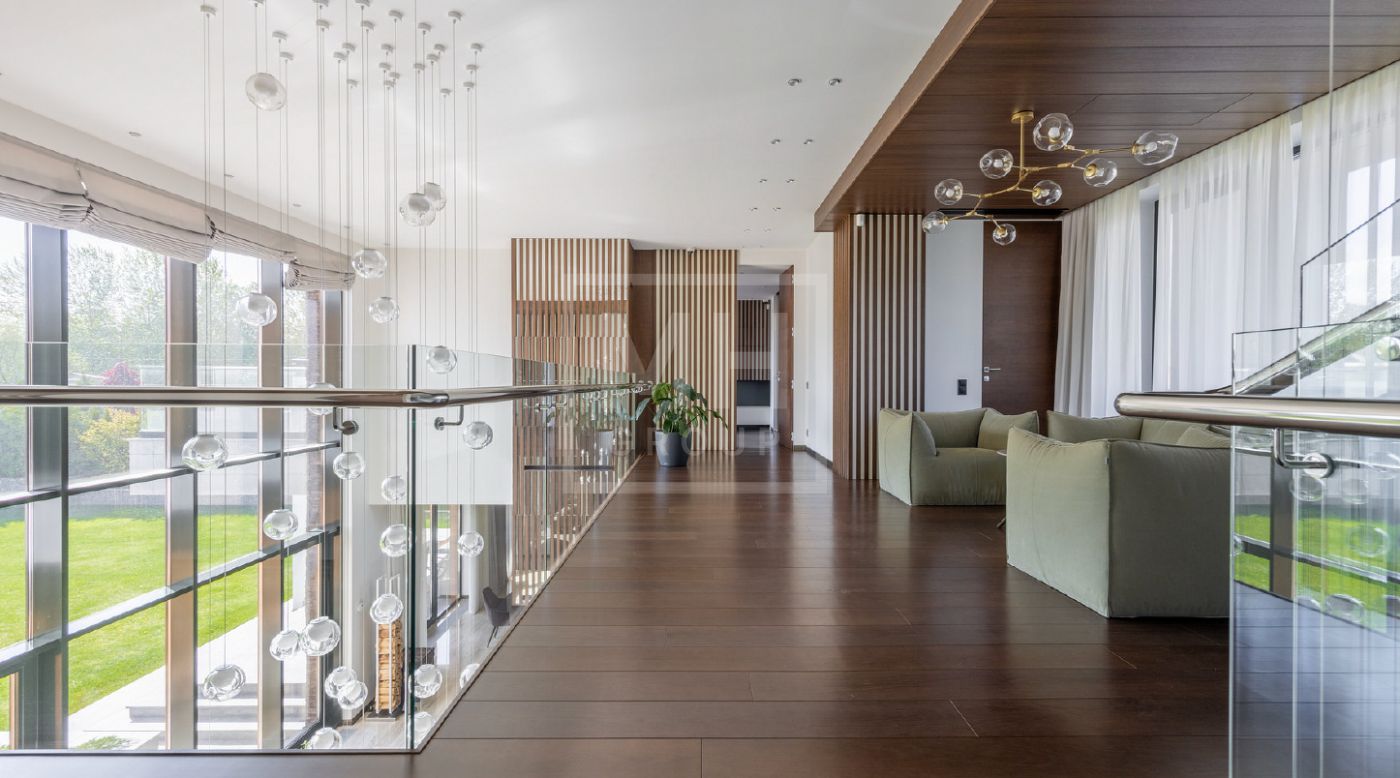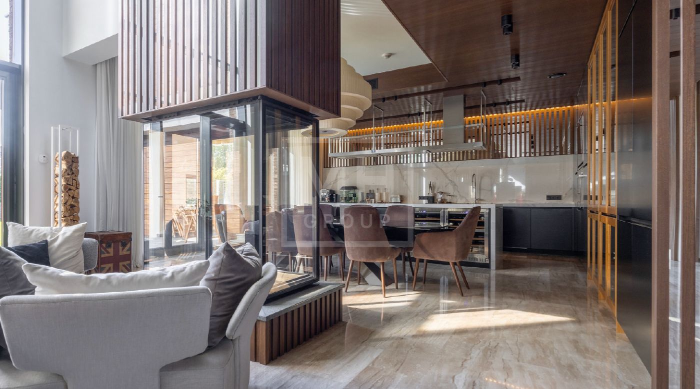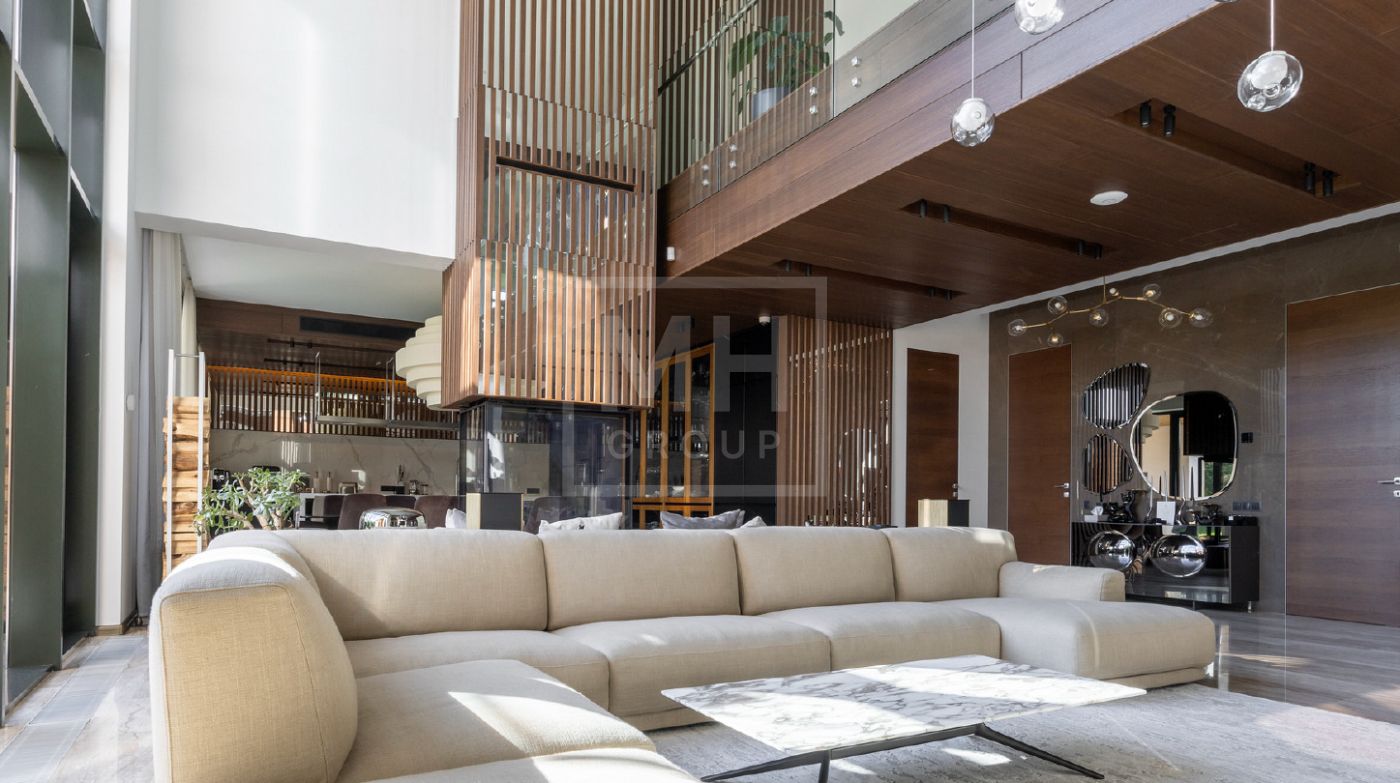 Элегантный современный дом площадью 550 м² расположен на участке18,5 соток в одном из самых престижных коттеджных посёлков Подмосковья — «Ренессанс Парк». Простор, прекрасный объем за счнт высоких потолков и второго света в зоне гостиной, высокий уровень инженерных решений, премиальная отделка и дизайнерская мебель делают этот дом уникальным предложением. Планировка продумана до мелочей: 5 спален, кабинет, просторная гостиная с вторым светом, кухня-столовая, большой камин с панорамной топкой, сауна, комната отдыха, купель/гидромассажная ванна на открытом воздухе, эксплуатируемая кровля с зоной BBQ. В доме установлено оборудование ведущих брендов. Вся мягкая мебель, обеденный стол и стулья выполнены итальянским брендом Poliform.Хорошая локация в поселке в непосредственной близости с парком и озером.