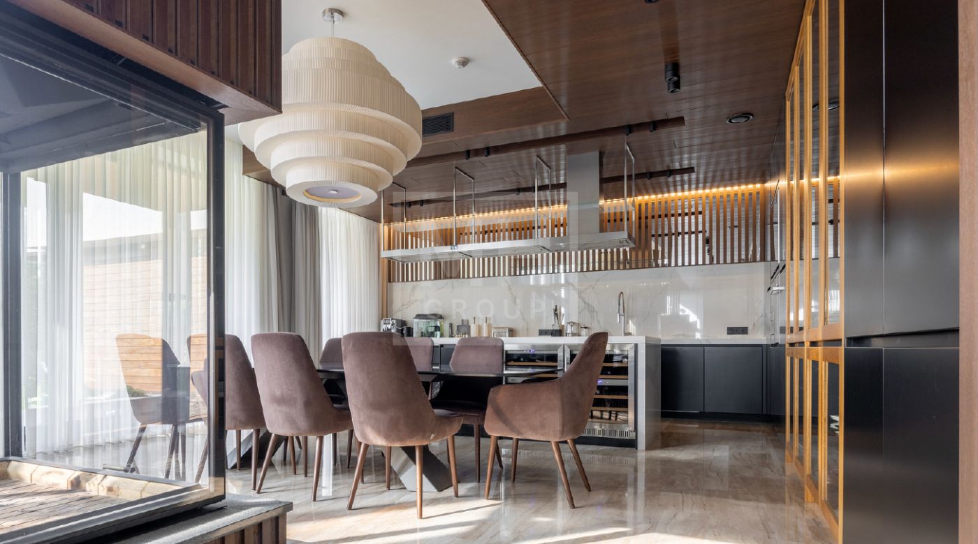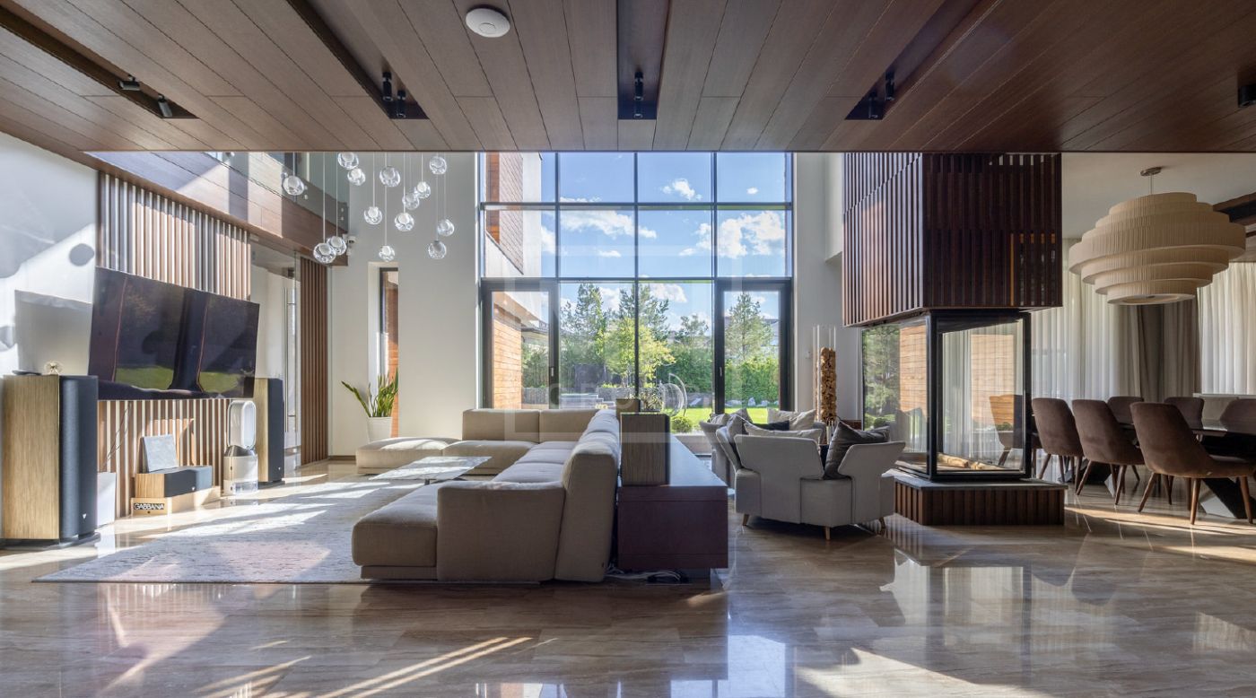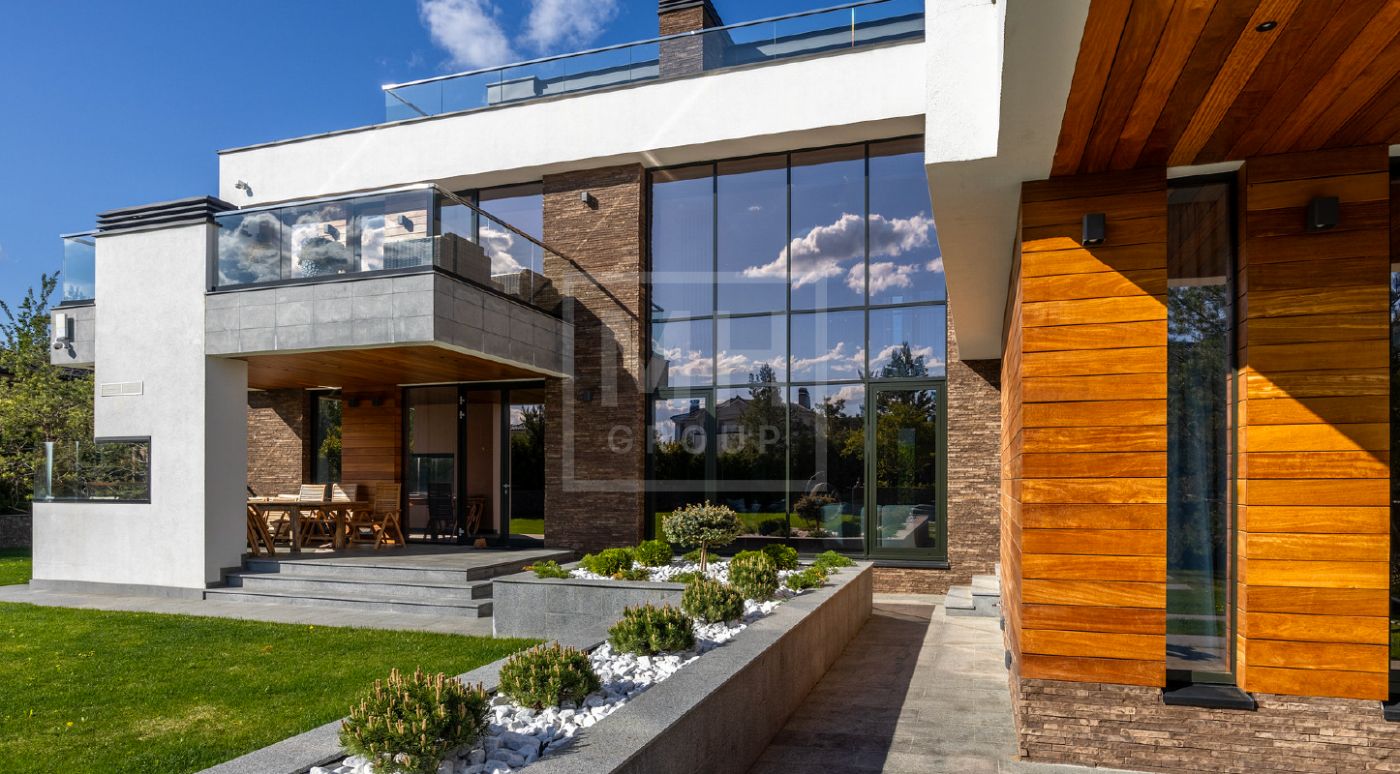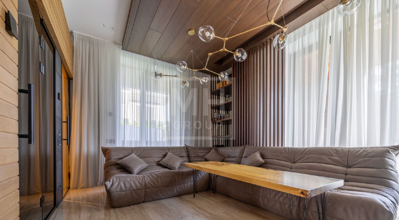 Элегантный современный дом площадью 550 м² расположен на участке18,5 соток в одном из самых престижных коттеджных посёлков Подмосковья — «Ренессанс Парк». Простор, прекрасный объем за счнт высоких потолков и второго света в зоне гостиной, высокий уровень инженерных решений, премиальная отделка и дизайнерская мебель делают этот дом уникальным предложением. Планировка продумана до мелочей: 5 спален, кабинет, просторная гостиная с вторым светом, кухня-столовая, большой камин с панорамной топкой, сауна, комната отдыха, купель/гидромассажная ванна на открытом воздухе, эксплуатируемая кровля с зоной BBQ. В доме установлено оборудование ведущих брендов. Вся мягкая мебель, обеденный стол и стулья выполнены итальянским брендом Poliform.Хорошая локация в поселке в непосредственной близости с парком и озером.