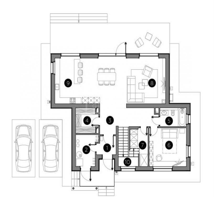Этаж 1: Прихожая, гардеробная, с/у, кухня-столовая, гостиная, кабинет/спальня, кладовая, котельная