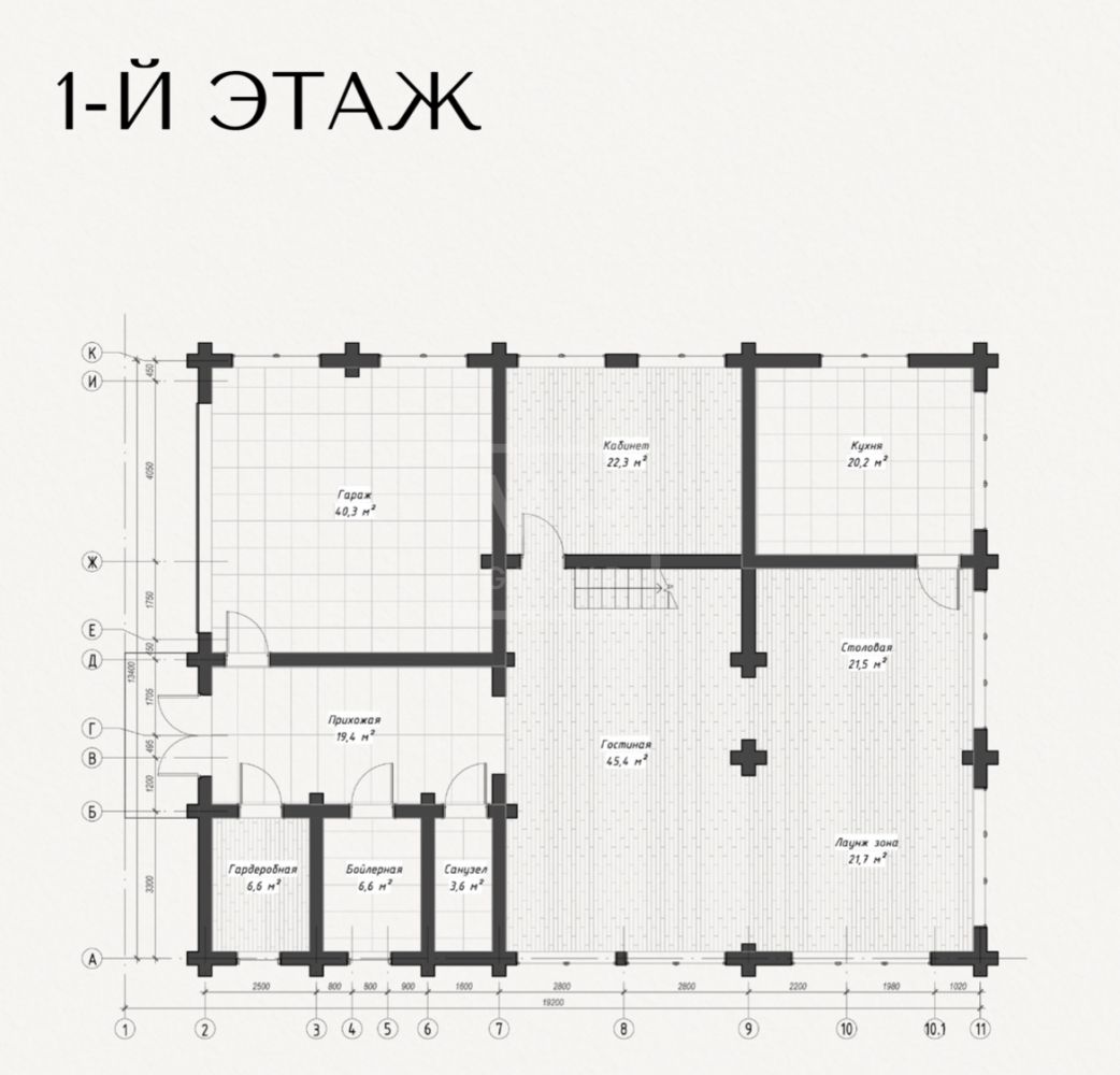 Этаж 1: Прихожая, гардеробная, гараж, кабинет, кухня, столовая, лаунж зона, гостиная, с/у, бойлерная.