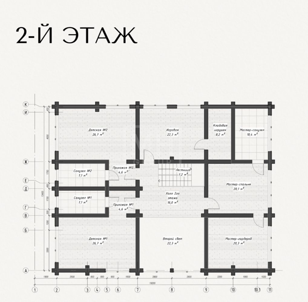 Этаж 2: мастер-спальня, гардероб, с/у, детская 1 ,с/у, детская 2 , с/у, игровая, кладовая игрушек.