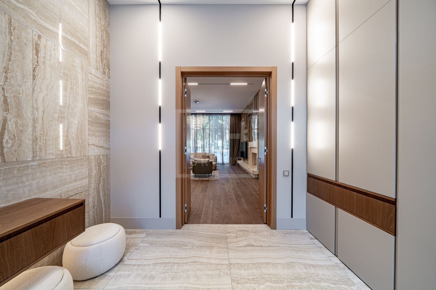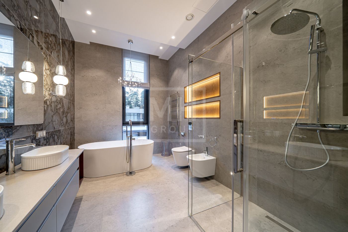 Дом подключëн к центральному водосна6шению, поселковой каналиѕации и магистральному гаѕу. 7становлен котëл Buderus (35 кBт), тëплые водяные полы в санузлах, защита от протечек. Электричество — 15 кBт с возмошностью увеличения. B дом заведен оптико-волоконный ка6ель.