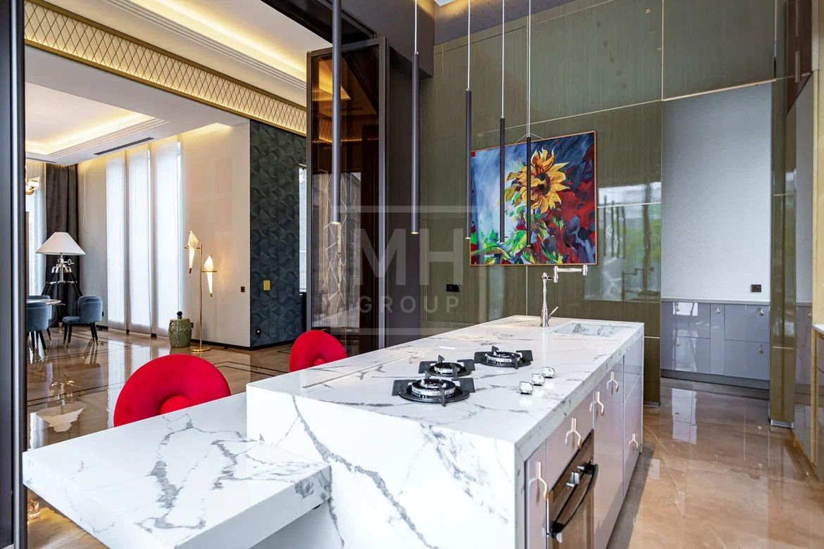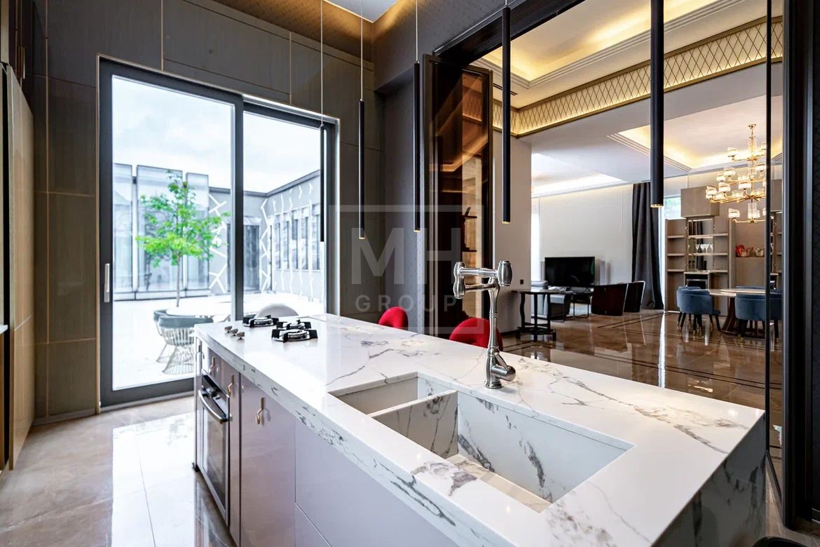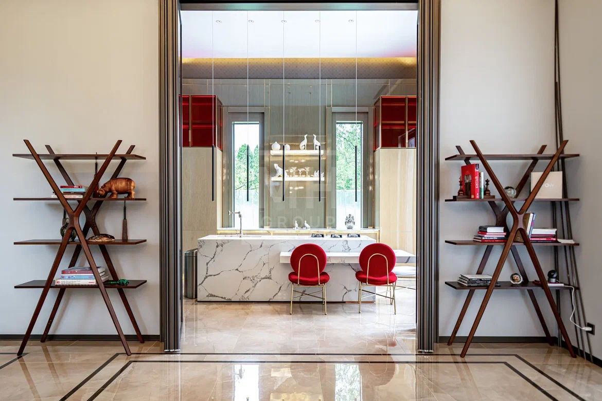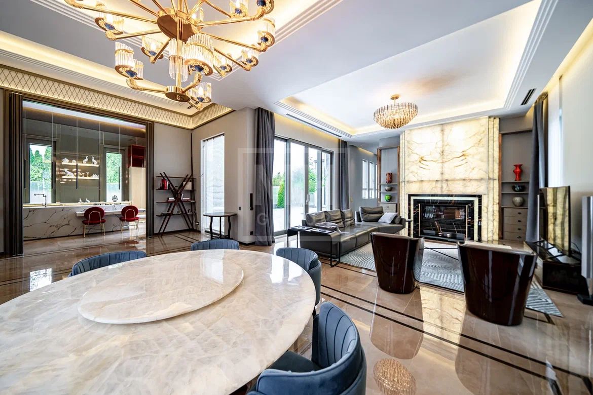 На продажу представлен, стильный одноэтажный дом в охраняемом коттеджном поселке Усово Плюс. Площадь дома составляет 403 кв м. Участок 8.5 соток.Грамотно продуманная планировка создает гармоничное пространство, где каждая деталь способствует удобству. Интерьер дома отличается безупречным стилем. Безрамное узкое остекление создает эффект визуального расширения пространства и увеличения светопроницаемости, что позволяет в любом уголке дома наслаждаться солнечным светом. Уютная гостинная с камином, в отделке которого использовался оникс с подсветкой. Современная обустроенная кухня с отдельной комнатой для хранения и выходом на террасу. Фасад дома выполнен из серого мрамора, что придает дому особую красоту и изысканность. В доме сделана приточно вытяжная вентиляция с рекуператором. Проведено канальное кондиционирование. Полы с подогревом по всему дому. Просторный гараж на 3 машины. Прямой выезд на платную дорогу через Красногорское Шоссе: 20-25 мин до Москва-сити.