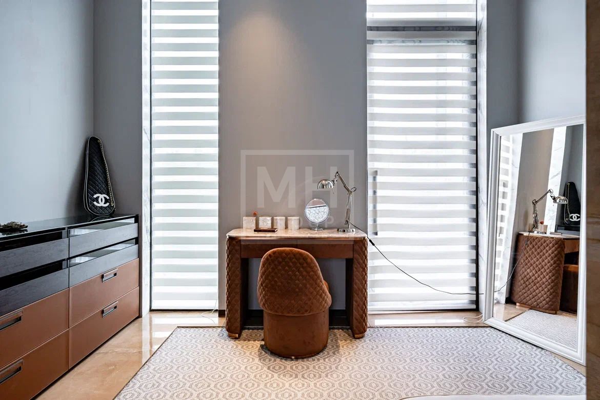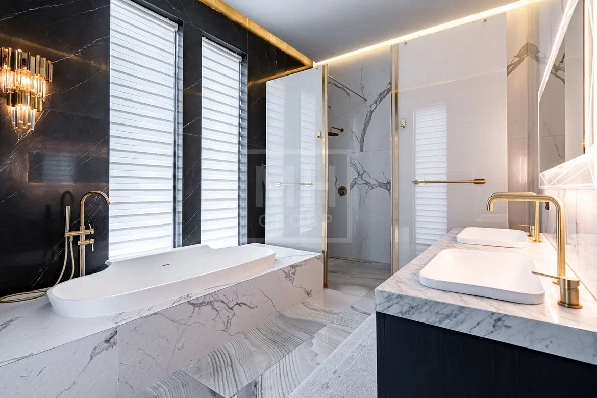 Этаж 1: Гостиная с камином, в отделке которого использовался оникс с подсветкой. Современная обустроенная кухня с отдельной комнатой для хранения и выходом на террасу 3 спальни плюс 1 кабинет 3 сан узла, просторная постирочная, гардеробная при входе в дом.