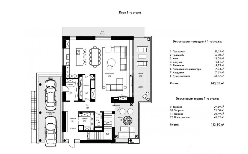 Этаж 1: Прихожая, кухня-столовая-гостинная с камином, с/у, кладовка, гардеробная, выход на террасу