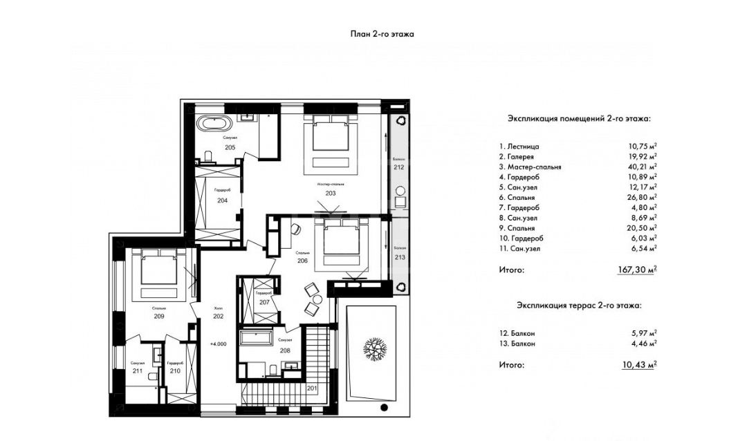 Этаж 2: Мастер-спальня с с/у и гардеробной, 2 спальни с с/у и гардеробными