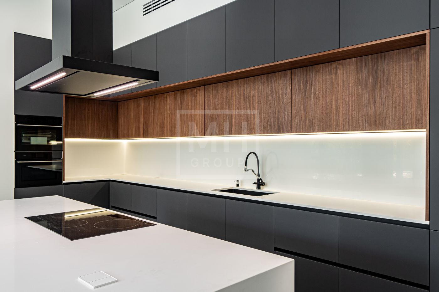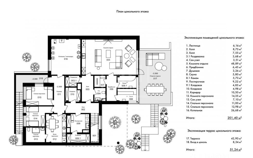 Цоколь: Нижний этаж - 2 спальни персонала, кухня, су, постирочная , кладовка. спа-зона с кухней , хамам и сауна со стеклом в пол и видом на участок.