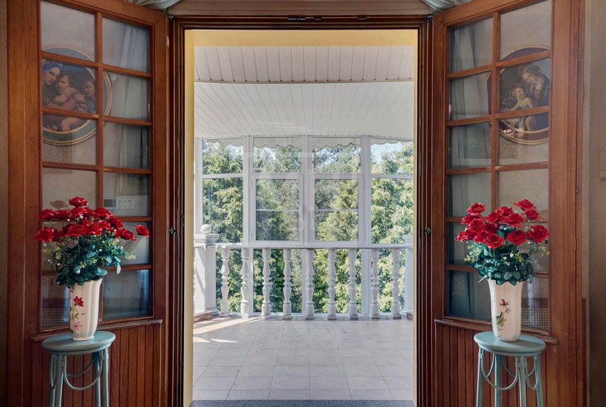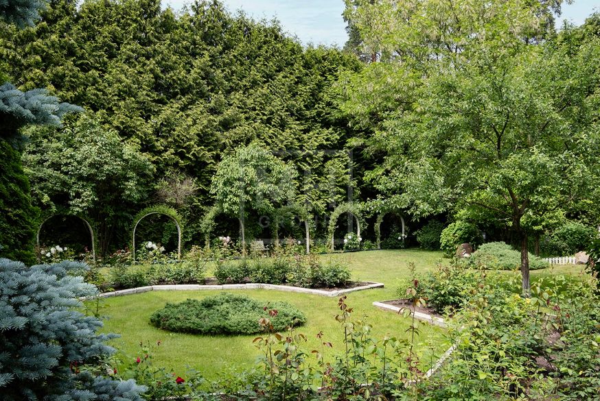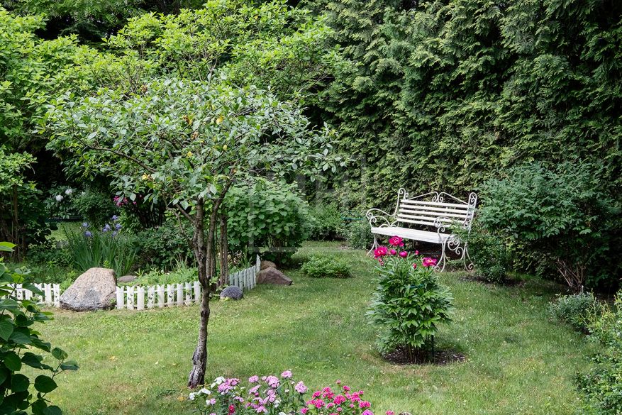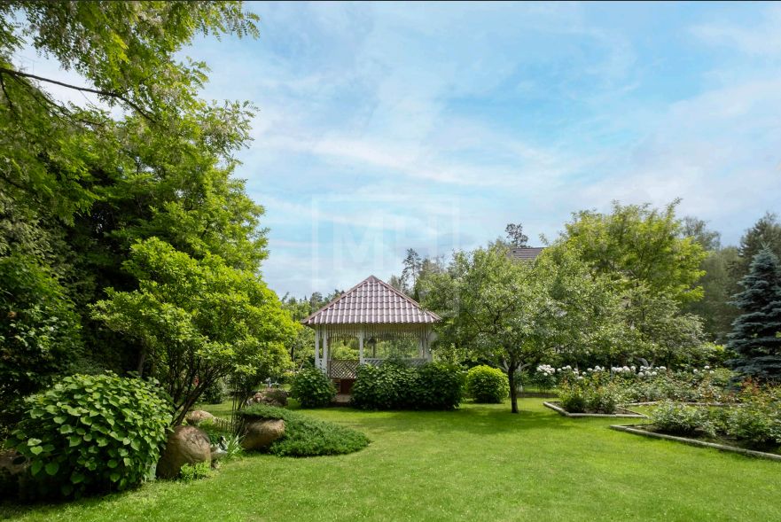 На участке выполнен ландшафтный дизайн, по периметру растут пятиметровые туи. Сад с плодовыми деревьями, клумбы с розами, акации никого не оставят равнодушным.