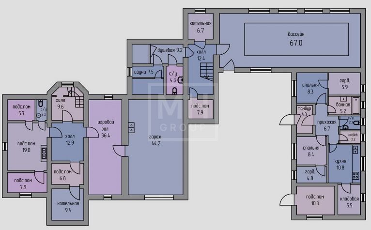 Этаж 1: Бассейн, гараж, холл, котельная, с/у, кладовая, душевая, сауна, спальня, гардеробная, тамбур, ванная, прихожая, с/у, кладовая, спальня, кухня, гардеробная, кухня-столовая, холл, прихожая гостиная, ванная, веранда, тренажерный зал, гардеробная, ванная