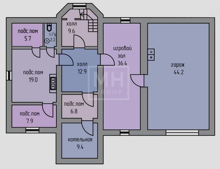Цоколь: Гараж, холл, четыре подсобных помещения, с/у, игровой зал