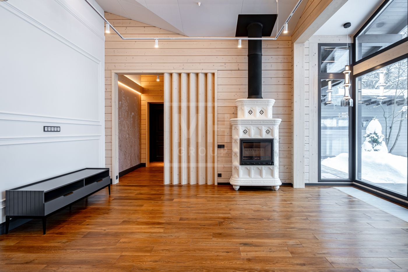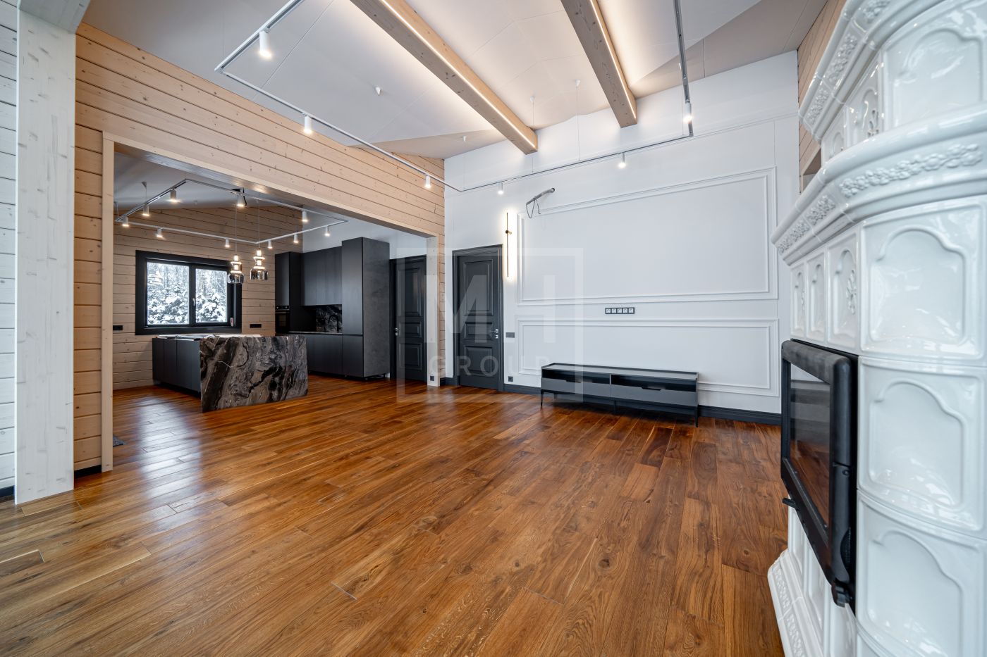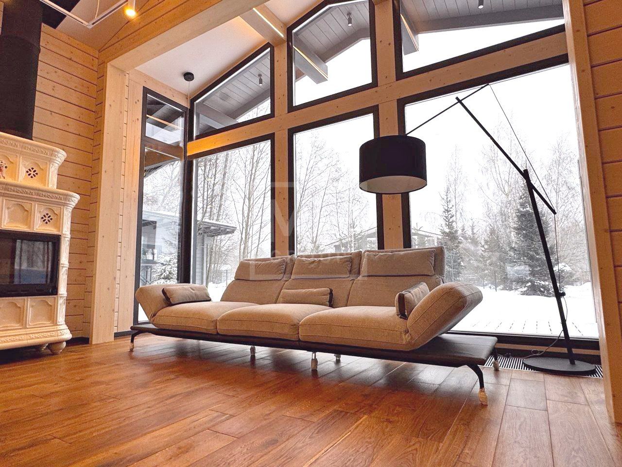В доме несколько сценариев освещения от культового итальянского дизайнерского бренда FLOS -естественный мягкий свет подчеркивает все достоинства материалов, включая их высокое качество, а также элегантно акцентирует внимание на сочетаниях фактур. Изразцовый камин ванильного цвета создаёт в гостиной уют и дарит ощущение тепла.