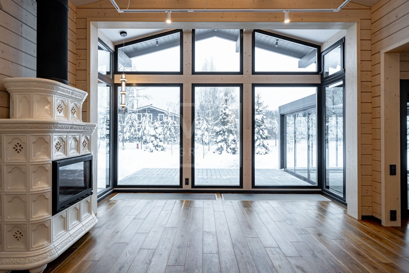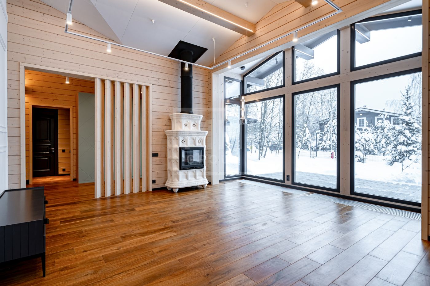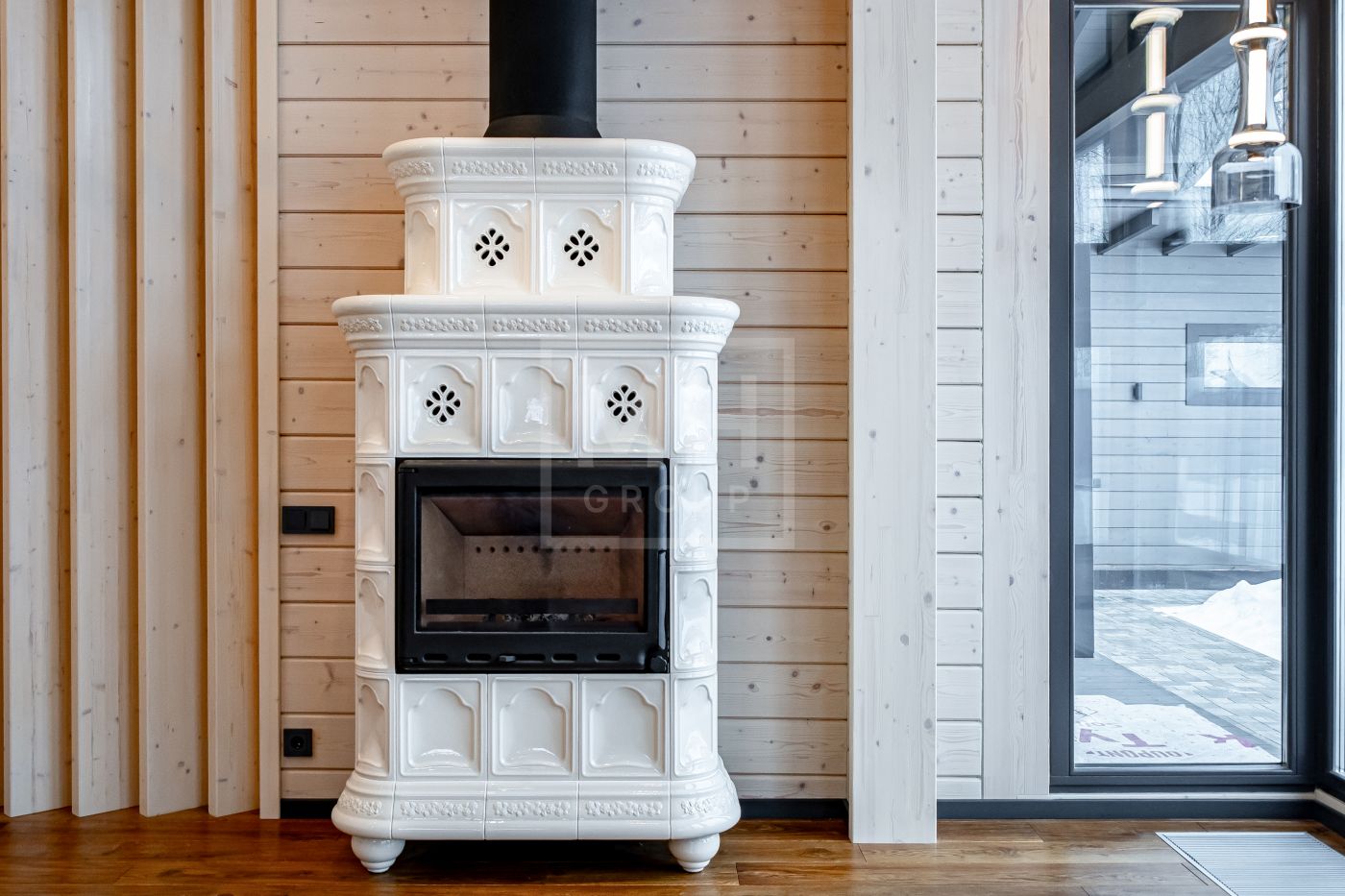 В доме несколько сценариев освещения от культового итальянского дизайнерского бренда FLOS -естественный мягкий свет подчеркивает все достоинства материалов, включая их высокое качество, а также элегантно акцентирует внимание на сочетаниях фактур. Изразцовый камин ванильного цвета создаёт в гостиной уют и дарит ощущение тепла.