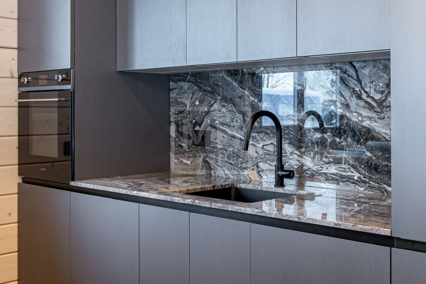 Итальянская кухня ZESAR, столешница, фартук, остров из итальянского мрамора Арабескато Оробико, бытовая