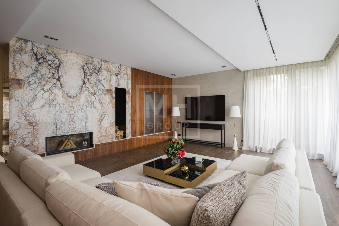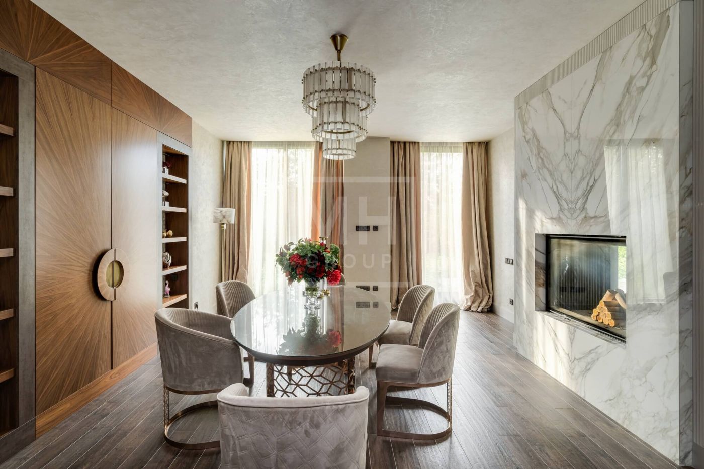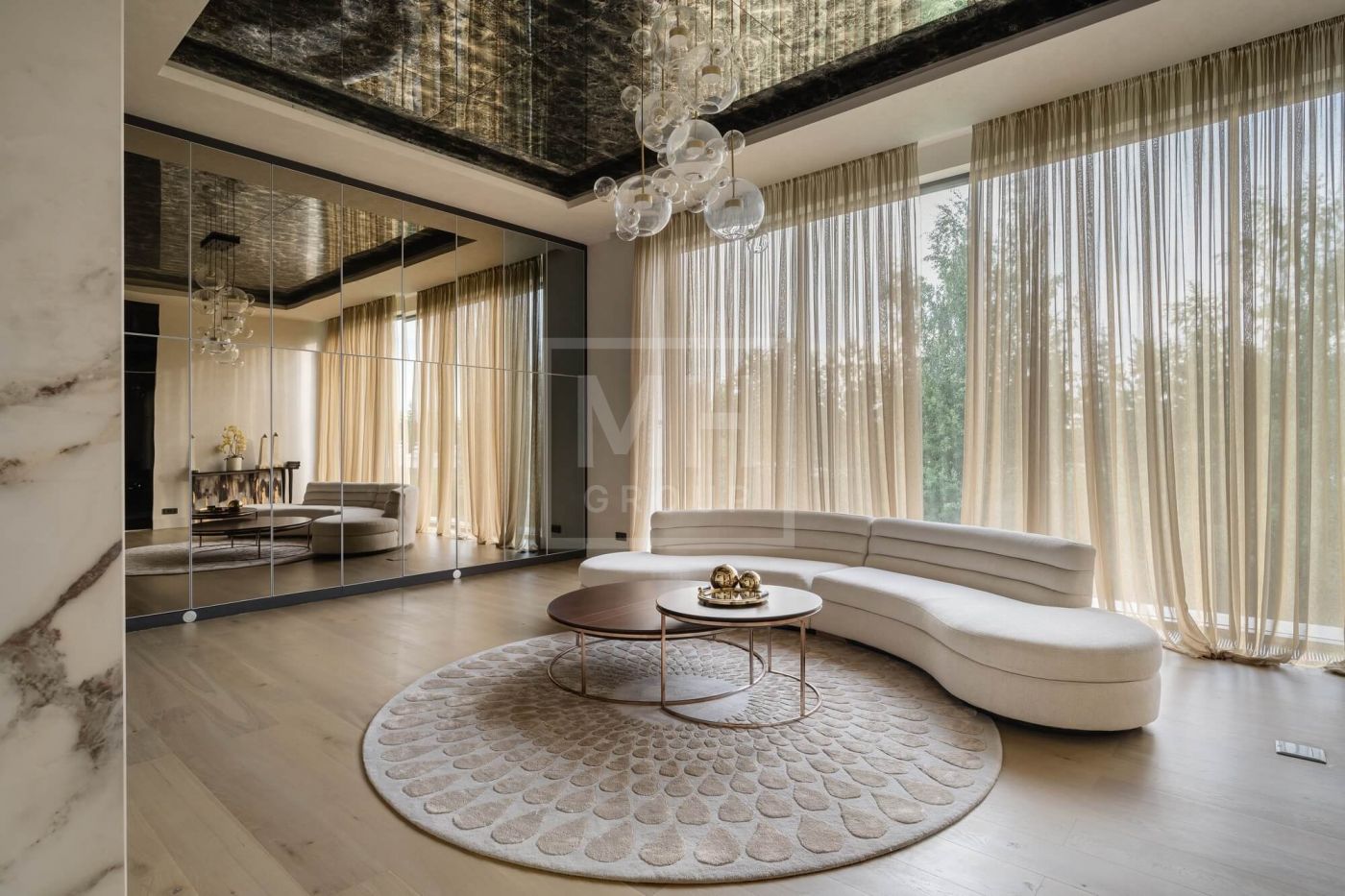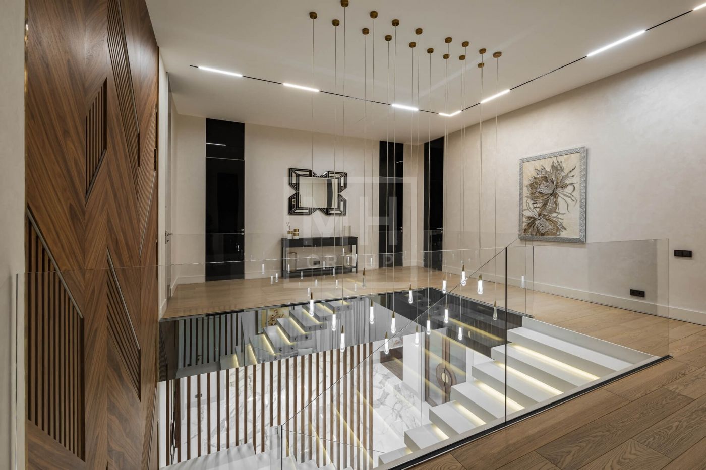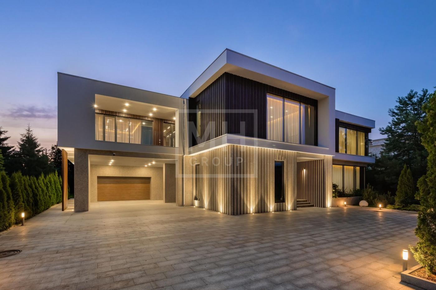 К продаже представлен стильный новый дом 847 кв.м на большом зеленом участке 25 соток в КП Миллениум парк, одном из самых престижных поселков Новорижского шоссе с самой широкой линейкой инфраструктурных объектов. В доме: 5 спален с собственными удобствами, две просторные гостиные, изолированная столовая, кухня с окном вдоль всей рабочей зоны, барбекю зона в контуре дома, парадная лестница авторского дизайна, хаммам, комната для персонала, гараж на 2 м/м, котельная и постирочная . Функционал дома соответствует двухуровневому пентхаусу, приземленному на участок. Особенности: современная архитектура, светлый интерьер, 2 дровяных камина (один из них - двусторонний) и один - на биотопливе, умная мойка на кухне, эксклюзивные межкомнатные двери (массив ясеня), премиальная техника, высокие потолки (на 1 этаже - до 3 м, на втором - 3,45). Уютный зеленый участок, насыщенный ландшафтным дизайном. Организовано освещение и система автополива. Перед въездом есть парковка под навесом на 2 м/м.