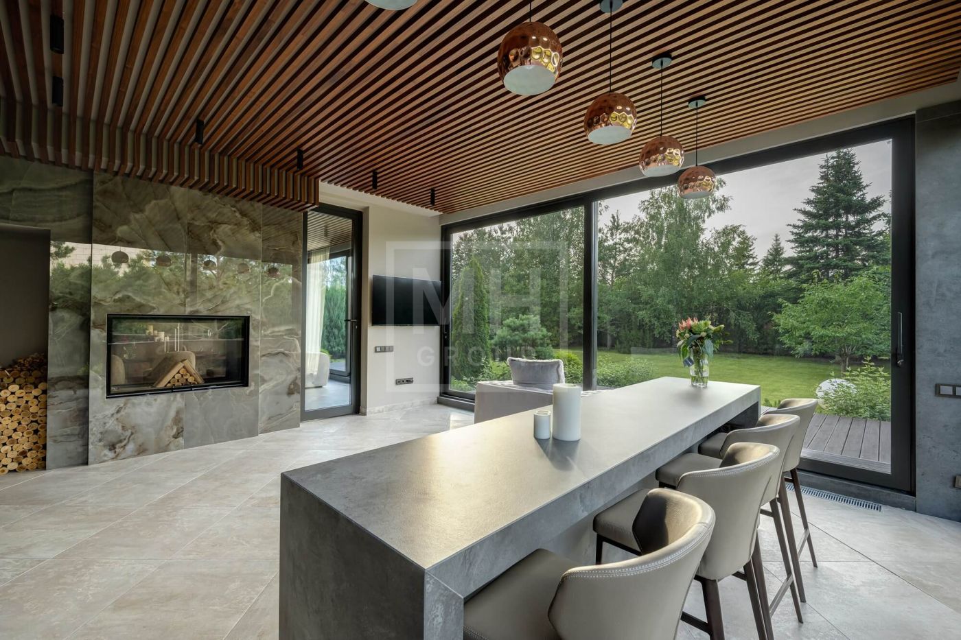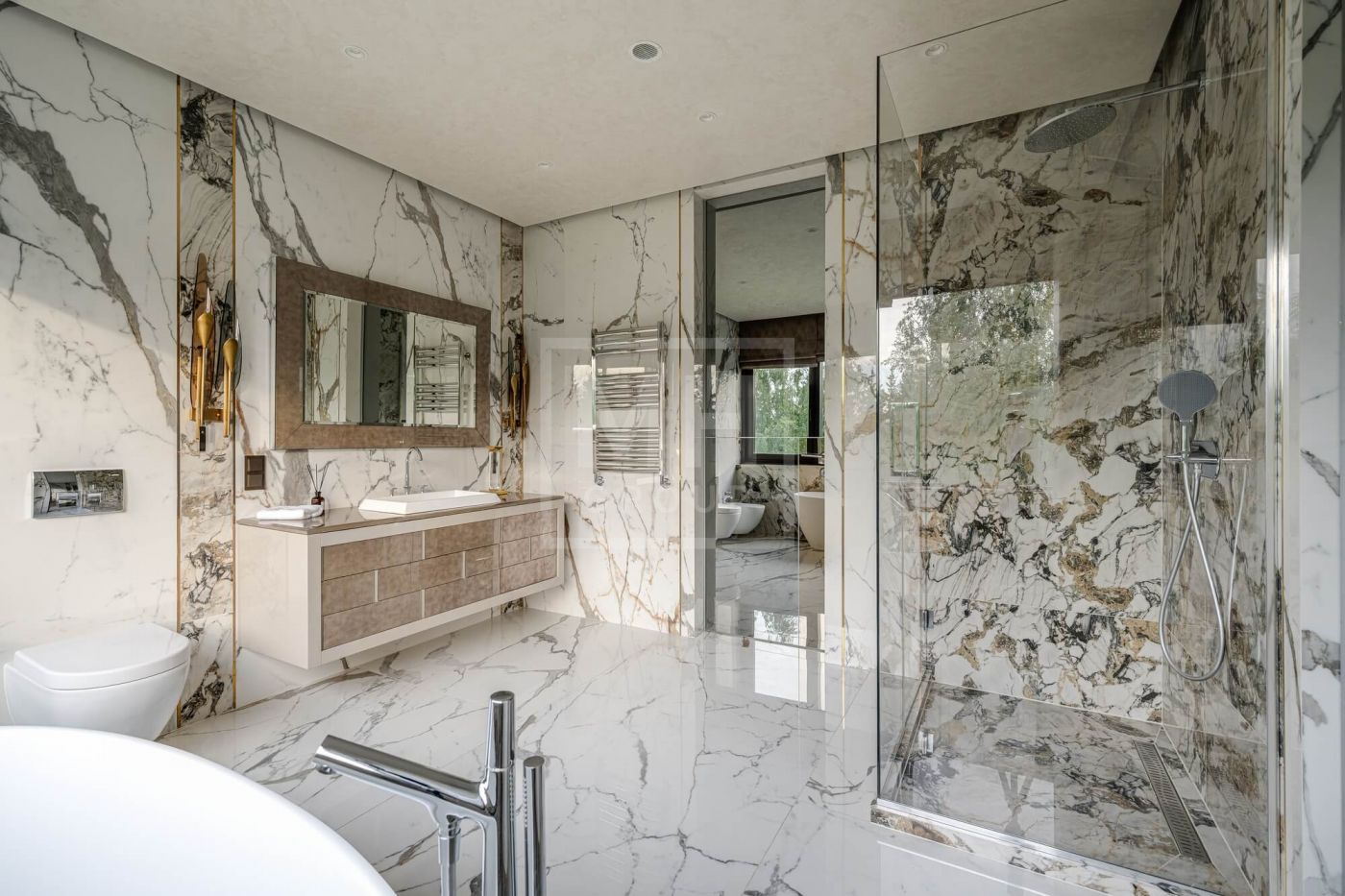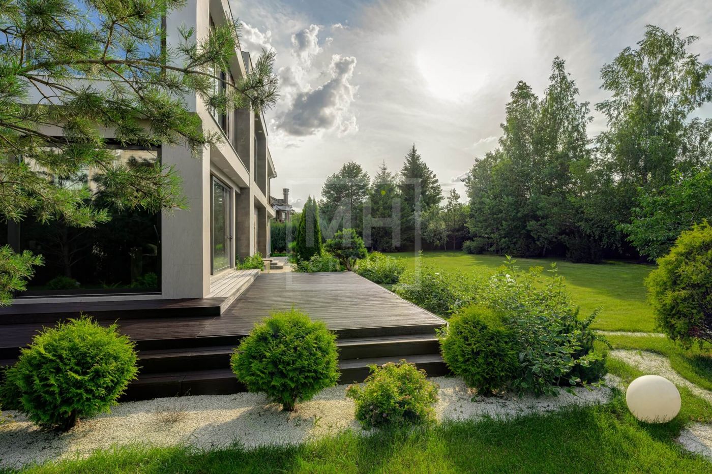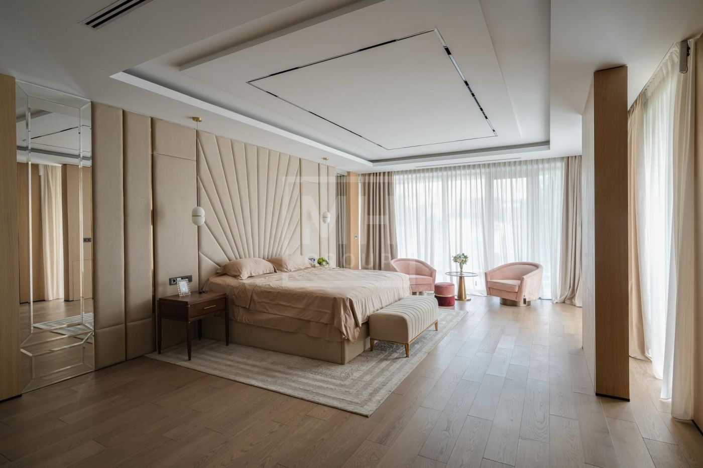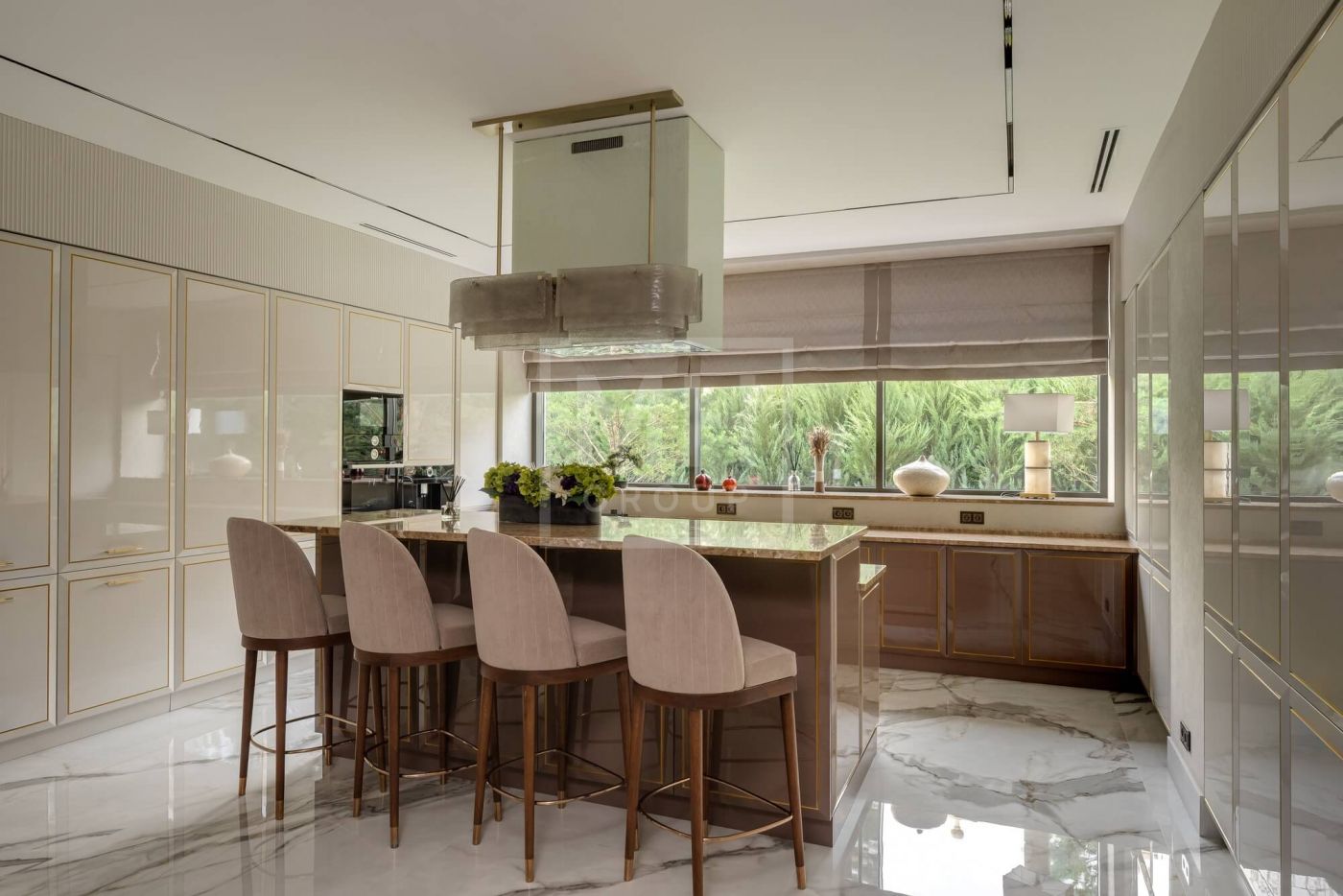 К продаже представлен стильный новый дом 847 кв.м на большом зеленом участке 25 соток в КП Миллениум парк, одном из самых престижных поселков Новорижского шоссе с самой широкой линейкой инфраструктурных объектов. В доме: 5 спален с собственными удобствами, две просторные гостиные, изолированная столовая, кухня с окном вдоль всей рабочей зоны, барбекю зона в контуре дома, парадная лестница авторского дизайна, хаммам, комната для персонала, гараж на 2 м/м, котельная и постирочная . Функционал дома соответствует двухуровневому пентхаусу, приземленному на участок. Особенности: современная архитектура, светлый интерьер, 2 дровяных камина (один из них - двусторонний) и один - на биотопливе, умная мойка на кухне, эксклюзивные межкомнатные двери (массив ясеня), премиальная техника, высокие потолки (на 1 этаже - до 3 м, на втором - 3,45). Уютный зеленый участок, насыщенный ландшафтным дизайном. Организовано освещение и система автополива. Перед въездом есть парковка под навесом на 2 м/м.