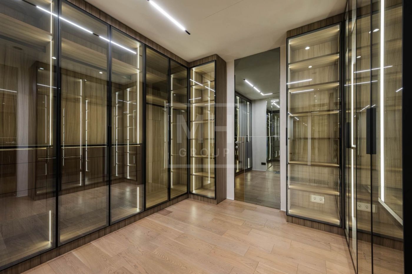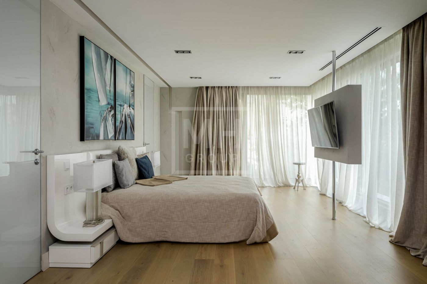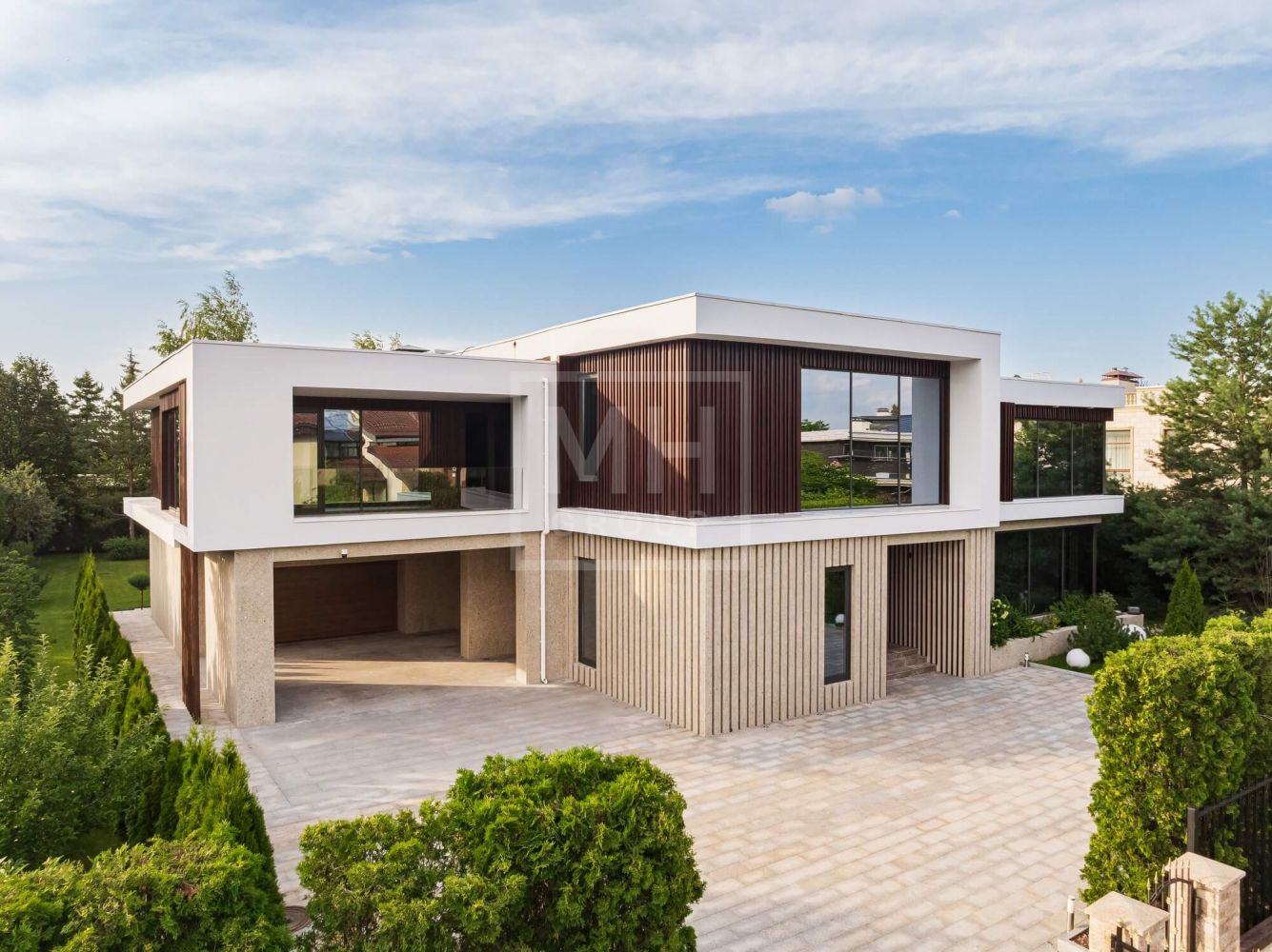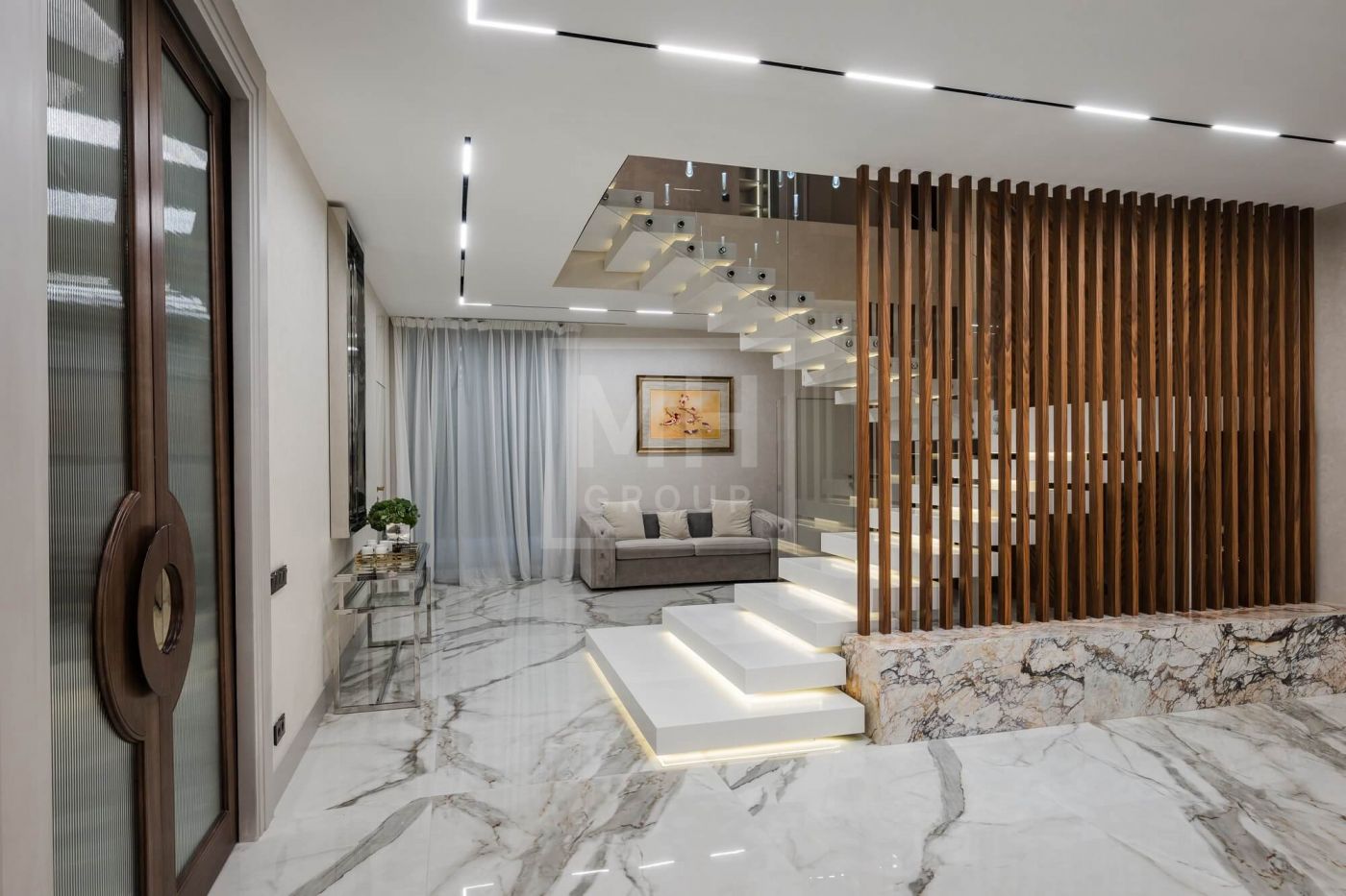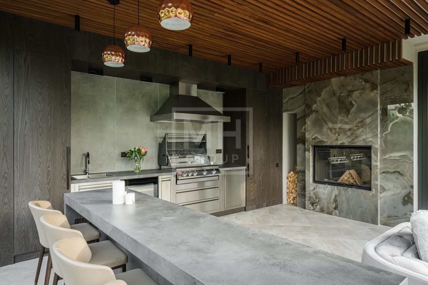 К продаже представлен стильный новый дом 847 кв.м на большом зеленом участке 25 соток в КП Миллениум парк, одном из самых престижных поселков Новорижского шоссе с самой широкой линейкой инфраструктурных объектов. В доме: 5 спален с собственными удобствами, две просторные гостиные, изолированная столовая, кухня с окном вдоль всей рабочей зоны, барбекю зона в контуре дома, парадная лестница авторского дизайна, хаммам, комната для персонала, гараж на 2 м/м, котельная и постирочная . Функционал дома соответствует двухуровневому пентхаусу, приземленному на участок. Особенности: современная архитектура, светлый интерьер, 2 дровяных камина (один из них - двусторонний) и один - на биотопливе, умная мойка на кухне, эксклюзивные межкомнатные двери (массив ясеня), премиальная техника, высокие потолки (на 1 этаже - до 3 м, на втором - 3,45). Уютный зеленый участок, насыщенный ландшафтным дизайном. Организовано освещение и система автополива. Перед въездом есть парковка под навесом на 2 м/м.
