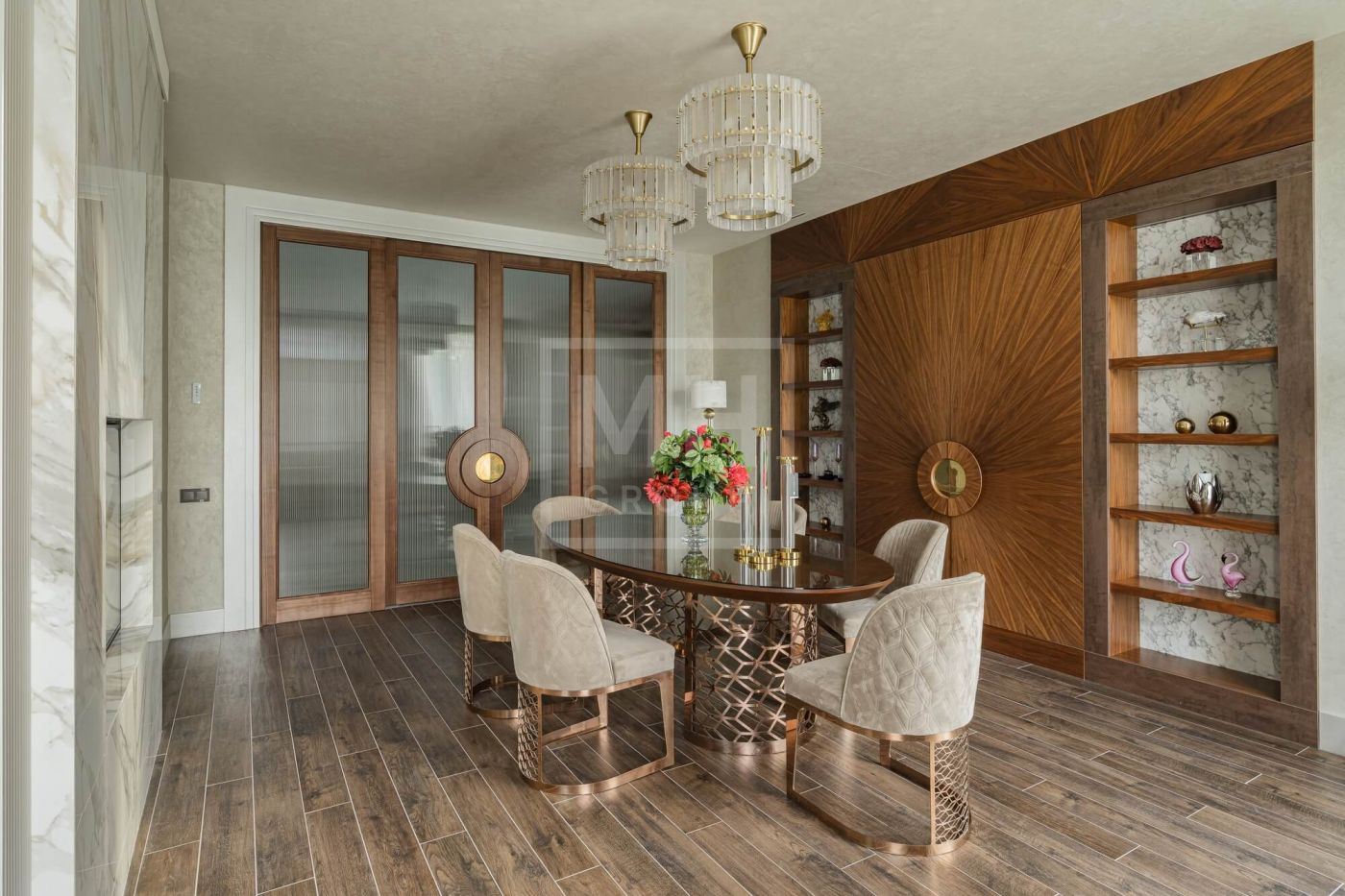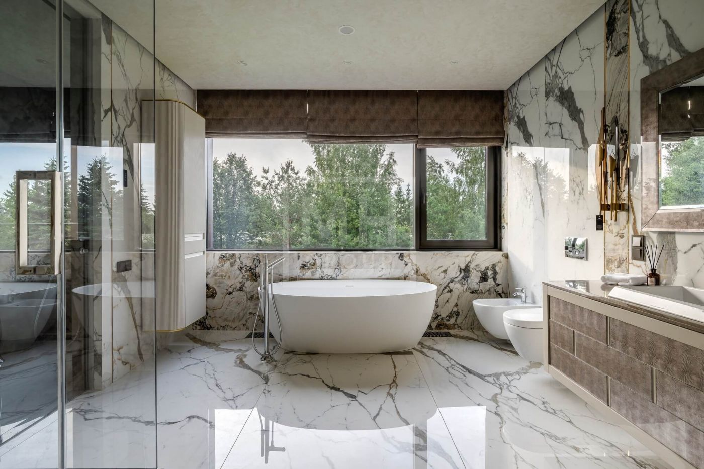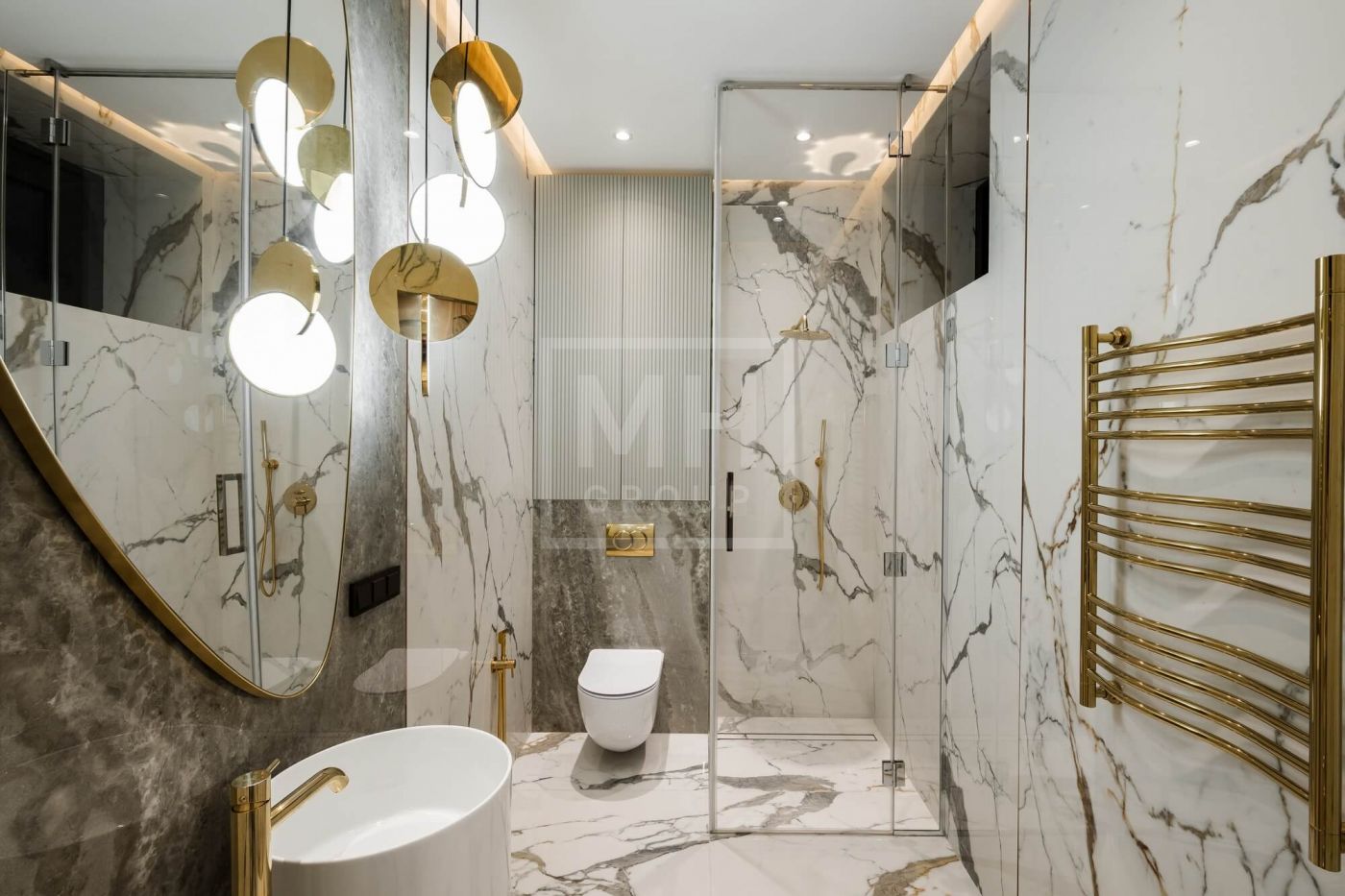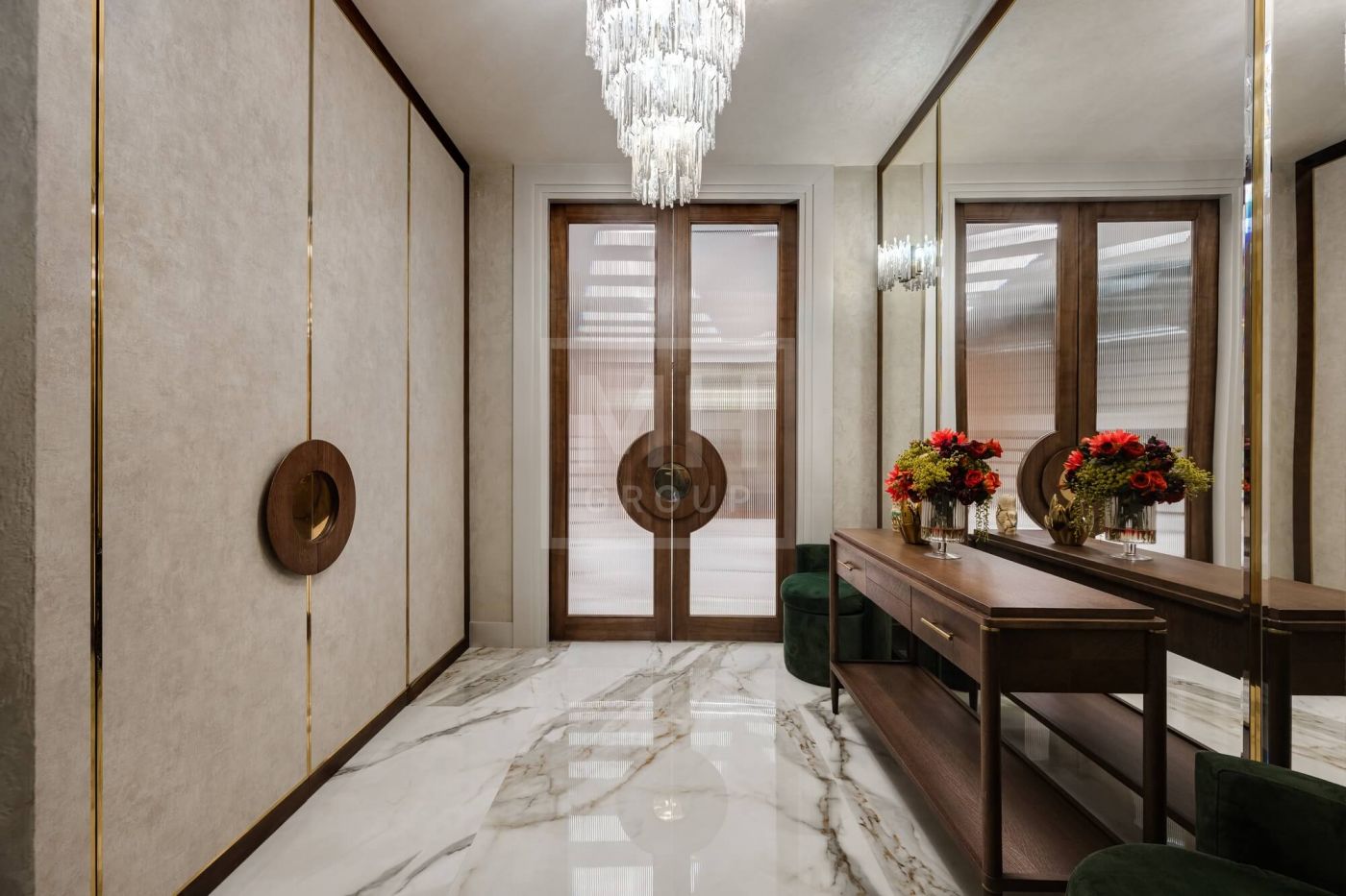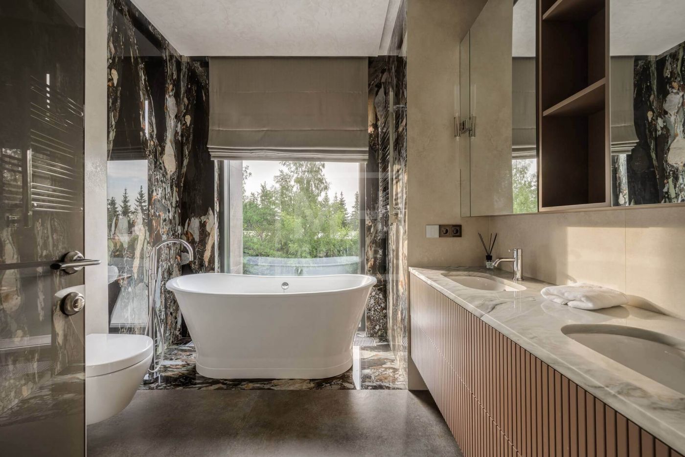 К продаже представлен стильный новый дом 847 кв.м на большом зеленом участке 25 соток в КП Миллениум парк, одном из самых престижных поселков Новорижского шоссе с самой широкой линейкой инфраструктурных объектов. В доме: 5 спален с собственными удобствами, две просторные гостиные, изолированная столовая, кухня с окном вдоль всей рабочей зоны, барбекю зона в контуре дома, парадная лестница авторского дизайна, хаммам, комната для персонала, гараж на 2 м/м, котельная и постирочная . Функционал дома соответствует двухуровневому пентхаусу, приземленному на участок. Особенности: современная архитектура, светлый интерьер, 2 дровяных камина (один из них - двусторонний) и один - на биотопливе, умная мойка на кухне, эксклюзивные межкомнатные двери (массив ясеня), премиальная техника, высокие потолки (на 1 этаже - до 3 м, на втором - 3,45). Уютный зеленый участок, насыщенный ландшафтным дизайном. Организовано освещение и система автополива. Перед въездом есть парковка под навесом на 2 м/м.