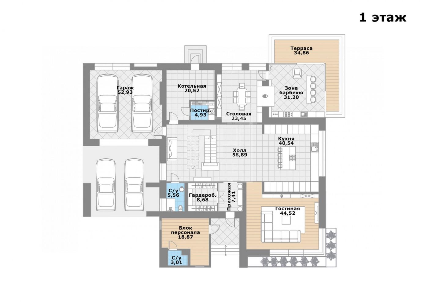 Этаж 1: Прихожая, гардеробная, холл, гостиная , кухня, столовая, барбекю, терраса, гостевой с/у , гараж на 2 м/м , блок персонала с с/у. Технические помещения: котельная, постирочная .