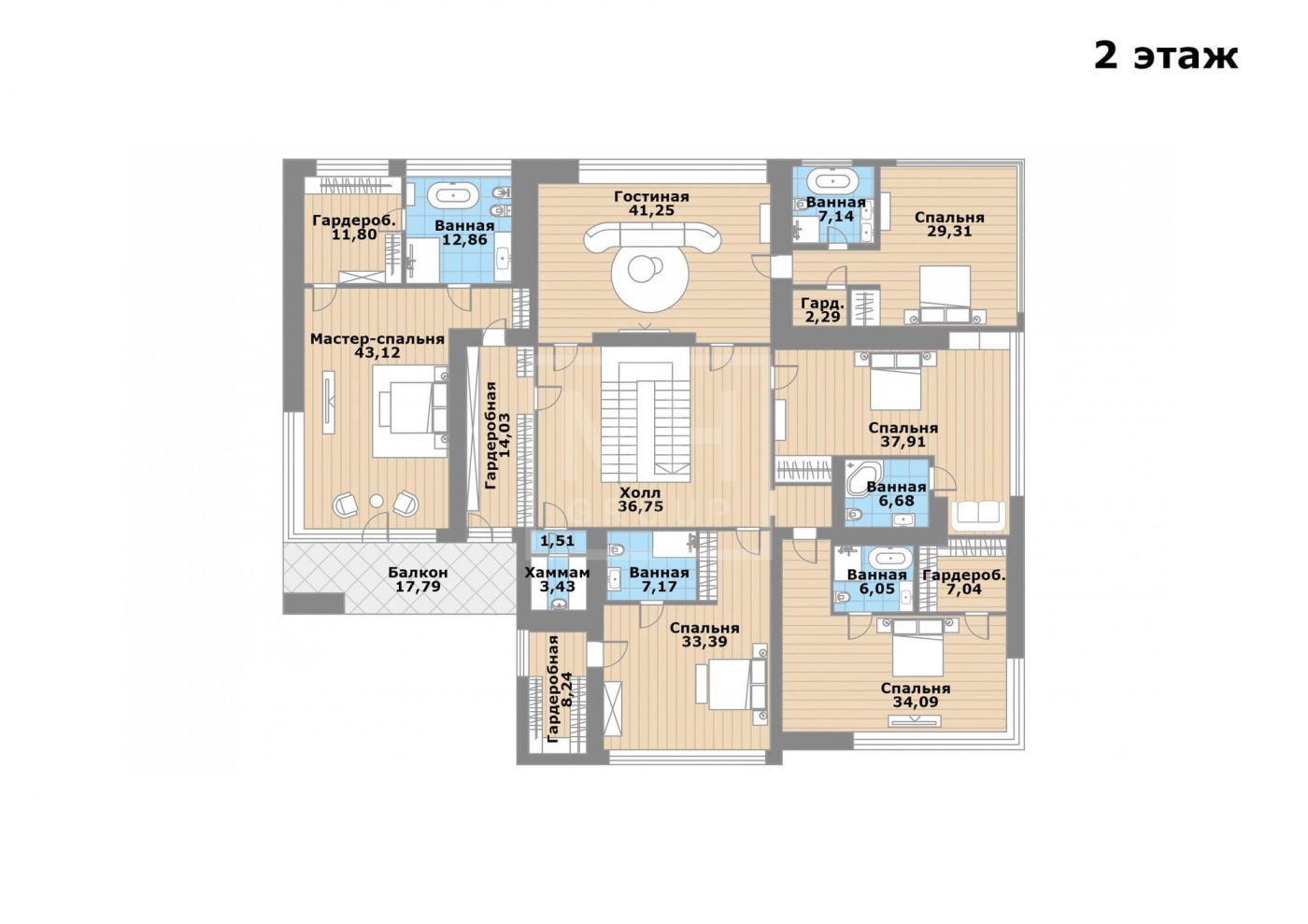 Этаж 2: Холл , гостиная , хаммам, мастер-блок: спальня №1 с балконом, двумя гардеробными и ванной комнатой , спальня №2 с ванной комнатой и гардеробной , спальня №3 с ванной комнатой и гардеробной, спальня №4 с ванной комнатой и гардеробной , спальня №5 с ванной комнатой.