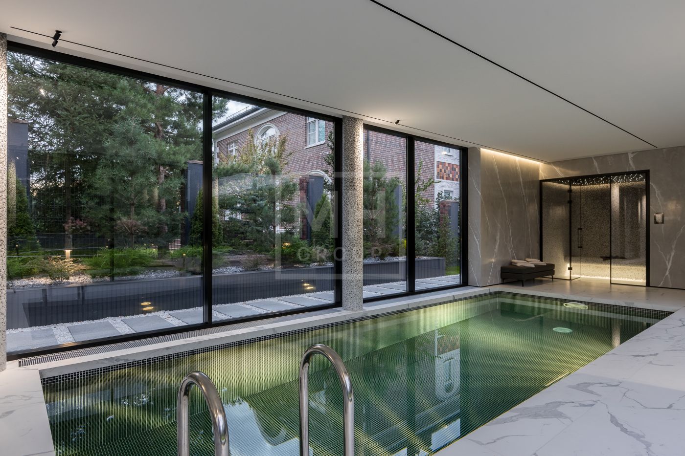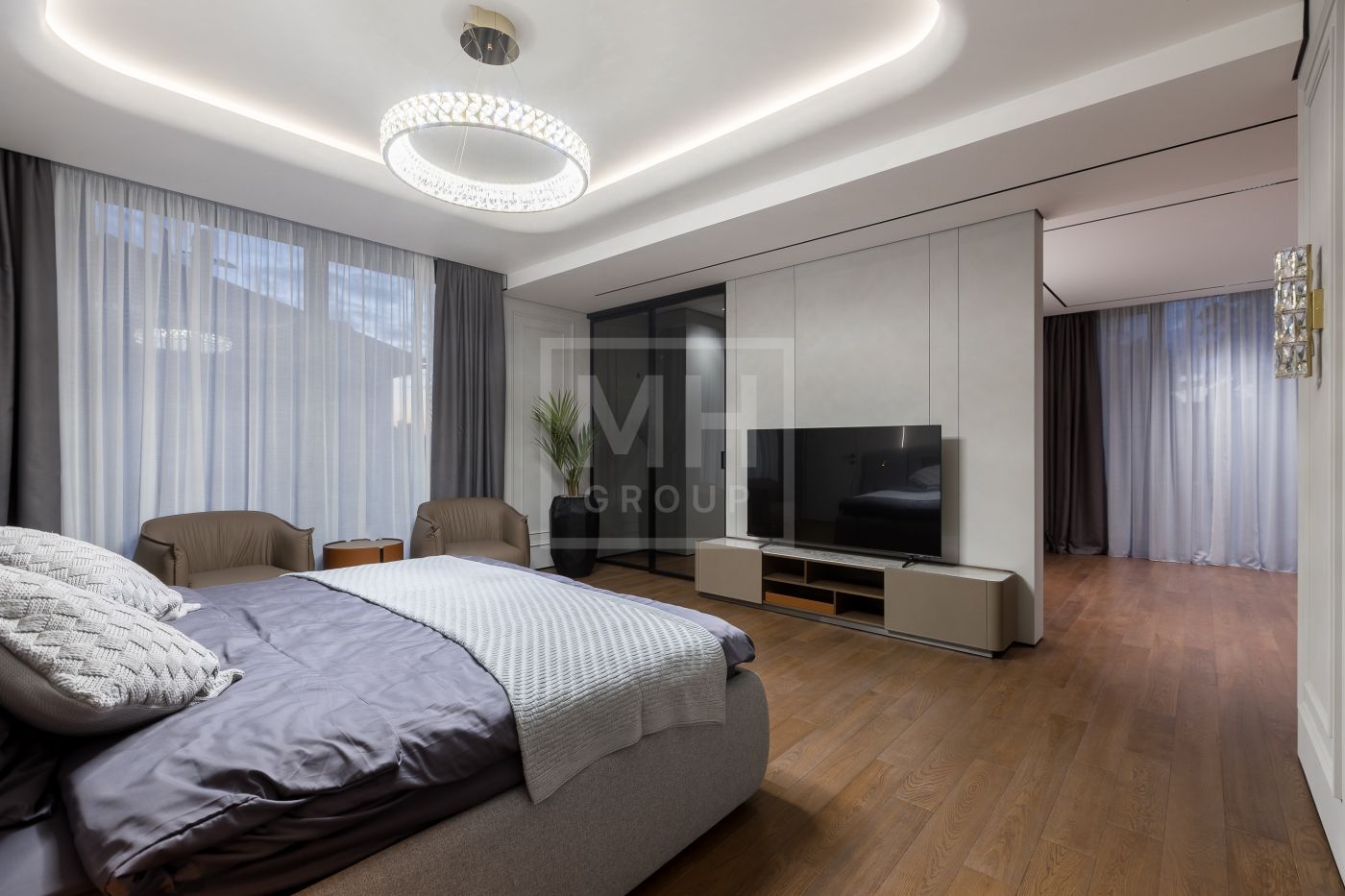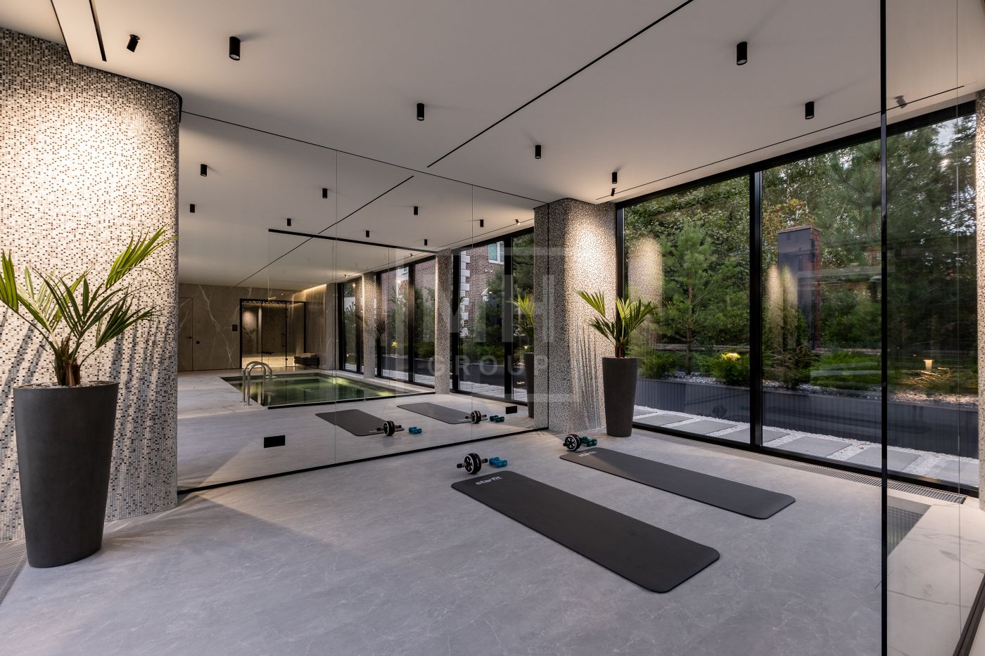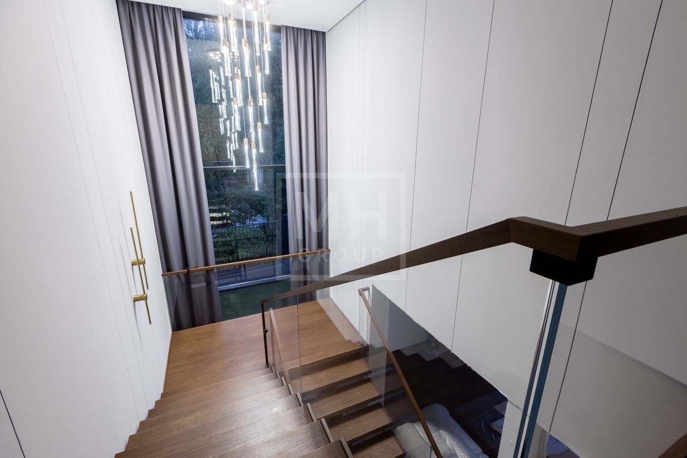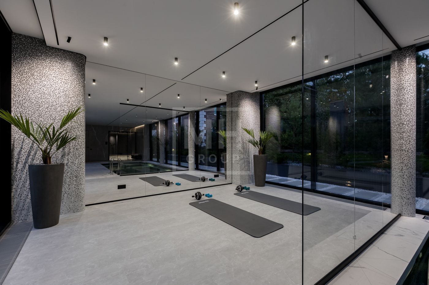 Этаж 1: Холл, гардеробная, с/у, постирочная, гостевая спальня с с/у, гостиная, кухня, кладовая, столовая с выходом на террасу Спа зона: хамам, с/у, бассейн 9 х 4 м, спортзал, гараж на 2 авто, квартира для персонала с отдельным входом.
