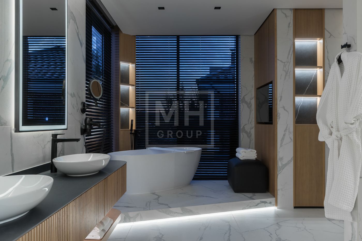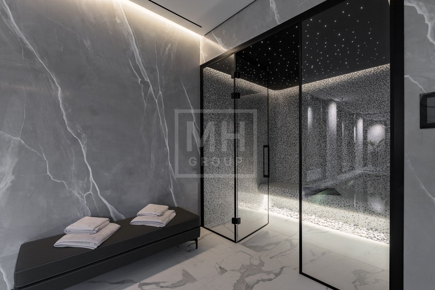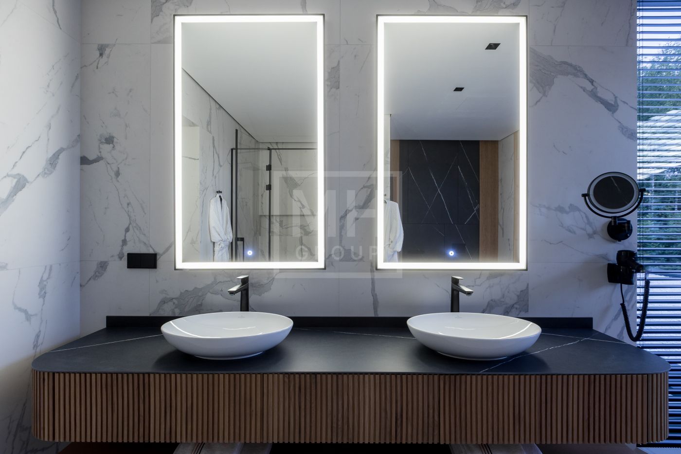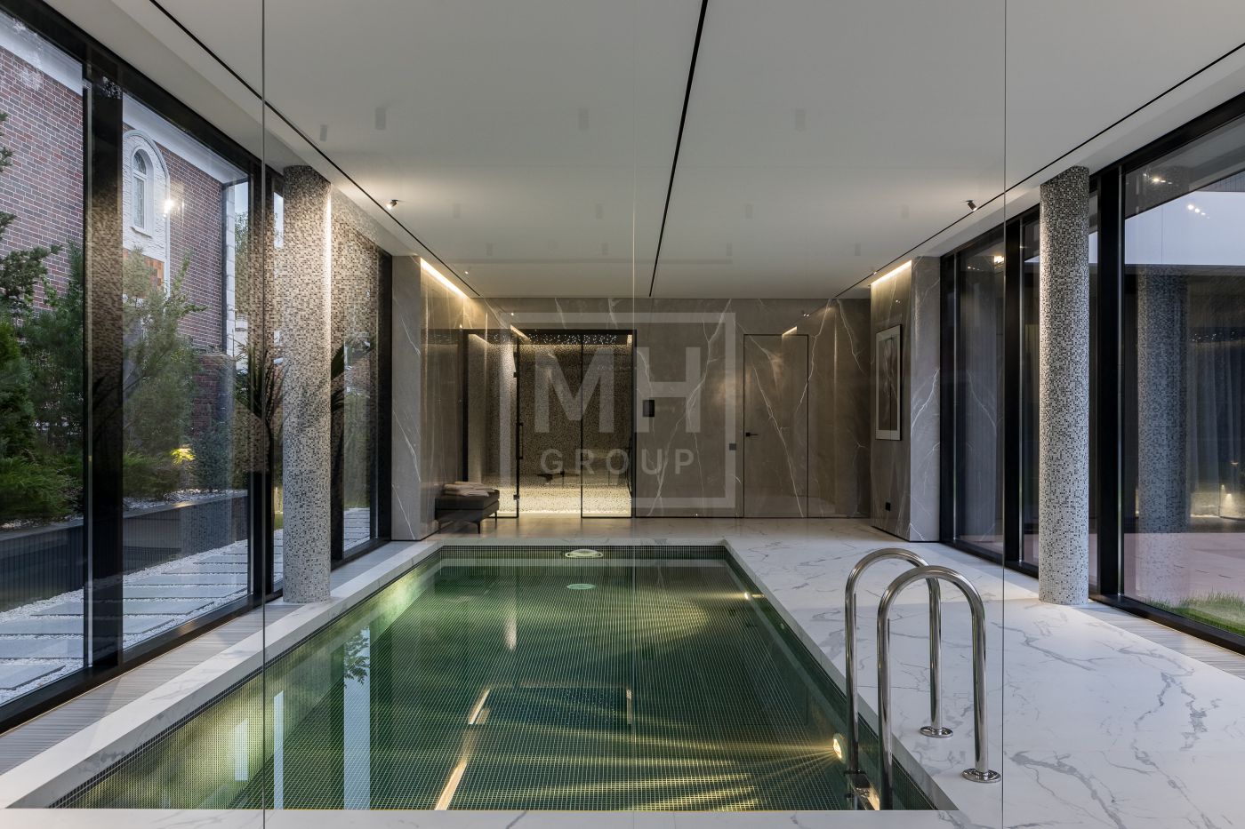 Этаж 1: Холл, гардеробная, с/у, постирочная, гостевая спальня с с/у, гостиная, кухня, кладовая, столовая с выходом на террасу Спа зона: хамам, с/у, бассейн 9 х 4 м, спортзал, гараж на 2 авто, квартира для персонала с отдельным входом.
