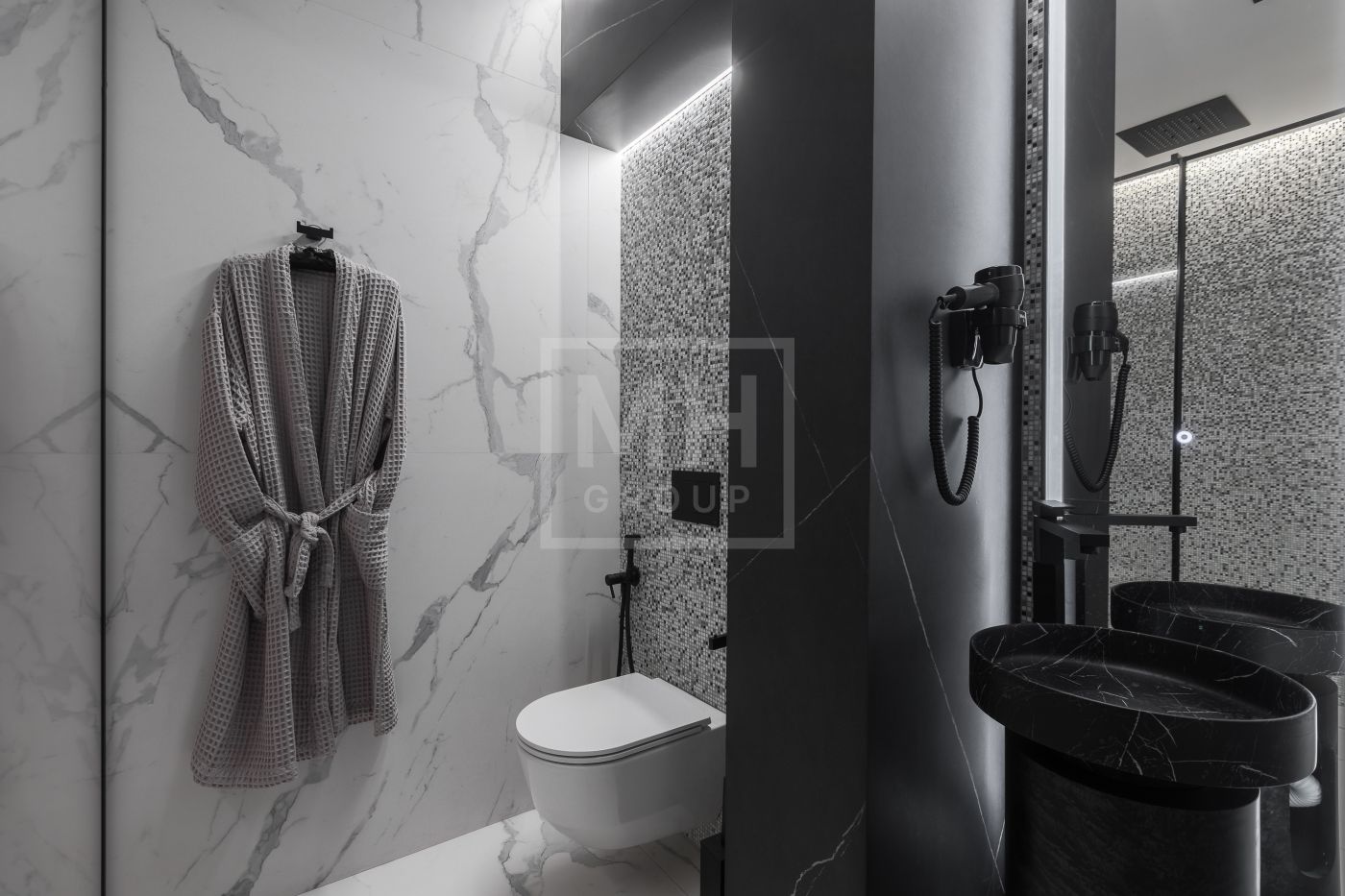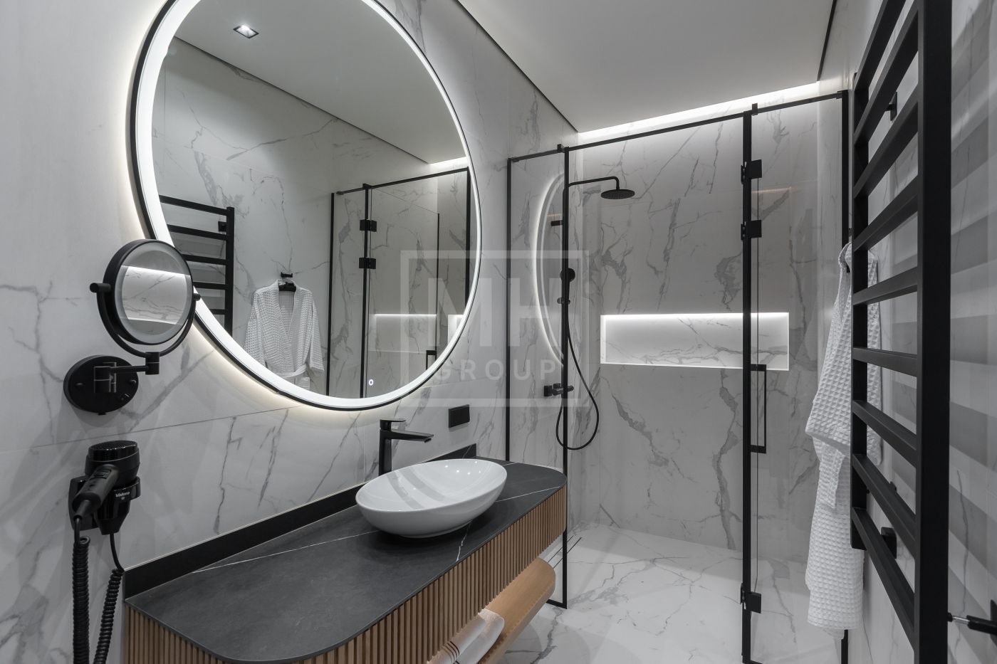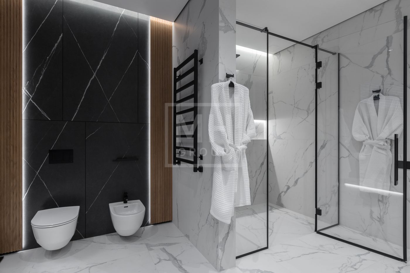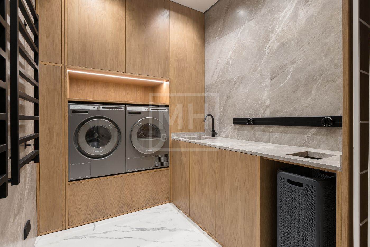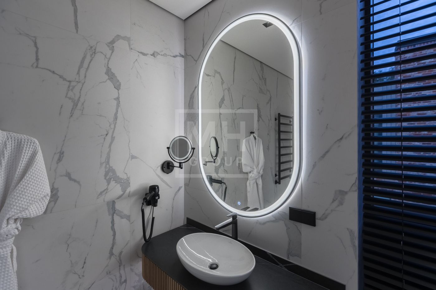 Этаж 1: Холл, гардеробная, с/у, постирочная, гостевая спальня с с/у, гостиная, кухня, кладовая, столовая с выходом на террасу Спа зона: хамам, с/у, бассейн 9 х 4 м, спортзал, гараж на 2 авто, квартира для персонала с отдельным входом.