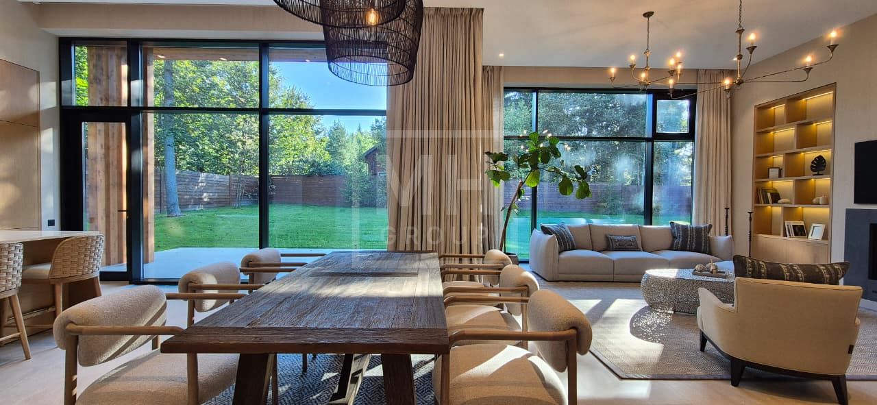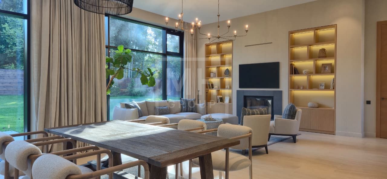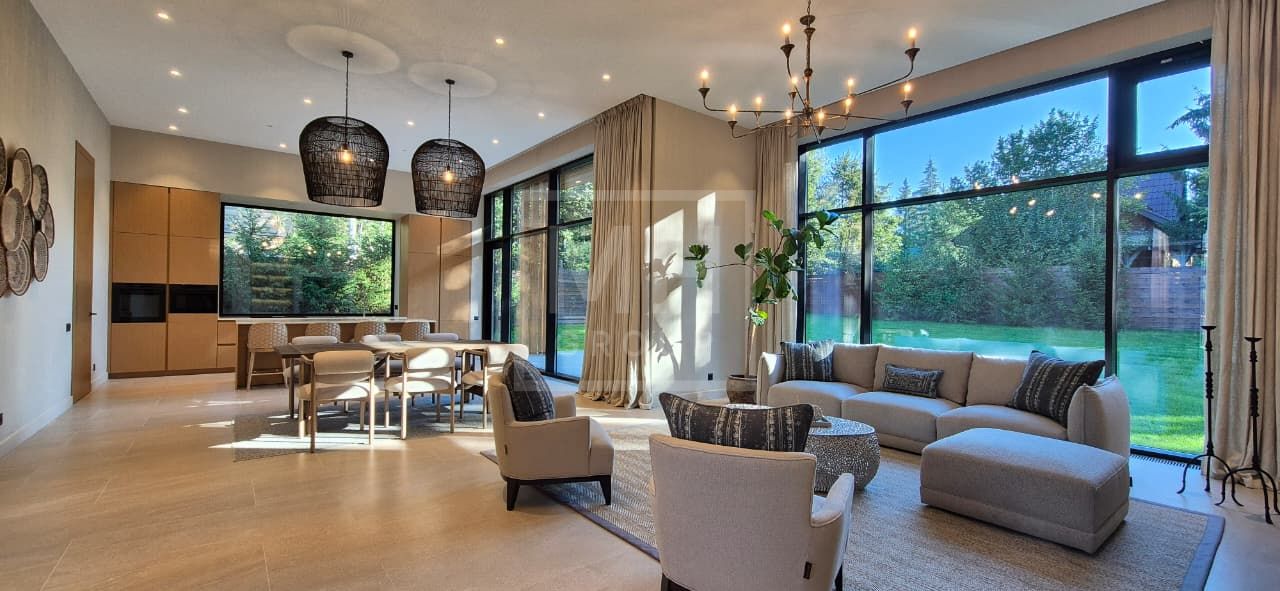 Дом возведён из качественных, долговечных материалов с использованием современных технологий утепления и шумоизоляции. Планировка площадью 275 квадратных метров. Высокие потолки, большие окна, наполненные светом гостиная и кухня-столовая создают ощущение простора и уюта одновременно.