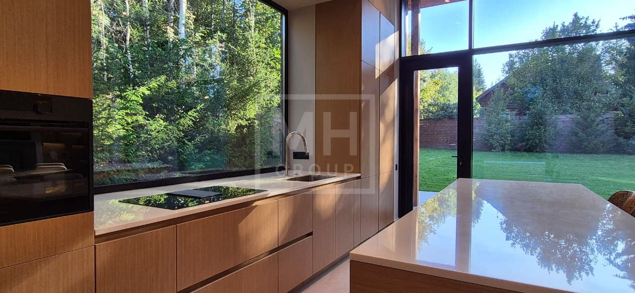 Внутреннее пространство дома: кухня-гостинная площадью 80 кв.м. с потолком 4 метра, включает в себя диванную зону с дровяным камином, встроенную кухню с островом и обеденной зоной и выходом на крытую террасу 27 кв.м. В доме четыре уютные спальни, три из которых имеют свои санузлы и гардеробные.