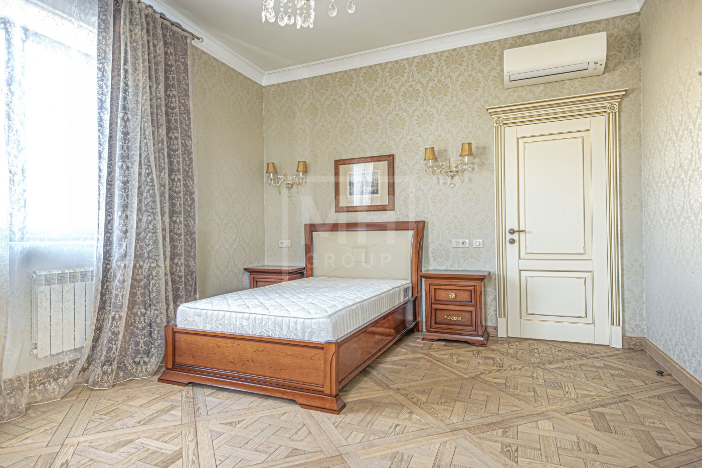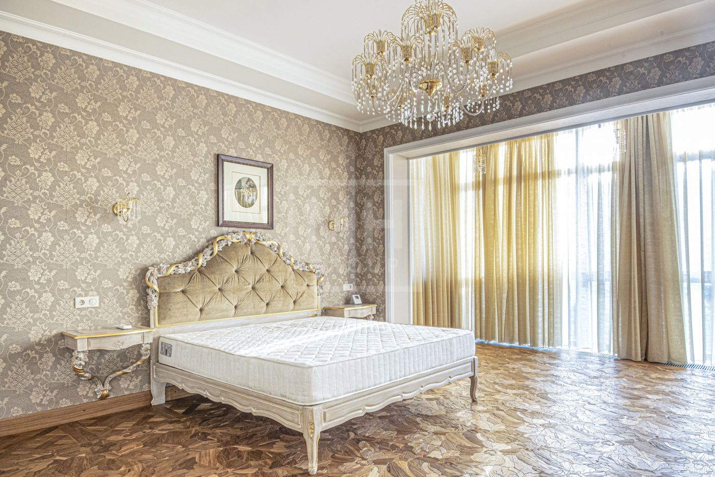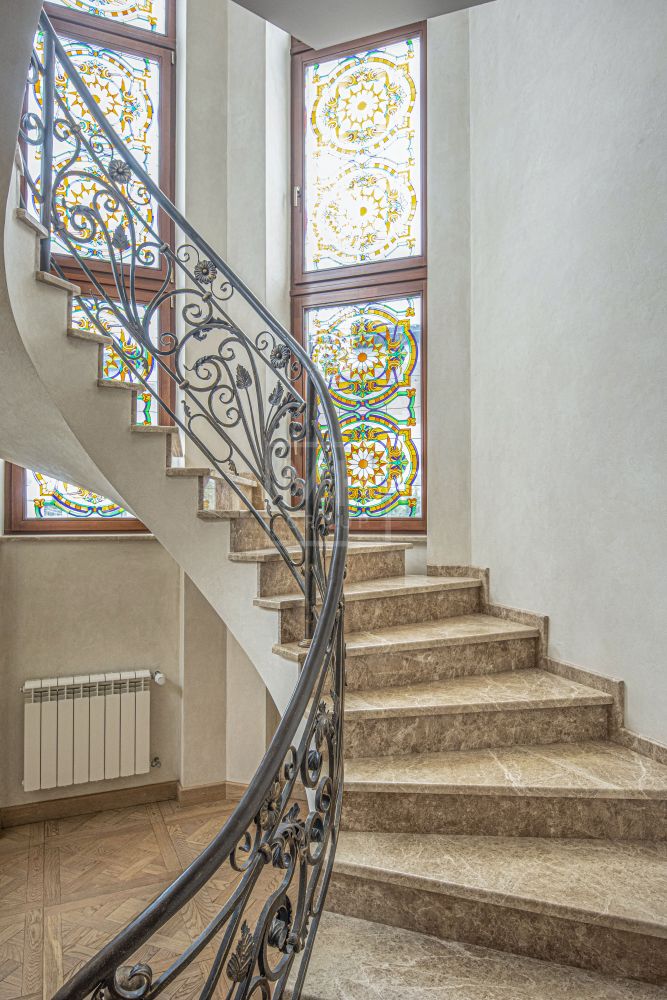 На стенах эксклюзивные шелковые обои, венецианская штукатурка, пол - мрамор и наборный паркет. Панорамное остекление, витражи. По периметру дома - видеонаблюдение. На участке высажены взрослые деревья, имеется навес для автомобиля.