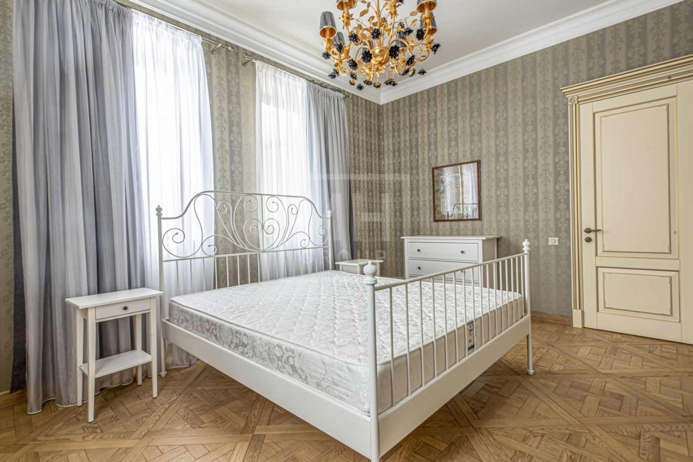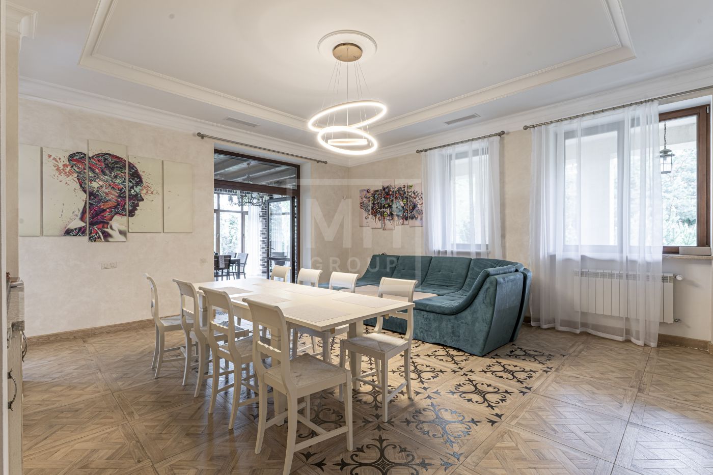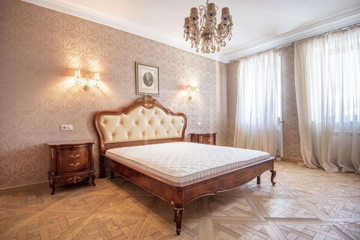 На стенах эксклюзивные шелковые обои, венецианская штукатурка, пол - мрамор и наборный паркет. Панорамное остекление, витражи. По периметру дома - видеонаблюдение. На участке высажены взрослые деревья, имеется навес для автомобиля.