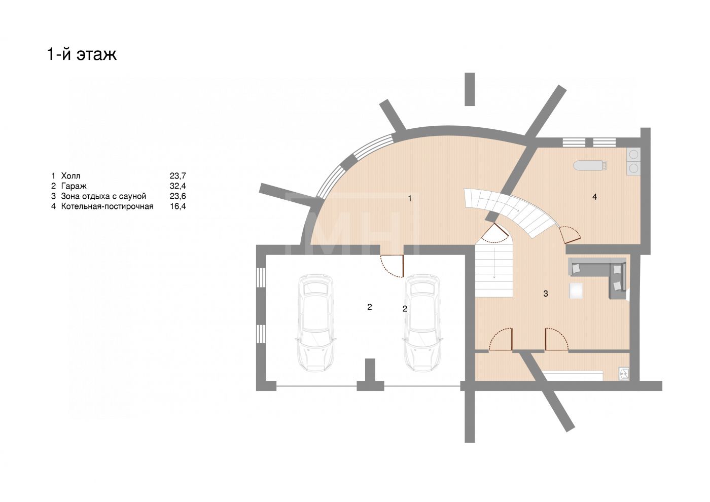 Этаж 1: холл, комната отдыха, сауна, кладовая, котельная-постирочная, гараж на 2 м/м