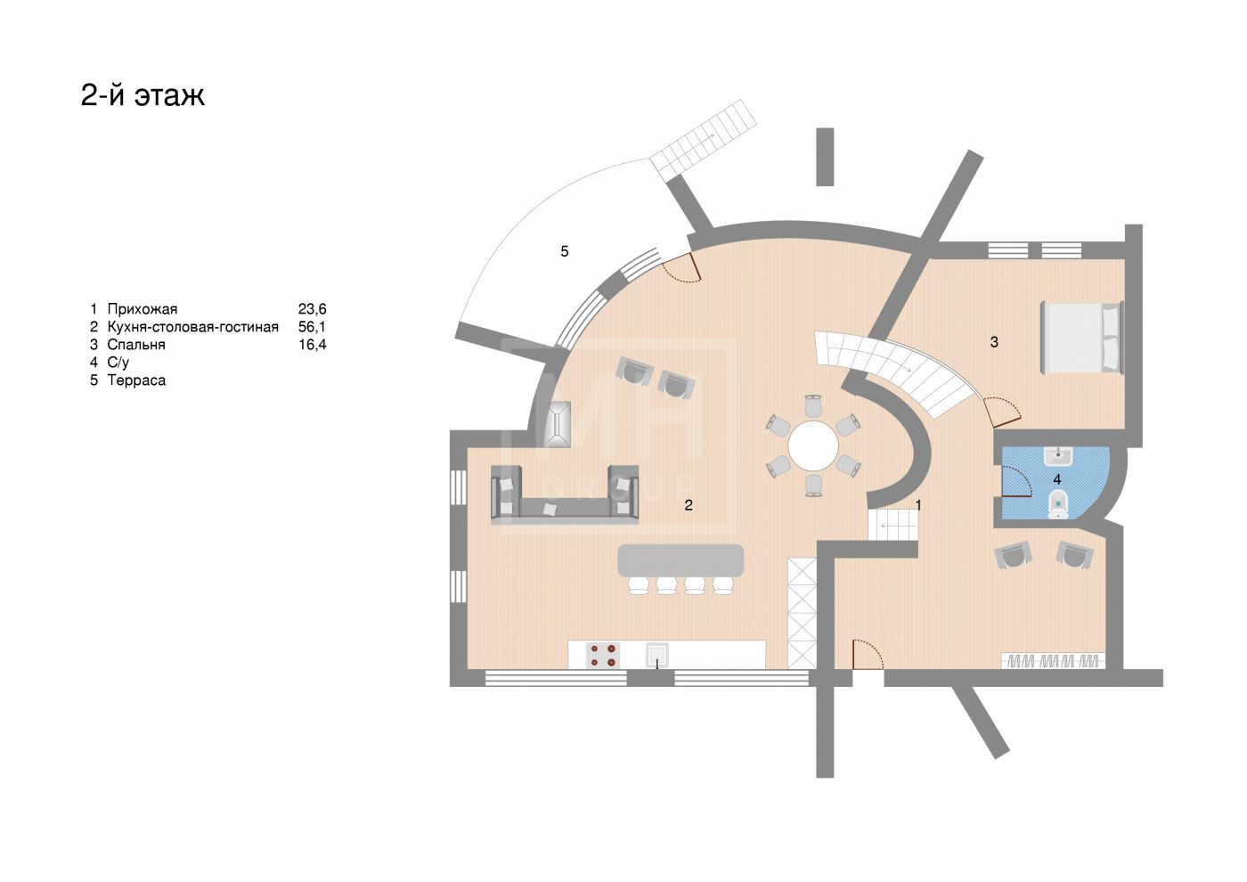Этаж 2: прихожая, кухня-столовая-гостиная с камином и балконом, спальня, с/у
