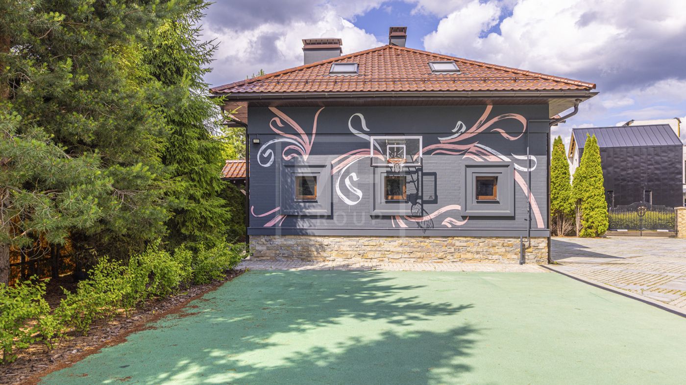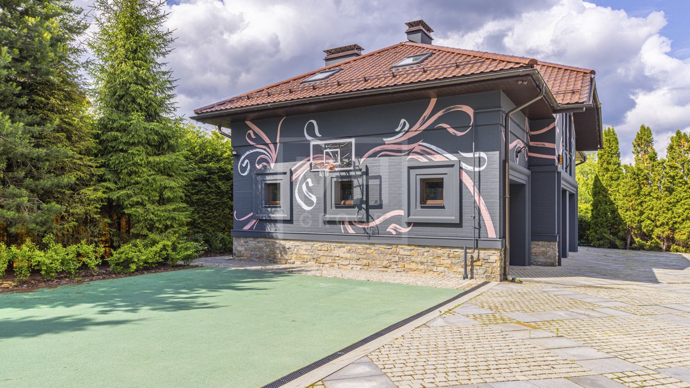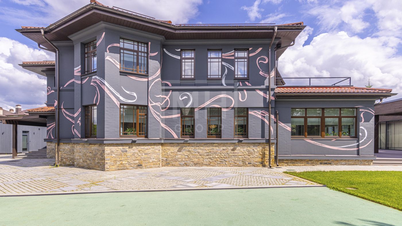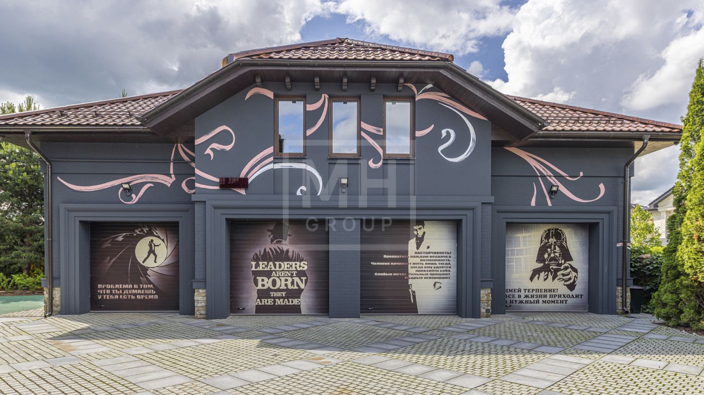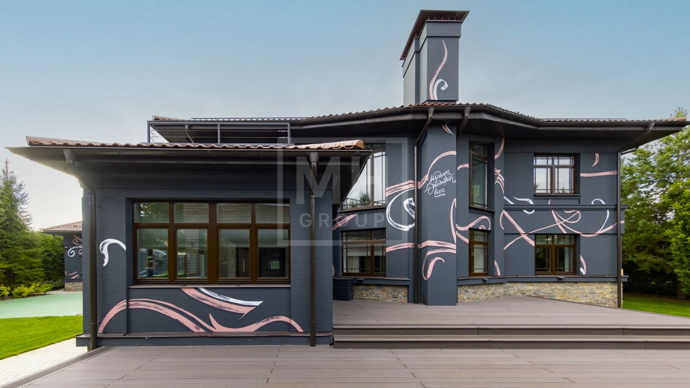 Загородный коттедж площадью 487 м² расположен на полевом участке 22 сотки,воплощает концепцию home office. Черный фасад с росписью в стиле стрит-арта создает выразительный современный образ, а большие окна наполняют интерьеры естественным светом. Внутреннее пространство выдержано в светлых тонах элементами неоклассики, где каждая деталь продумана до мелочей — премиальные обои американских производителей, мрамор, камин, авторская мебель и светильники. Особый шарм придают спортивные арт-объекты — антикварные клюшки, винтажный велосипед и футбольные мячи.Дом оснащен передовыми инженерными системами, включая канальное кондиционирование, увлажнение, приточную вентиляцию и систему «умный дом».Здесь создано идеальное пространство для комфортной работы и проведения деловых и личных встреч. Планировка включает просторную кухню-столовую с бильярдной зоной и винными шкафами, зал ожидания, 2 переговорные,5 кабинетов, гардеробную, кладовые и зону с ретро-автомобилем Bugatti. На каждом этаже расположены стойки ресепшен.