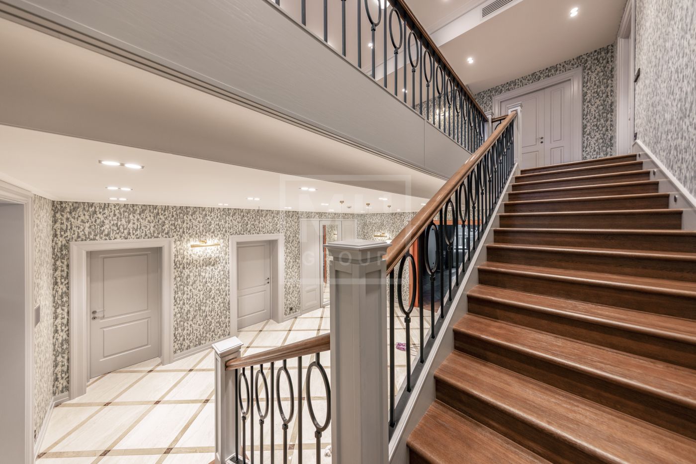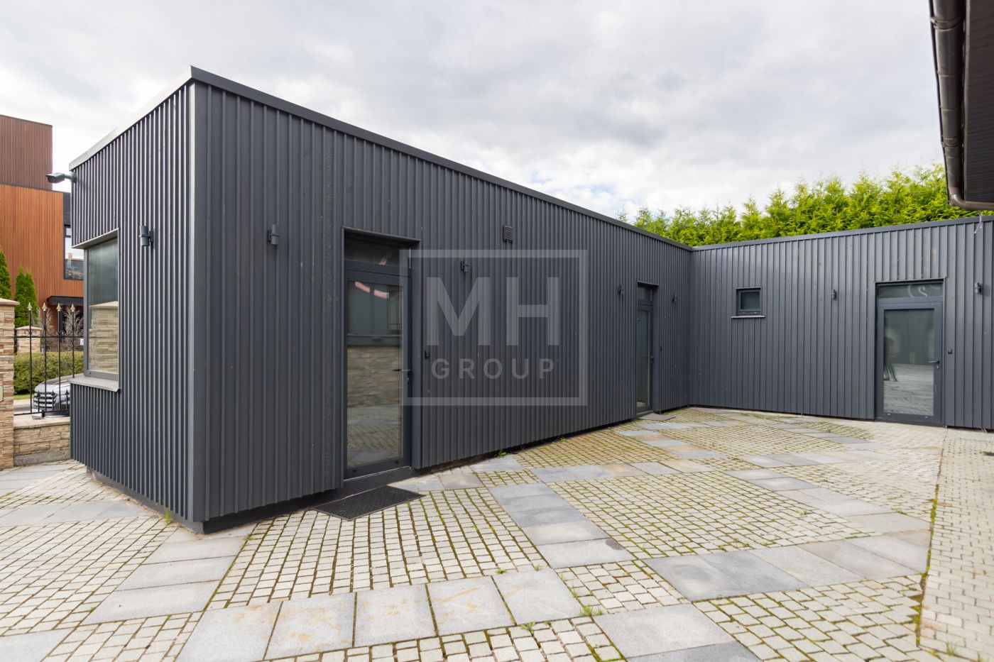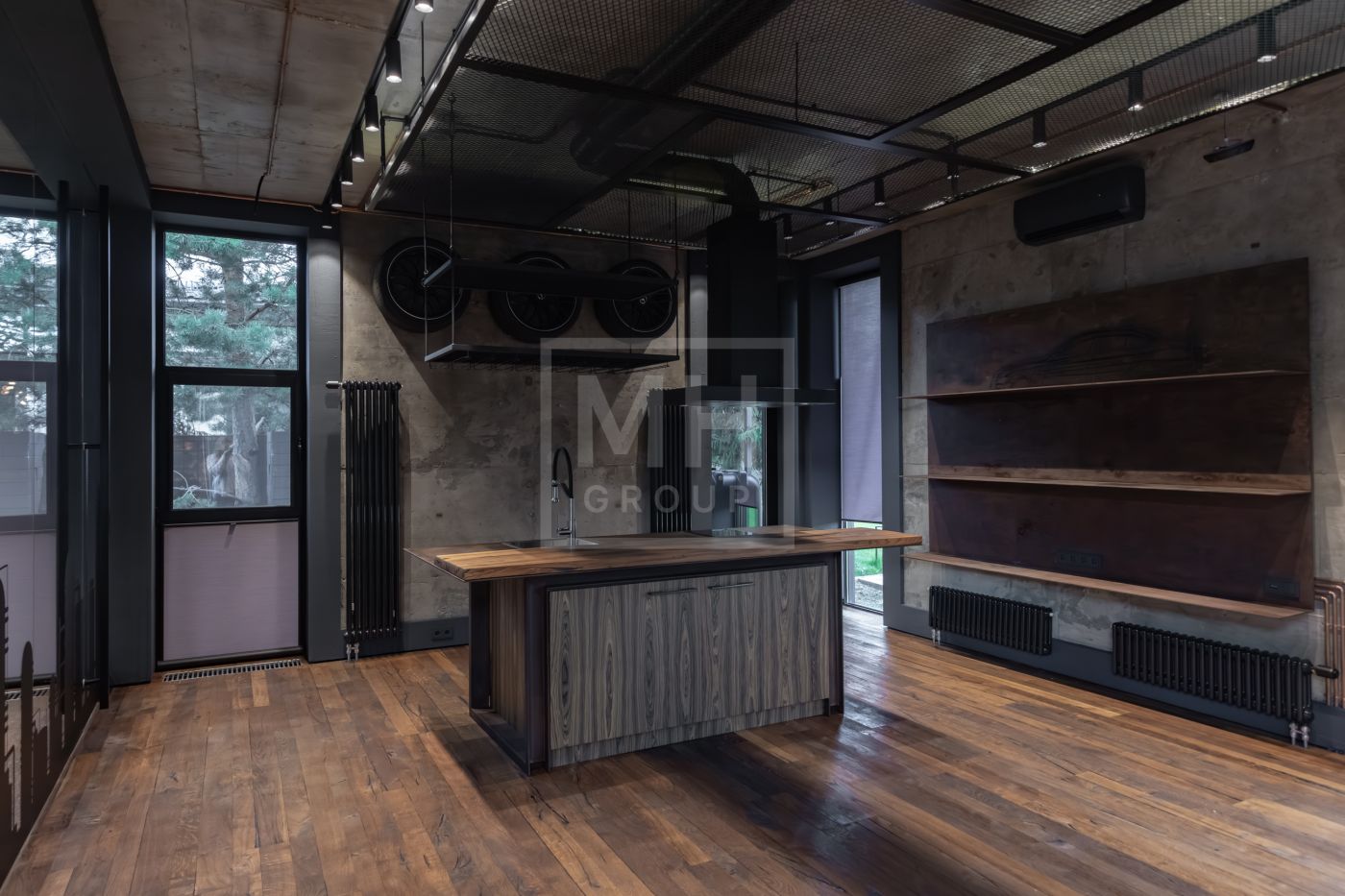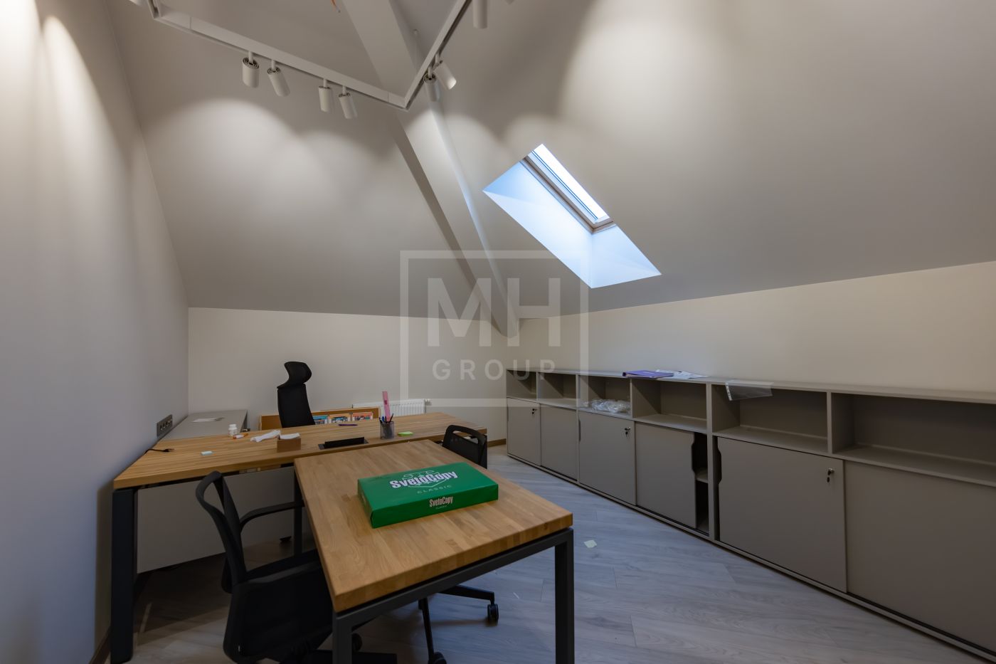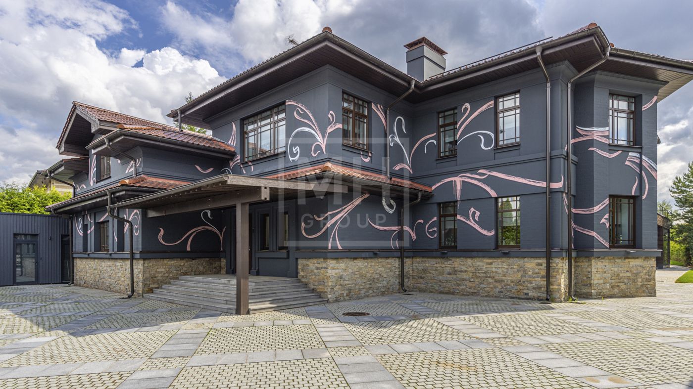 Загородный коттедж площадью 487 м² расположен на полевом участке 22 сотки,воплощает концепцию home office. Черный фасад с росписью в стиле стрит-арта создает выразительный современный образ, а большие окна наполняют интерьеры естественным светом. Внутреннее пространство выдержано в светлых тонах элементами неоклассики, где каждая деталь продумана до мелочей — премиальные обои американских производителей, мрамор, камин, авторская мебель и светильники. Особый шарм придают спортивные арт-объекты — антикварные клюшки, винтажный велосипед и футбольные мячи.Дом оснащен передовыми инженерными системами, включая канальное кондиционирование, увлажнение, приточную вентиляцию и систему «умный дом».Здесь создано идеальное пространство для комфортной работы и проведения деловых и личных встреч. Планировка включает просторную кухню-столовую с бильярдной зоной и винными шкафами, зал ожидания, 2 переговорные,5 кабинетов, гардеробную, кладовые и зону с ретро-автомобилем Bugatti. На каждом этаже расположены стойки ресепшен.