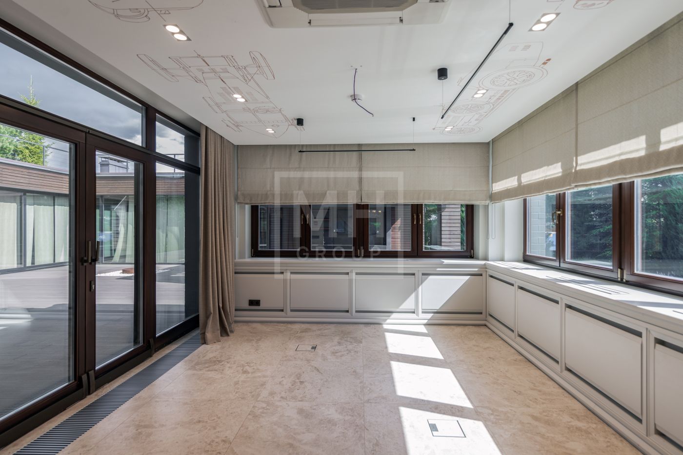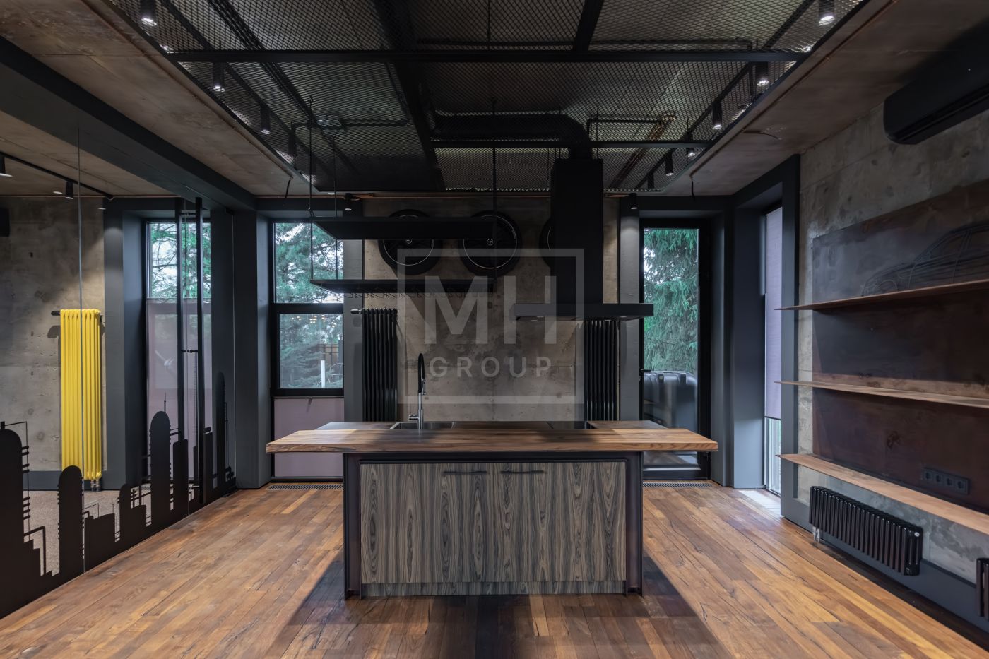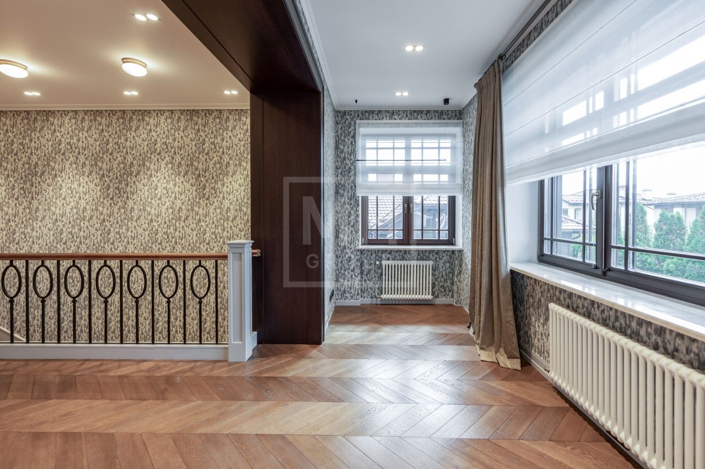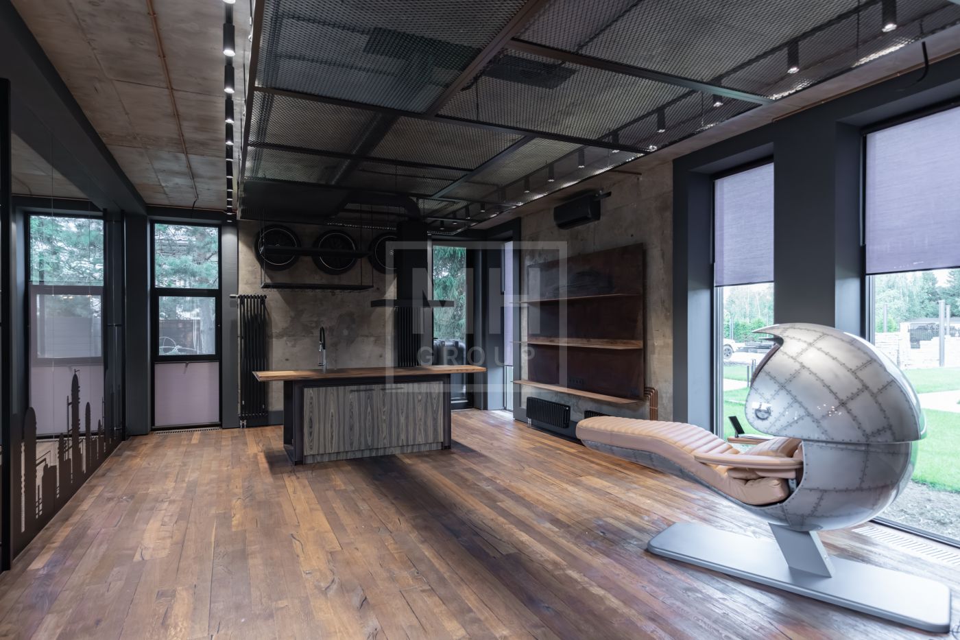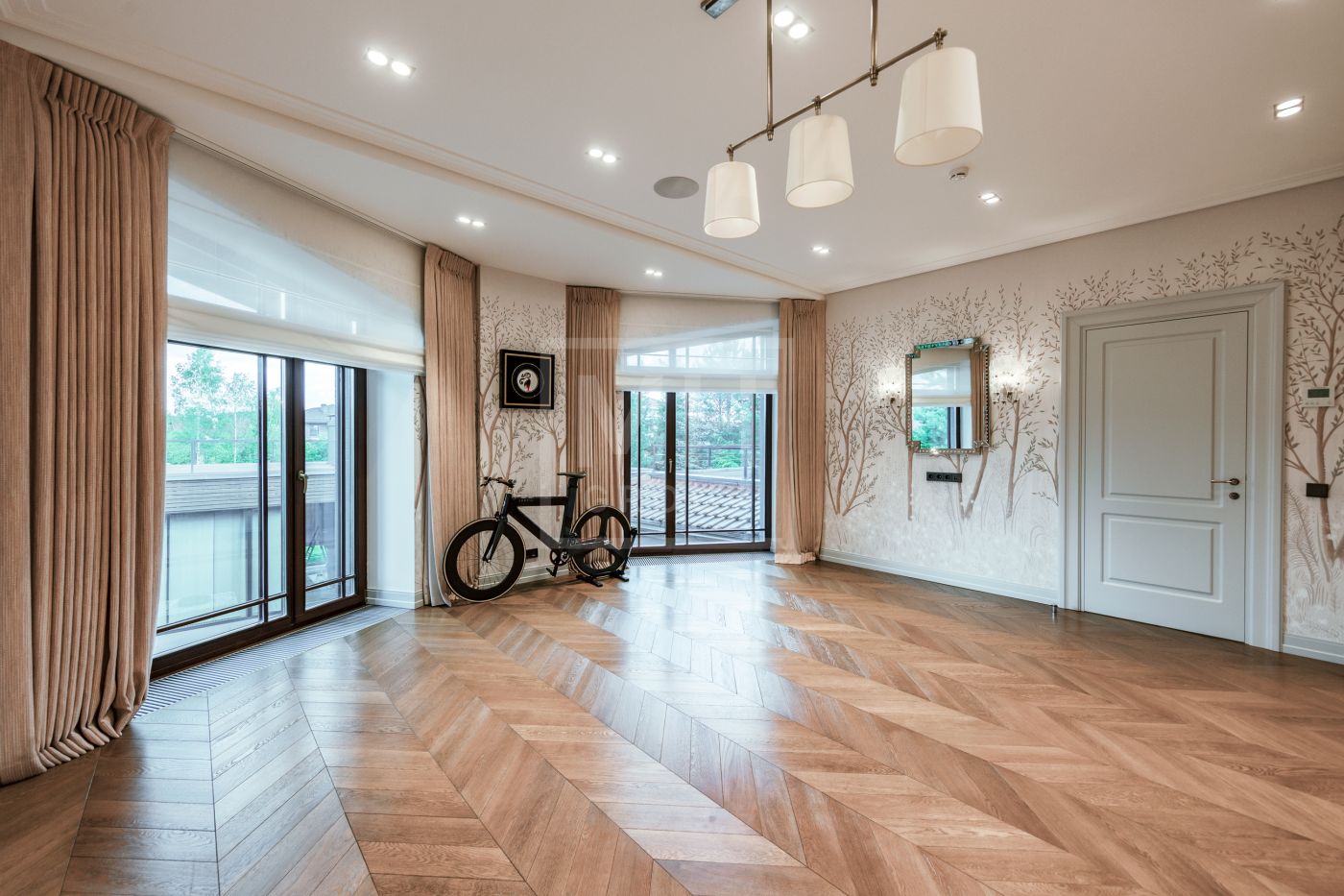 Загородный коттедж площадью 487 м² расположен на полевом участке 22 сотки,воплощает концепцию home office. Черный фасад с росписью в стиле стрит-арта создает выразительный современный образ, а большие окна наполняют интерьеры естественным светом. Внутреннее пространство выдержано в светлых тонах элементами неоклассики, где каждая деталь продумана до мелочей — премиальные обои американских производителей, мрамор, камин, авторская мебель и светильники. Особый шарм придают спортивные арт-объекты — антикварные клюшки, винтажный велосипед и футбольные мячи.Дом оснащен передовыми инженерными системами, включая канальное кондиционирование, увлажнение, приточную вентиляцию и систему «умный дом».Здесь создано идеальное пространство для комфортной работы и проведения деловых и личных встреч. Планировка включает просторную кухню-столовую с бильярдной зоной и винными шкафами, зал ожидания, 2 переговорные,5 кабинетов, гардеробную, кладовые и зону с ретро-автомобилем Bugatti. На каждом этаже расположены стойки ресепшен.
