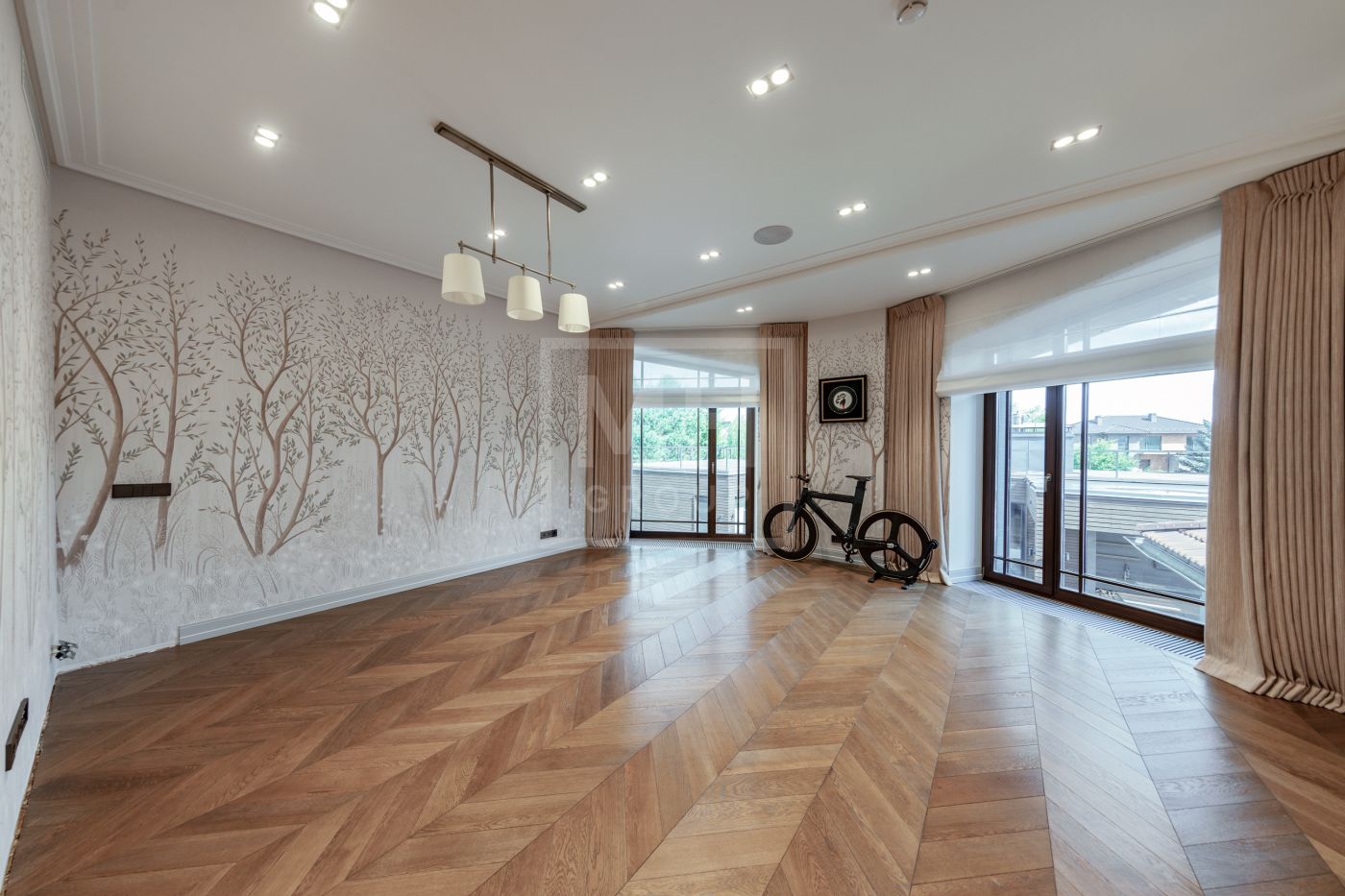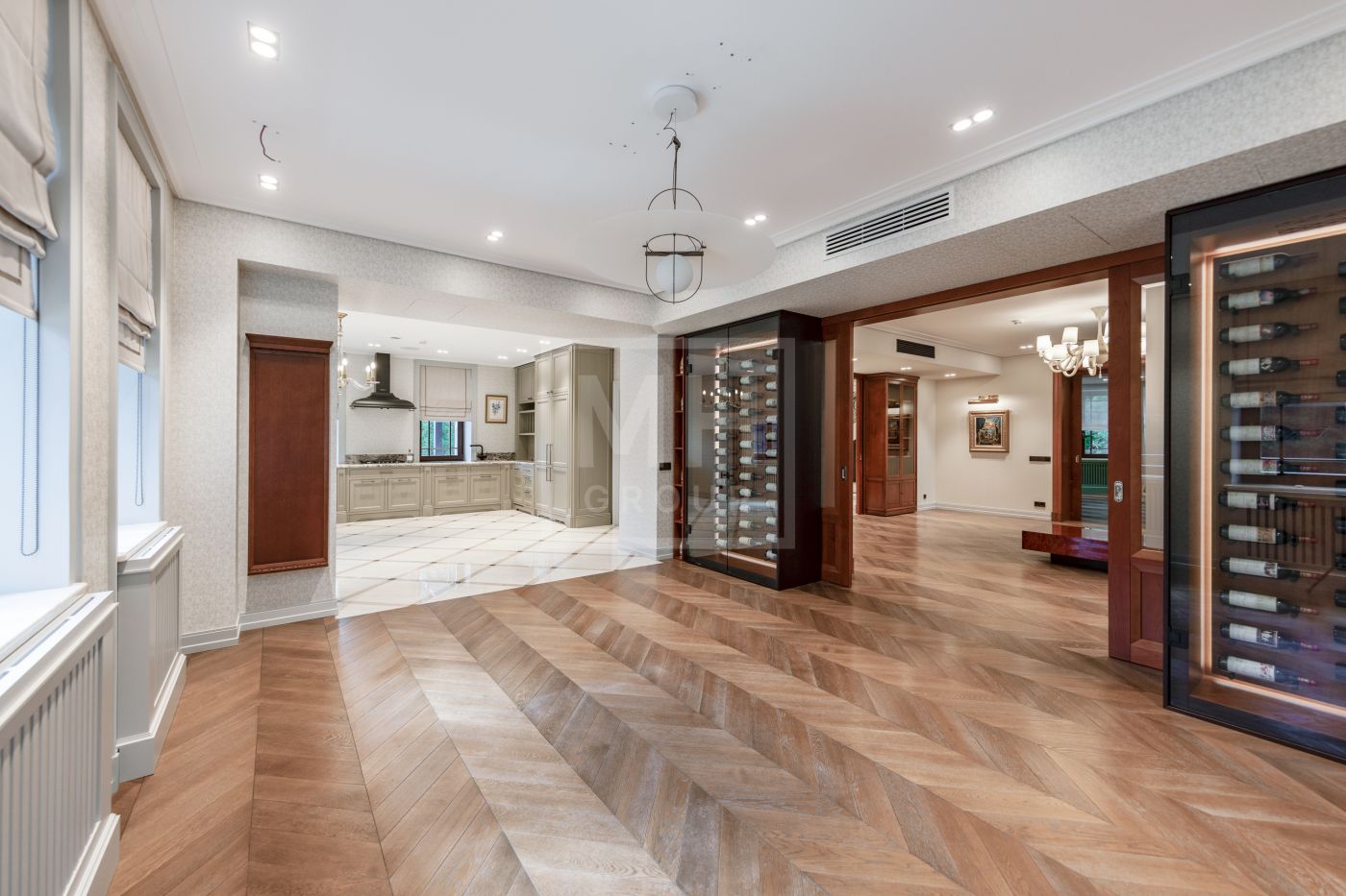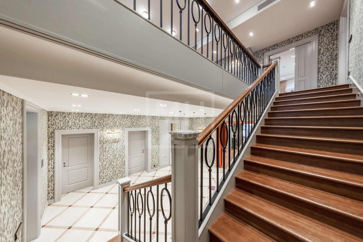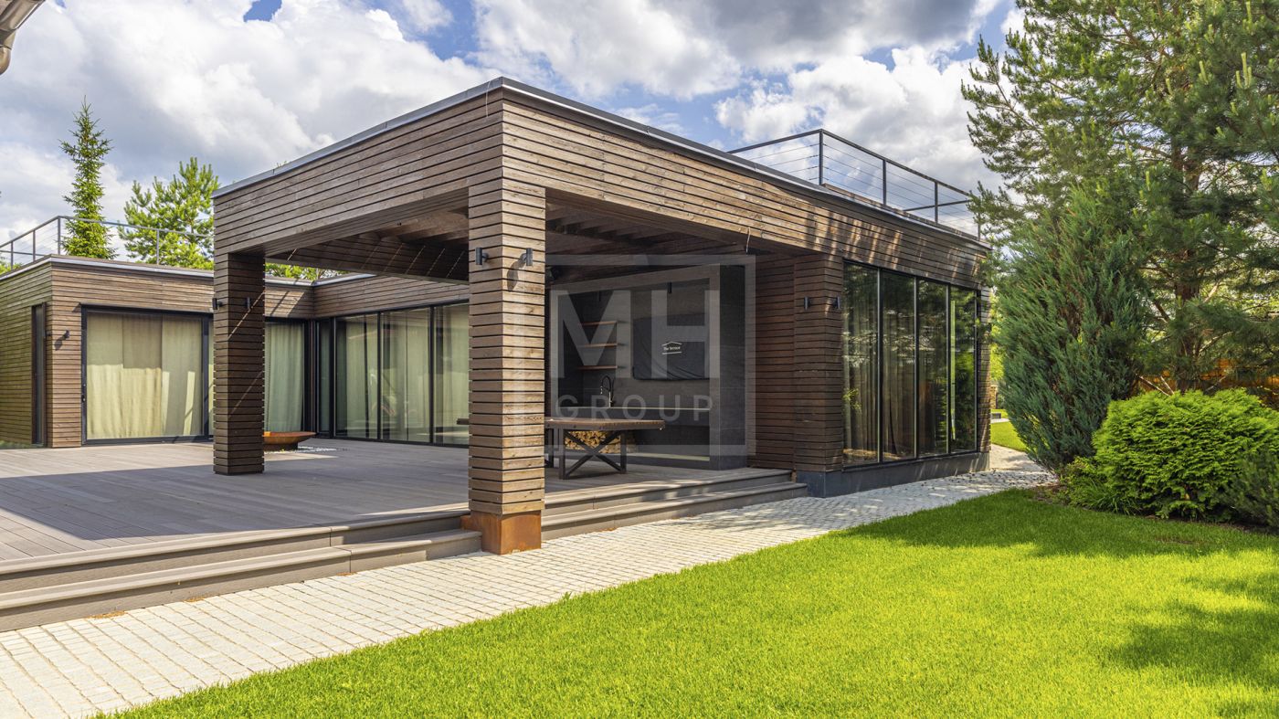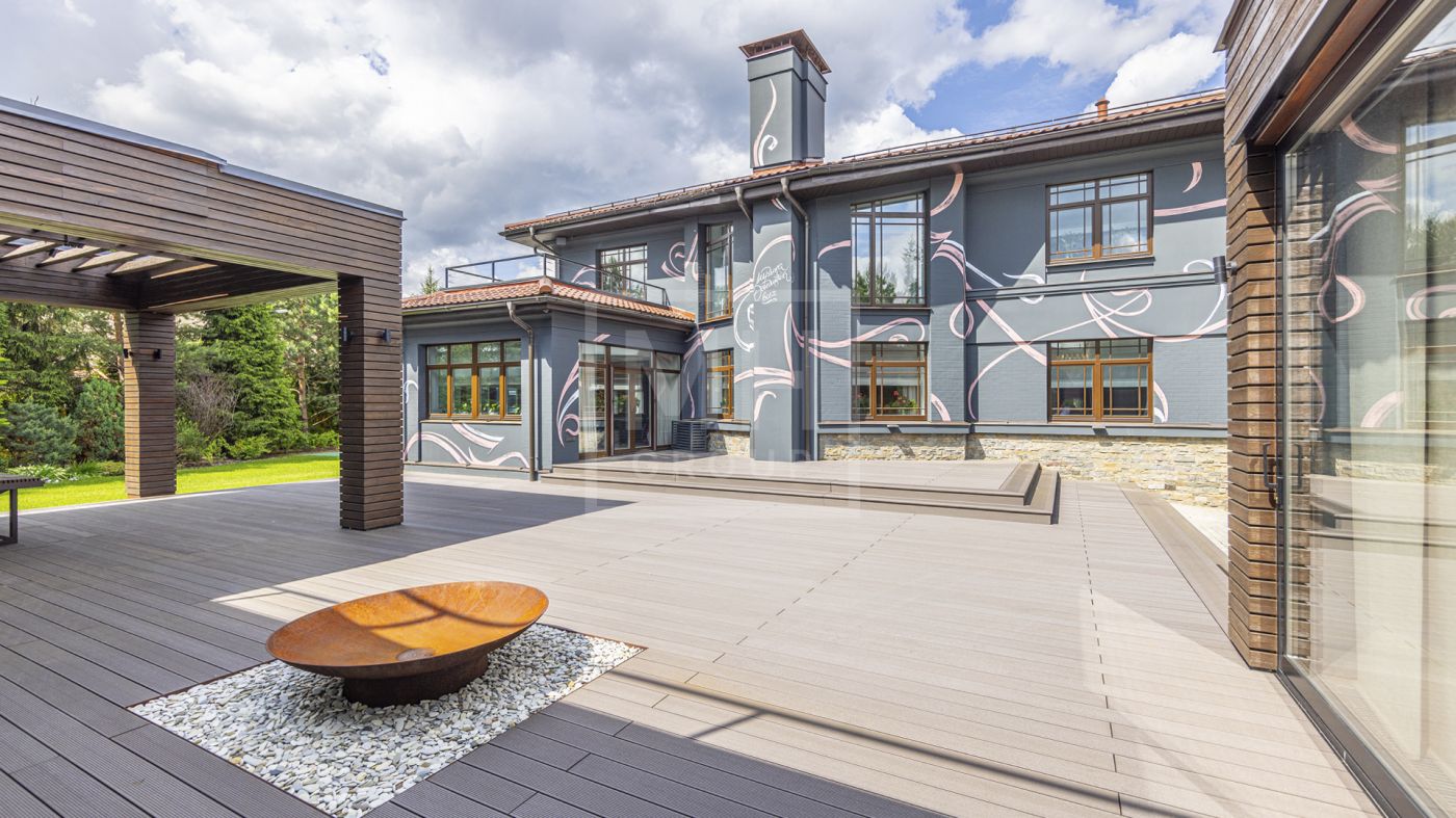 Загородный коттедж площадью 487 м² расположен на полевом участке 22 сотки,воплощает концепцию home office. Черный фасад с росписью в стиле стрит-арта создает выразительный современный образ, а большие окна наполняют интерьеры естественным светом. Внутреннее пространство выдержано в светлых тонах элементами неоклассики, где каждая деталь продумана до мелочей — премиальные обои американских производителей, мрамор, камин, авторская мебель и светильники. Особый шарм придают спортивные арт-объекты — антикварные клюшки, винтажный велосипед и футбольные мячи.Дом оснащен передовыми инженерными системами, включая канальное кондиционирование, увлажнение, приточную вентиляцию и систему «умный дом».Здесь создано идеальное пространство для комфортной работы и проведения деловых и личных встреч. Планировка включает просторную кухню-столовую с бильярдной зоной и винными шкафами, зал ожидания, 2 переговорные,5 кабинетов, гардеробную, кладовые и зону с ретро-автомобилем Bugatti. На каждом этаже расположены стойки ресепшен.
