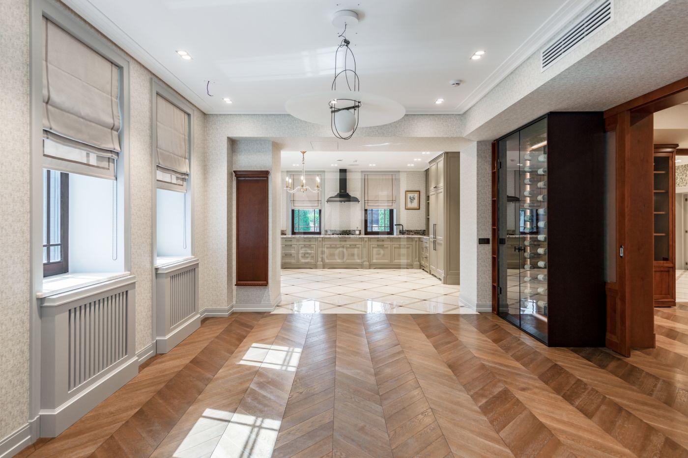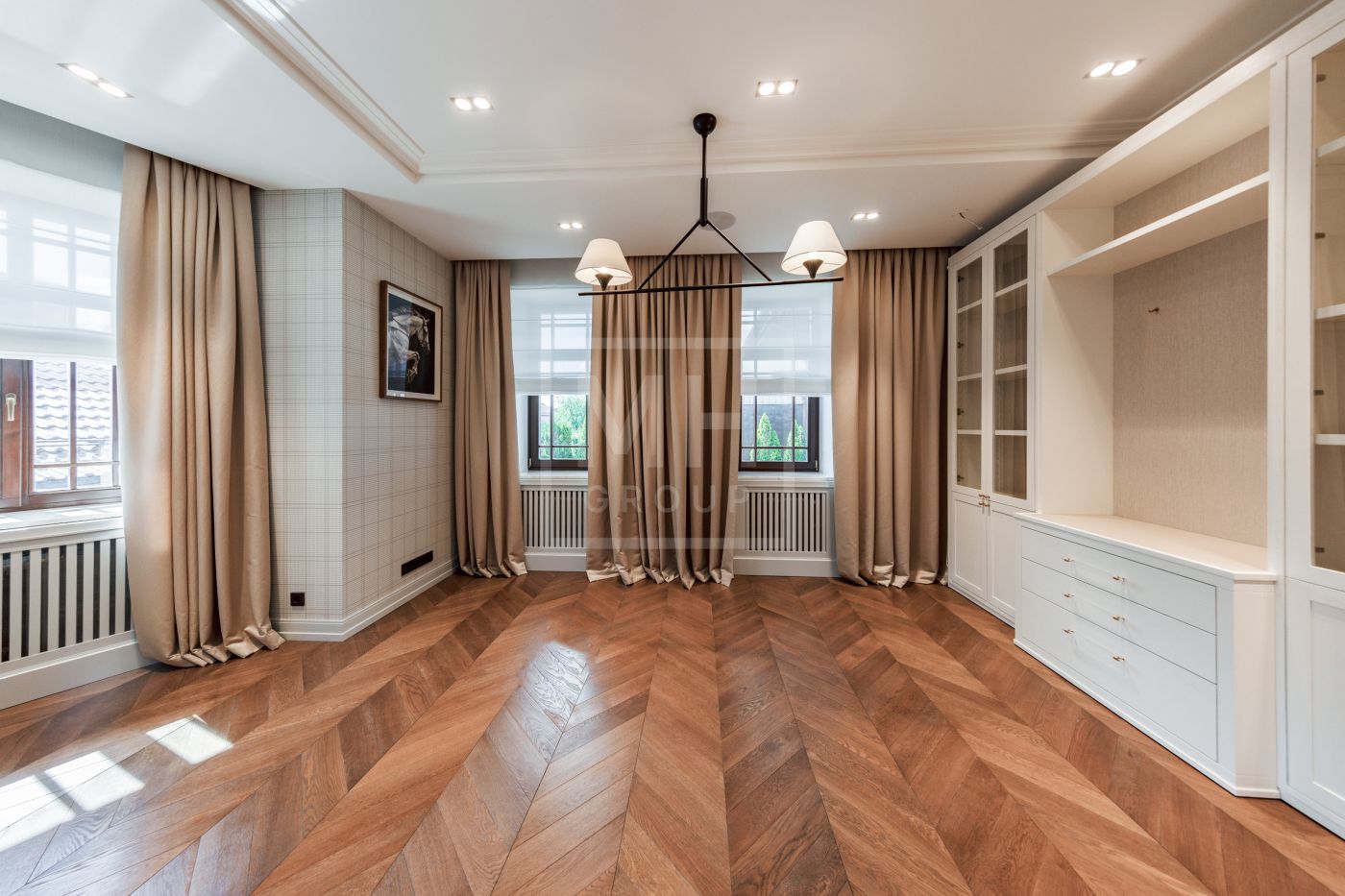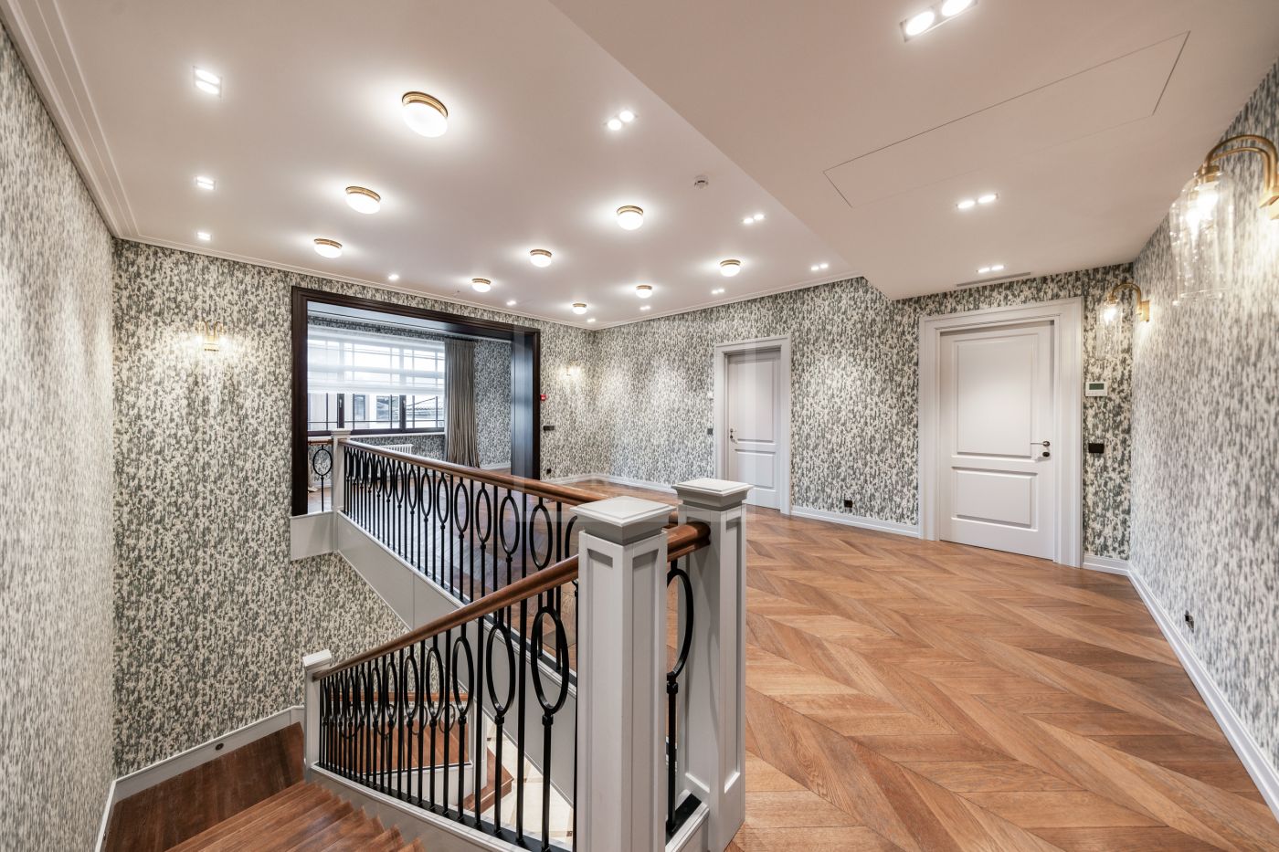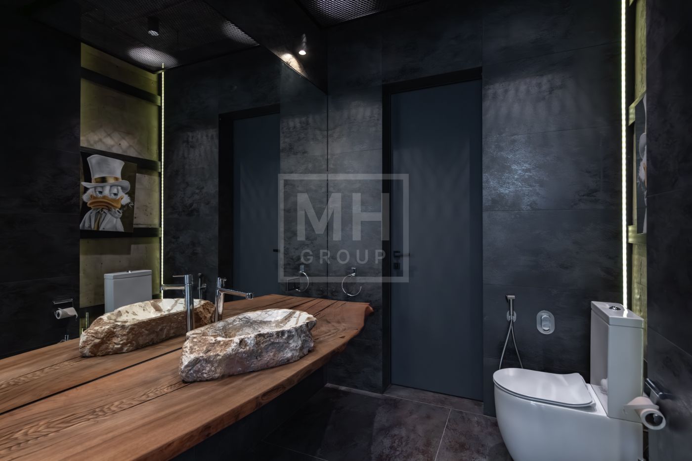 Загородный коттедж площадью 487 м² расположен на полевом участке 22 сотки,воплощает концепцию home office. Черный фасад с росписью в стиле стрит-арта создает выразительный современный образ, а большие окна наполняют интерьеры естественным светом. Внутреннее пространство выдержано в светлых тонах элементами неоклассики, где каждая деталь продумана до мелочей — премиальные обои американских производителей, мрамор, камин, авторская мебель и светильники. Особый шарм придают спортивные арт-объекты — антикварные клюшки, винтажный велосипед и футбольные мячи.Дом оснащен передовыми инженерными системами, включая канальное кондиционирование, увлажнение, приточную вентиляцию и систему «умный дом».Здесь создано идеальное пространство для комфортной работы и проведения деловых и личных встреч. Планировка включает просторную кухню-столовую с бильярдной зоной и винными шкафами, зал ожидания, 2 переговорные,5 кабинетов, гардеробную, кладовые и зону с ретро-автомобилем Bugatti. На каждом этаже расположены стойки ресепшен.
