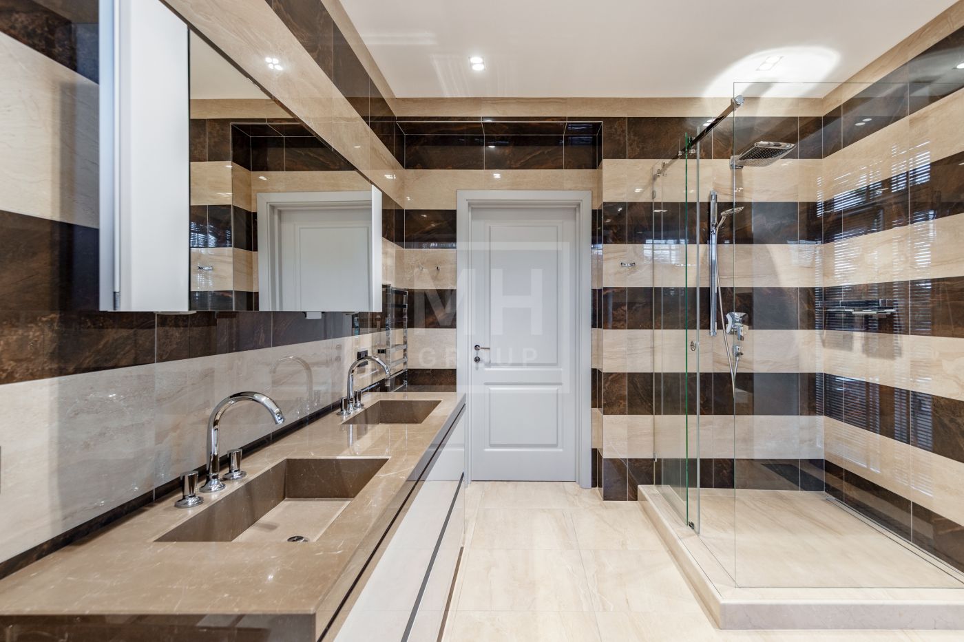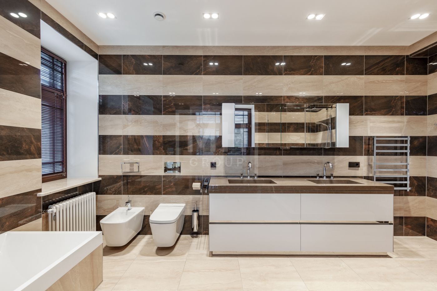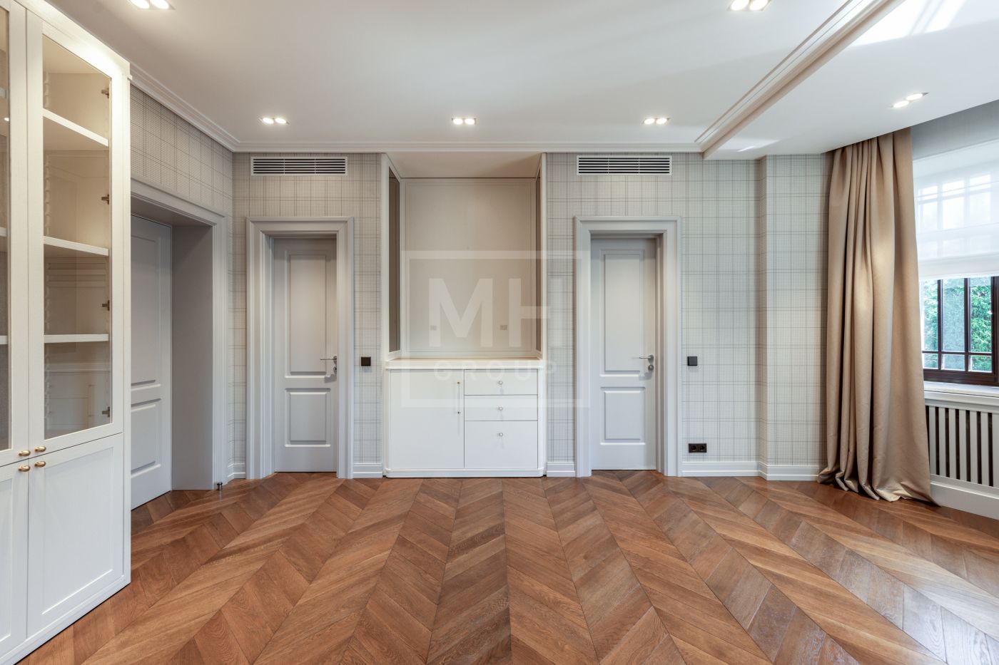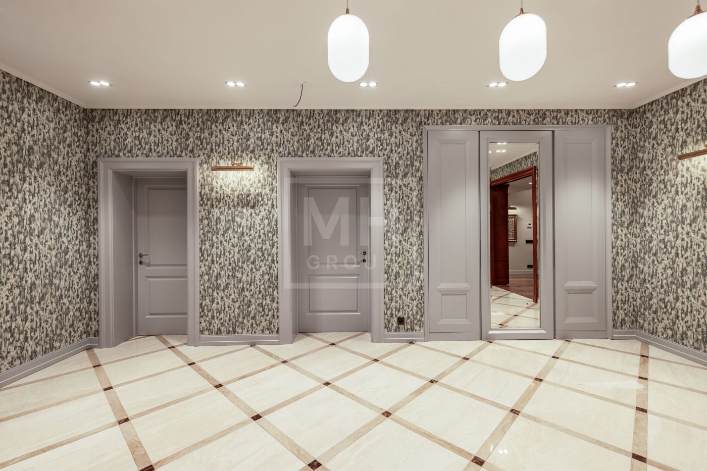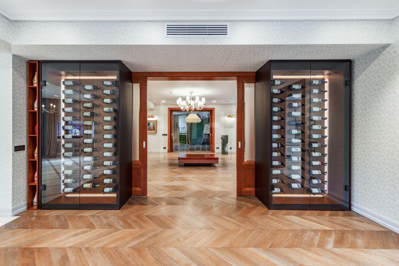 Загородный коттедж площадью 487 м² расположен на полевом участке 22 сотки,воплощает концепцию home office. Черный фасад с росписью в стиле стрит-арта создает выразительный современный образ, а большие окна наполняют интерьеры естественным светом. Внутреннее пространство выдержано в светлых тонах элементами неоклассики, где каждая деталь продумана до мелочей — премиальные обои американских производителей, мрамор, камин, авторская мебель и светильники. Особый шарм придают спортивные арт-объекты — антикварные клюшки, винтажный велосипед и футбольные мячи.Дом оснащен передовыми инженерными системами, включая канальное кондиционирование, увлажнение, приточную вентиляцию и систему «умный дом».Здесь создано идеальное пространство для комфортной работы и проведения деловых и личных встреч. Планировка включает просторную кухню-столовую с бильярдной зоной и винными шкафами, зал ожидания, 2 переговорные,5 кабинетов, гардеробную, кладовые и зону с ретро-автомобилем Bugatti. На каждом этаже расположены стойки ресепшен.