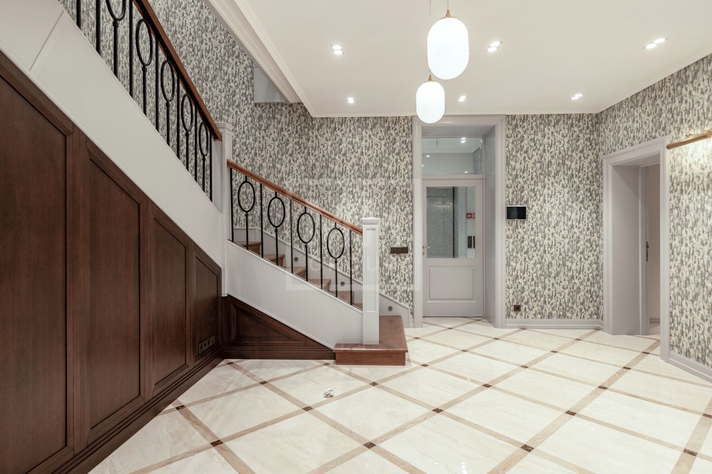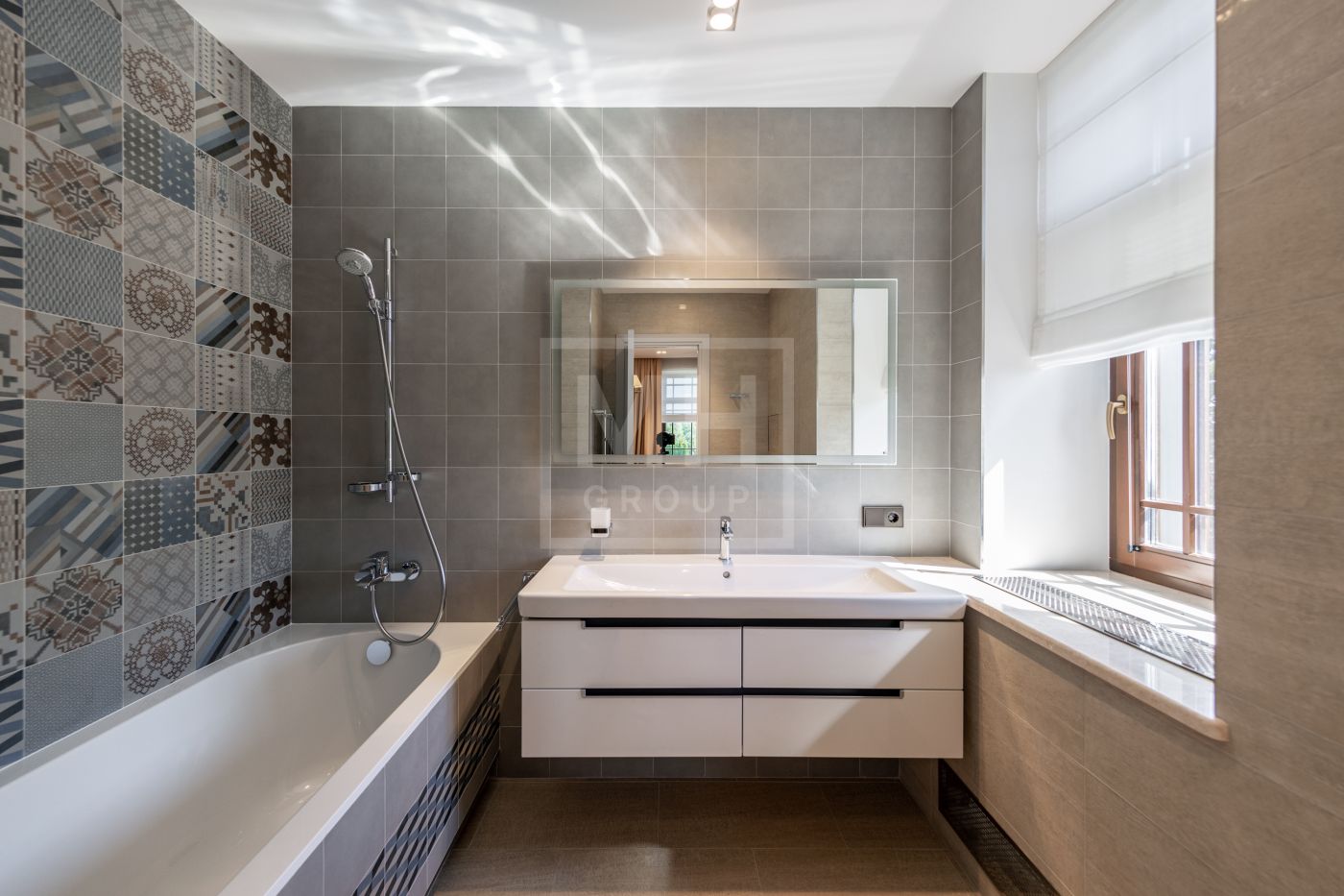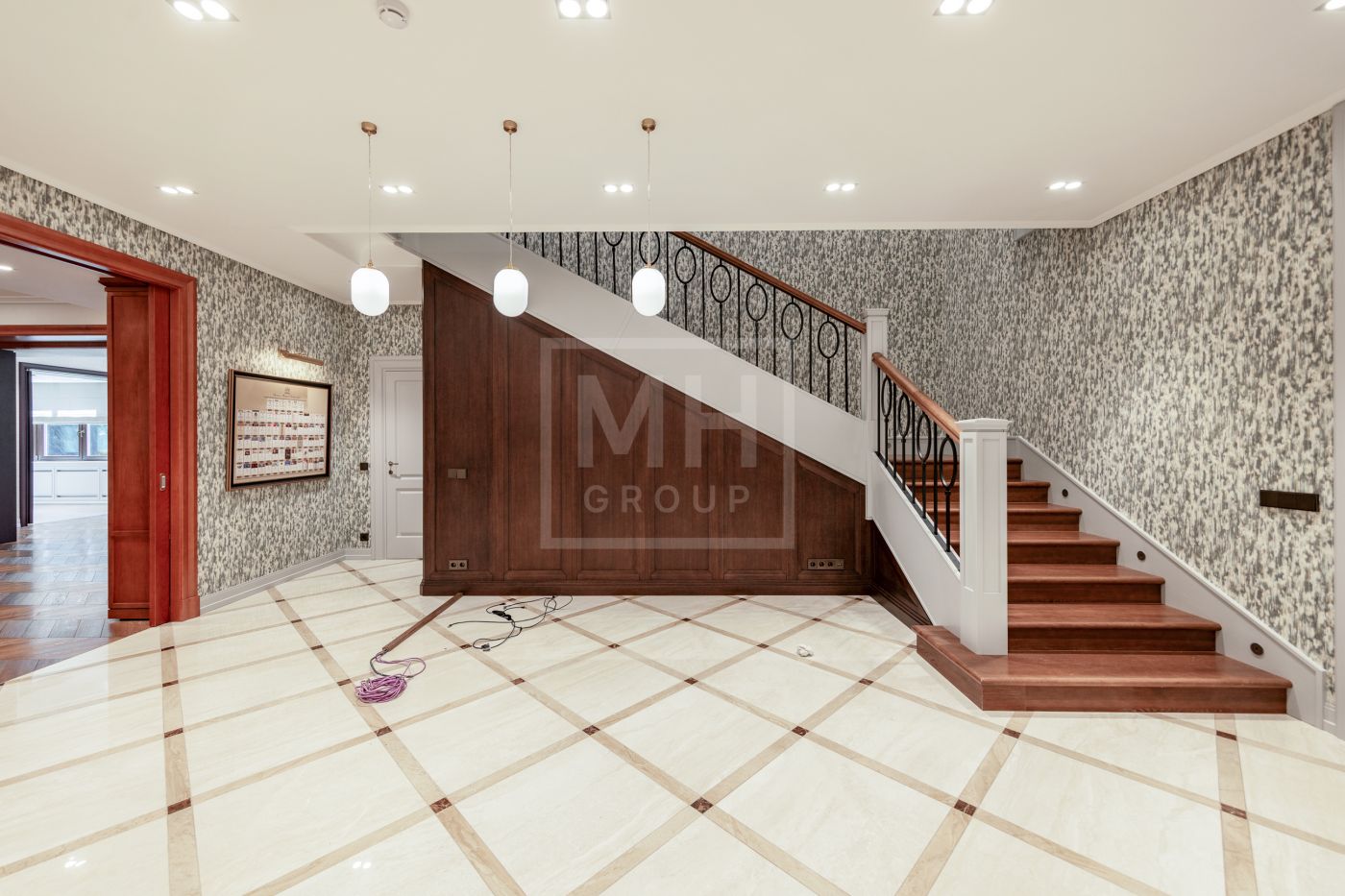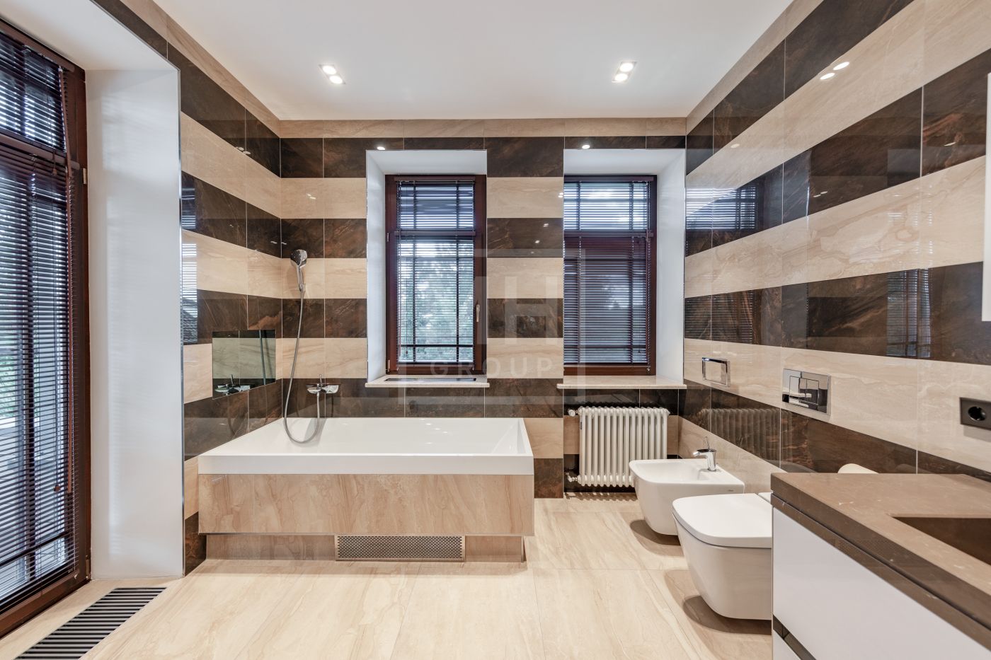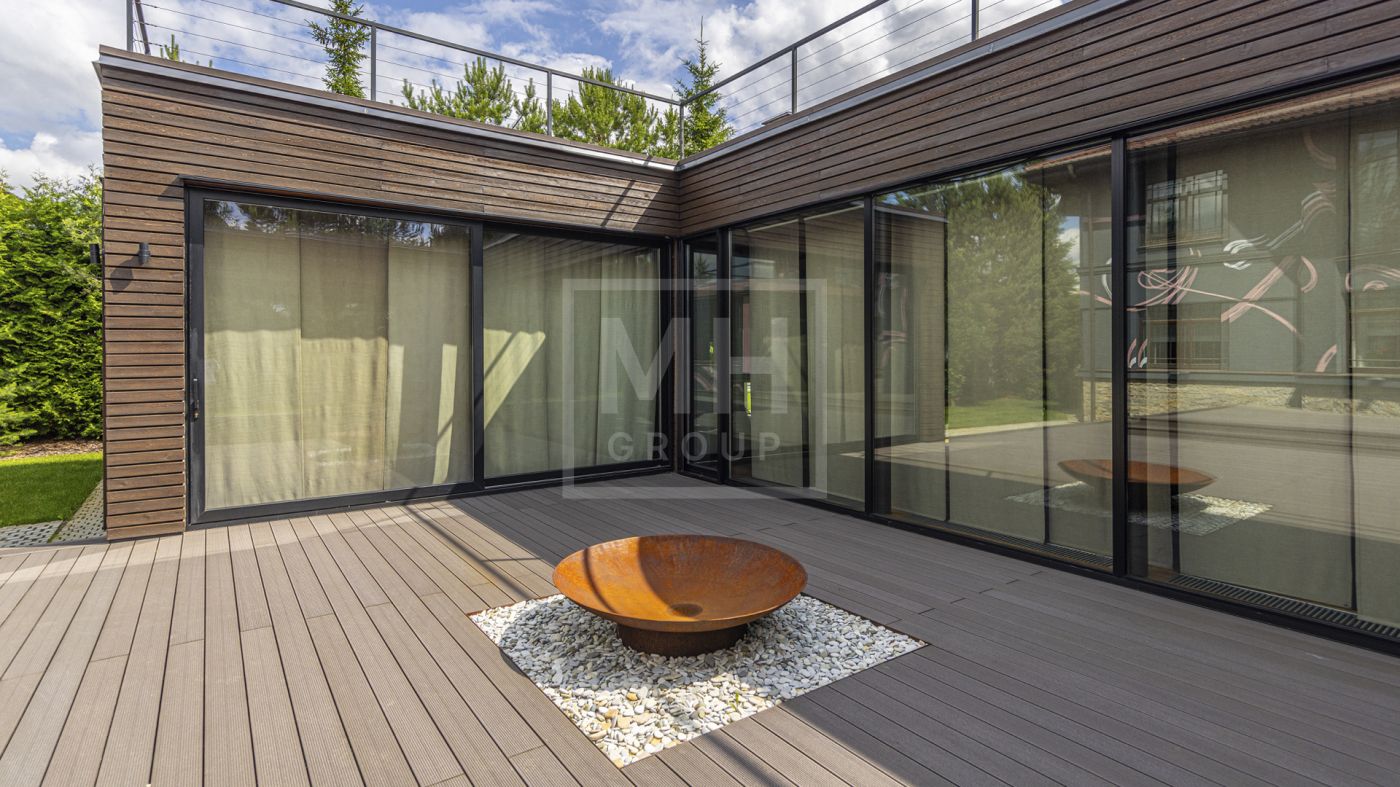 Загородный коттедж площадью 487 м² расположен на полевом участке 22 сотки,воплощает концепцию home office. Черный фасад с росписью в стиле стрит-арта создает выразительный современный образ, а большие окна наполняют интерьеры естественным светом. Внутреннее пространство выдержано в светлых тонах элементами неоклассики, где каждая деталь продумана до мелочей — премиальные обои американских производителей, мрамор, камин, авторская мебель и светильники. Особый шарм придают спортивные арт-объекты — антикварные клюшки, винтажный велосипед и футбольные мячи.Дом оснащен передовыми инженерными системами, включая канальное кондиционирование, увлажнение, приточную вентиляцию и систему «умный дом».Здесь создано идеальное пространство для комфортной работы и проведения деловых и личных встреч. Планировка включает просторную кухню-столовую с бильярдной зоной и винными шкафами, зал ожидания, 2 переговорные,5 кабинетов, гардеробную, кладовые и зону с ретро-автомобилем Bugatti. На каждом этаже расположены стойки ресепшен.