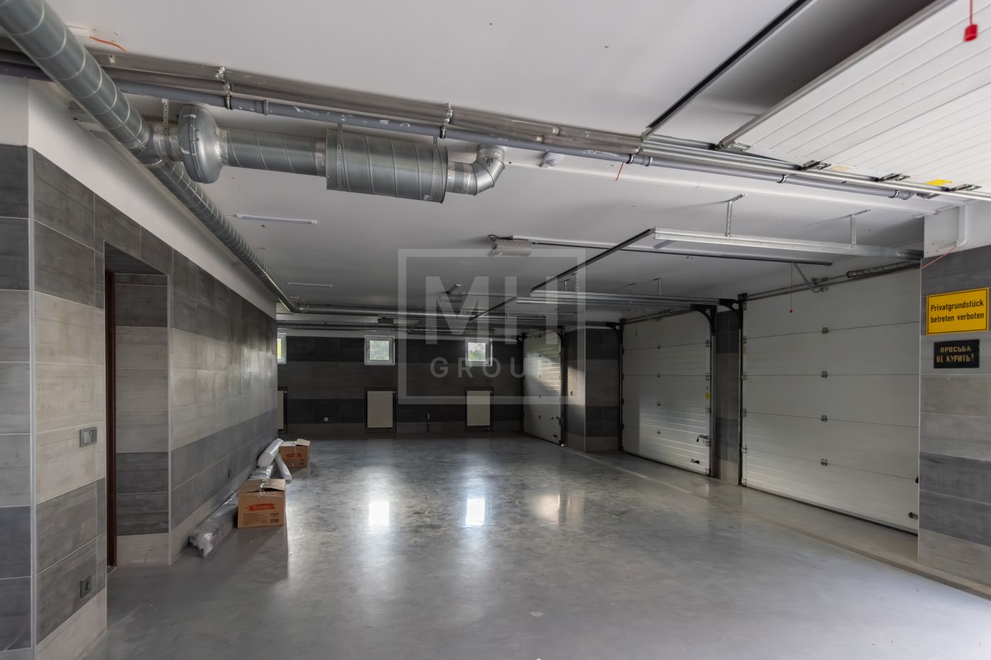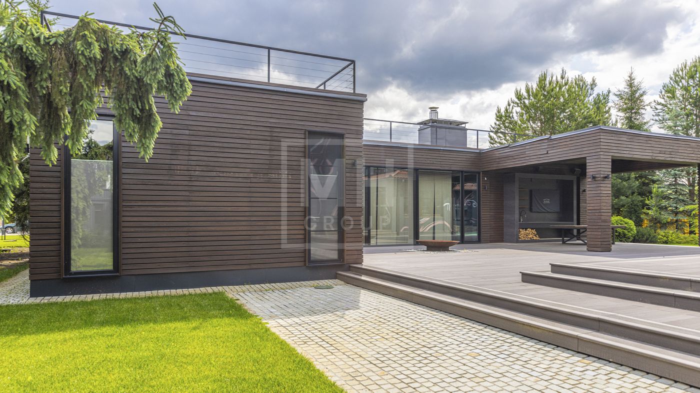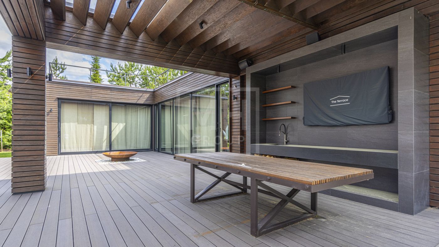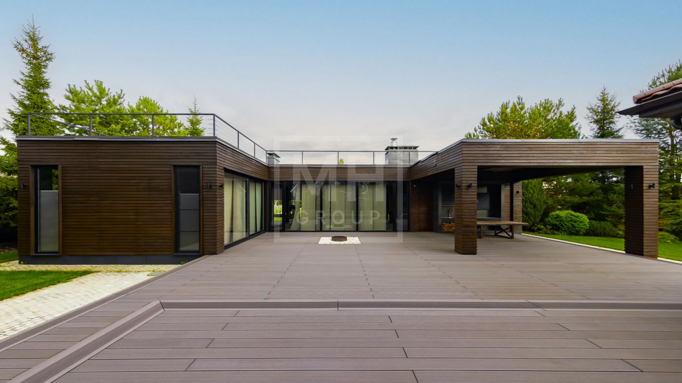 Кроме того, на территории размещены гостевой дом с лаундж-зоной и террасой для барбекю, гараж на 4 автомобиля с офисами, павильон для персонала, а также парковка с двумя навесами. Участок благоустроен — здесь засеян газон, по периметру высажены деревья и кустарники, вымощены аккуратные дорожки, проведено уличное освещение, а баскетбольная площадка и скульптура быка из металлических деталей завершают эффектный облик резиденции.