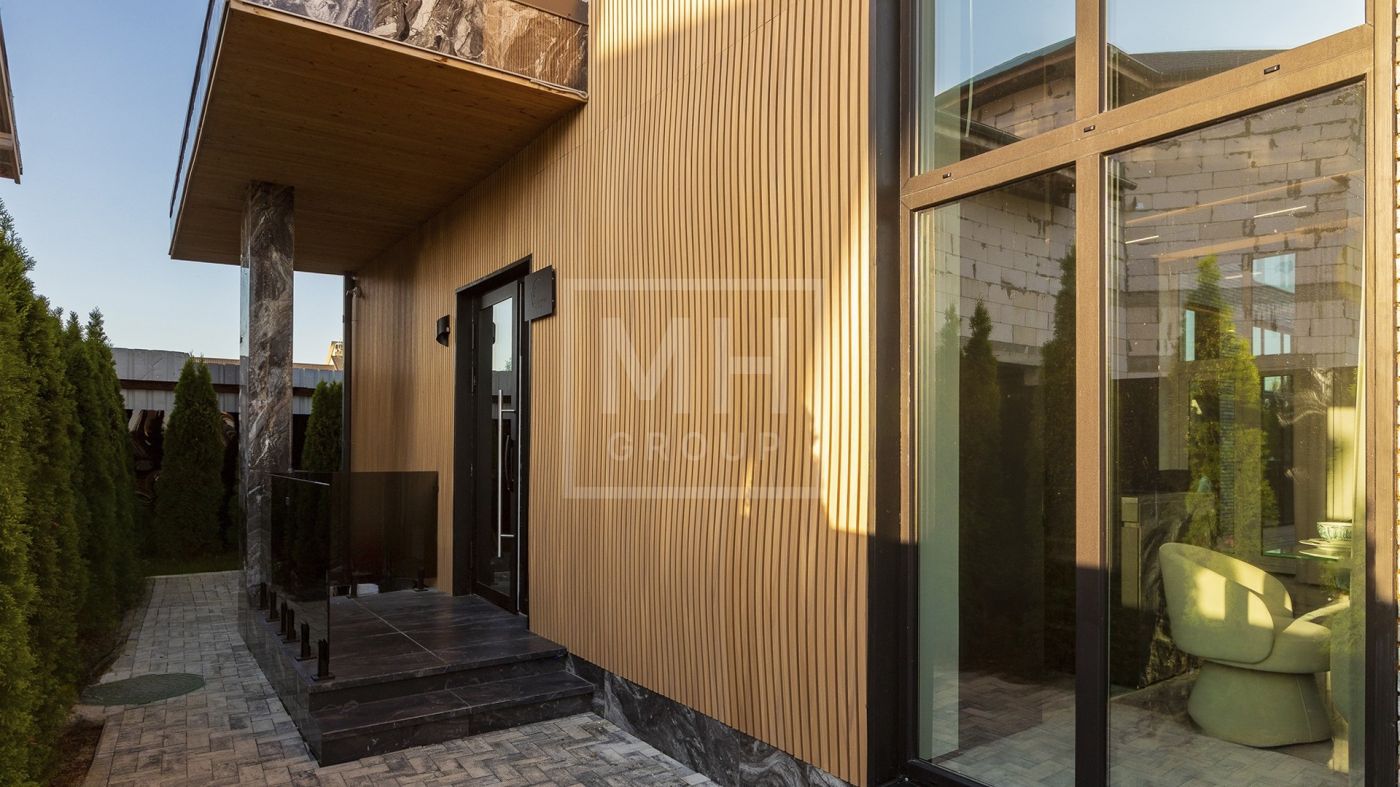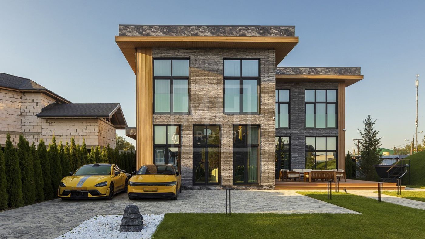 Загородный коттедж площадью 187 м² расположен на полевом участке 13 соток. Современный фасад с плоской крышей облицован клинкерным кирпичом RockWalls и рейками Great Wall Board с фактурой дерева, а подсветка Joyled гармонично подчёркивает выразительность здания. Панорамные окна наполняют внутренние пространства солнцем и открывают живописные виды на природное окружение.Интерьеры, оформленные в спокойных тонах, отделаны с использованием крупноформатного керамогранита Kerama Marazzi и декоративной штукатурки, а также дополнены стеновыми панелями из натурального шпона с элегантными