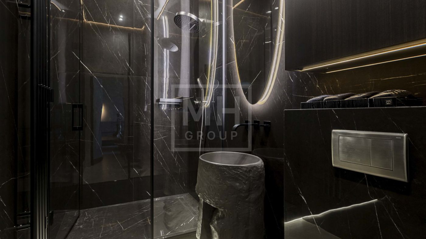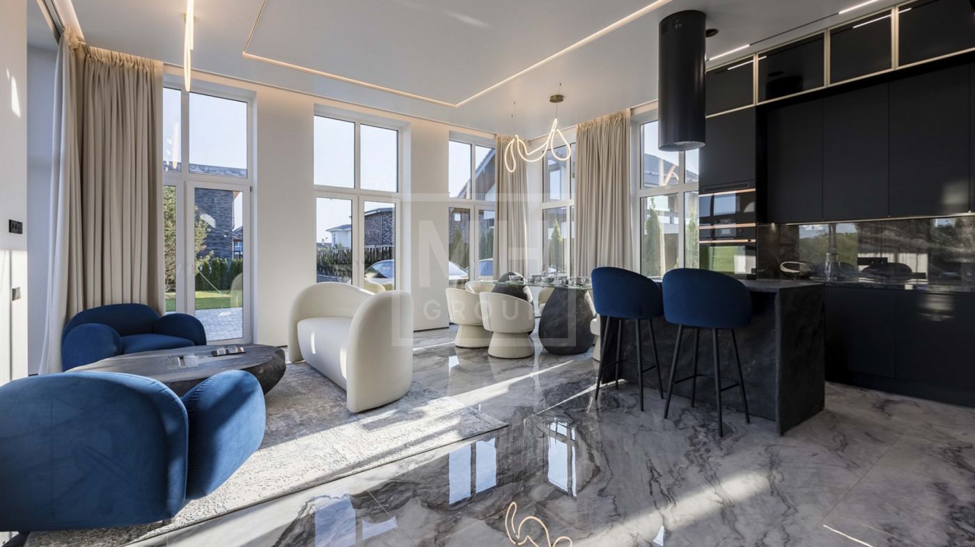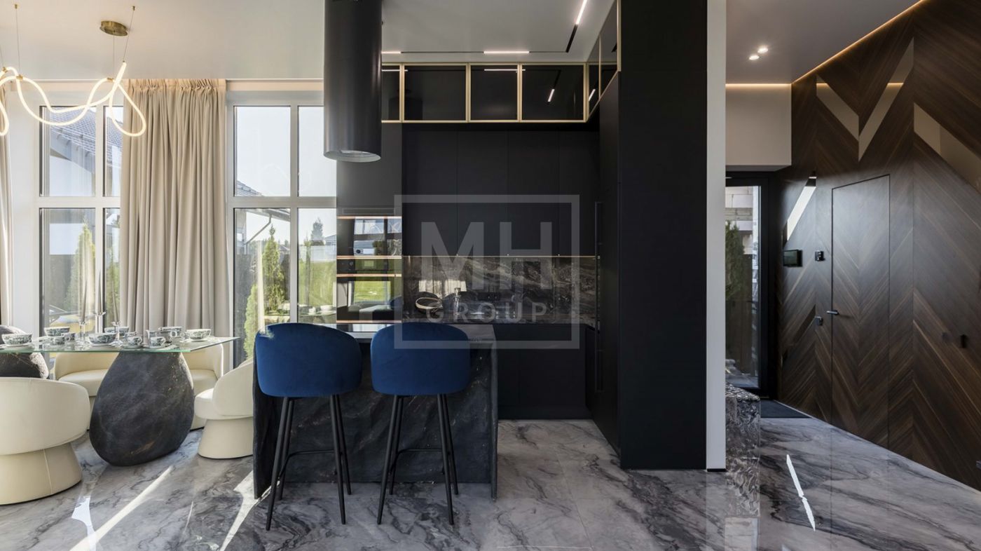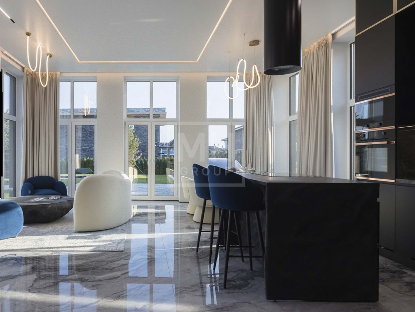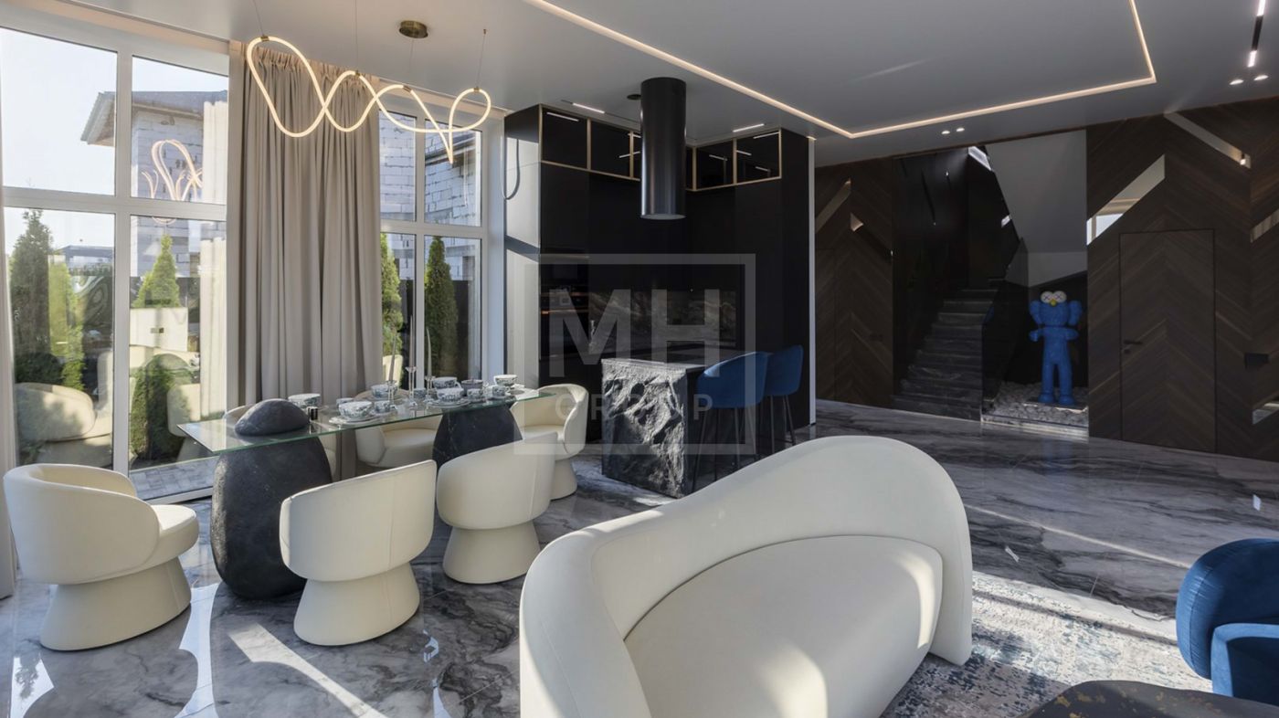 латунными вставками, стильной мебелью и сантехникой от Grohe, Omoikiri и Abber. Продуманная система освещения с изящными люстрами и подсветкой позволяет сформировать подходящую атмосферу. Для безупречного комфорта оборудованы система «умный дом», приточная вентиляция, кондиционирование и подогрев пола.