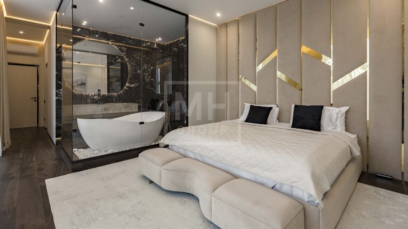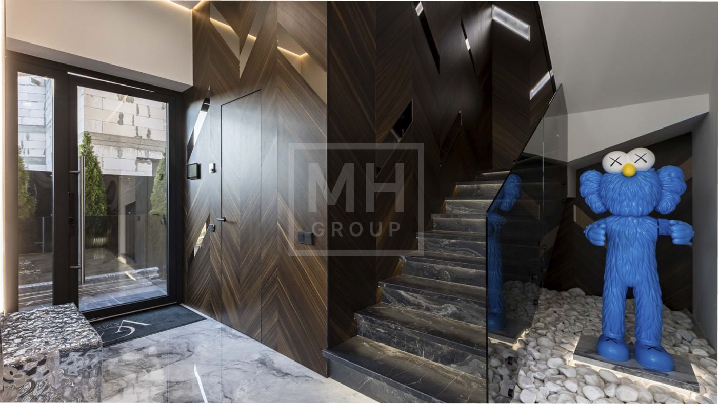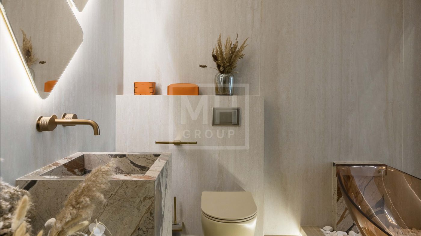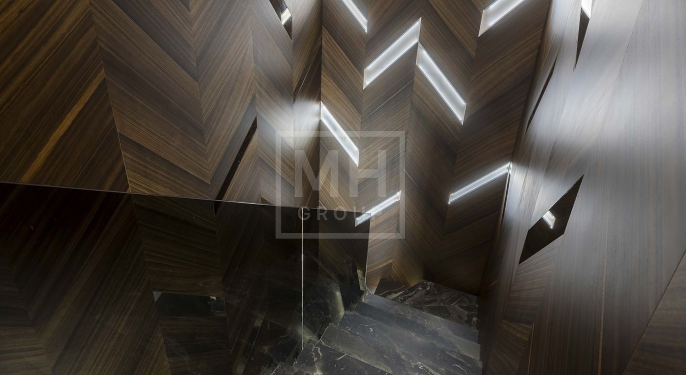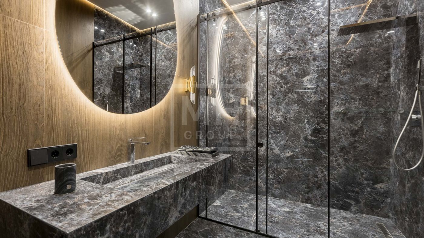 латунными вставками, стильной мебелью и сантехникой от Grohe, Omoikiri и Abber. Продуманная система освещения с изящными люстрами и подсветкой позволяет сформировать подходящую атмосферу. Для безупречного комфорта оборудованы система «умный дом», приточная вентиляция, кондиционирование и подогрев пола.