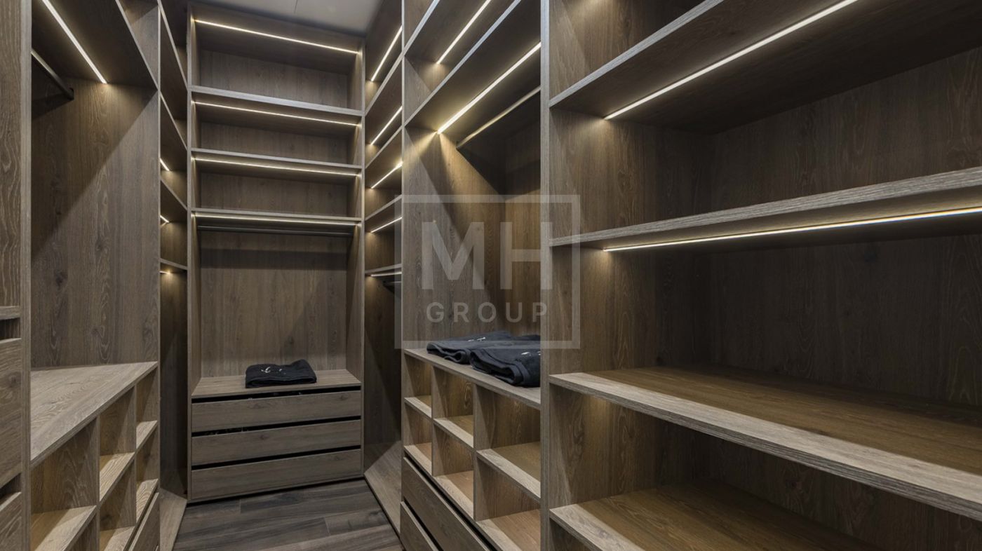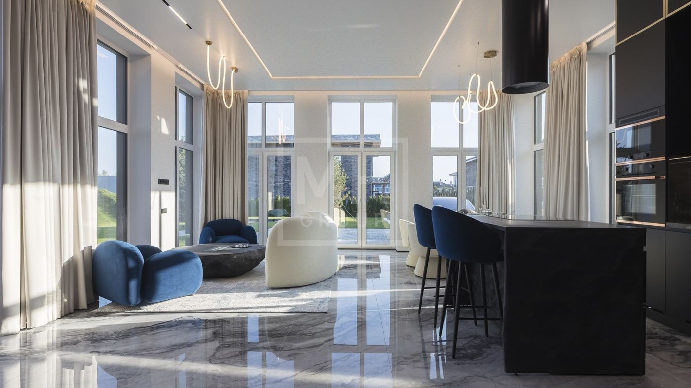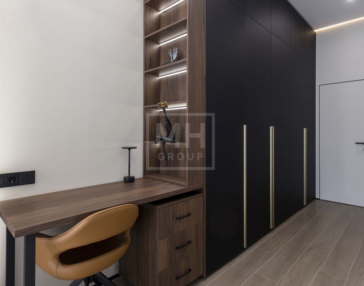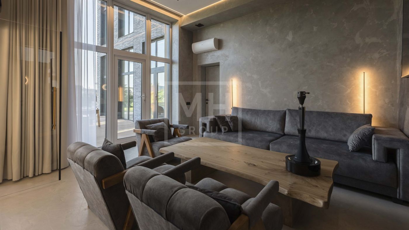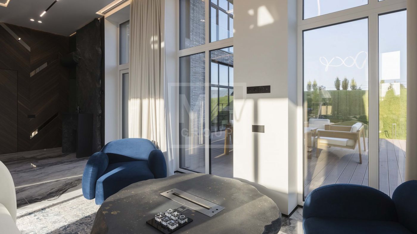 латунными вставками, стильной мебелью и сантехникой от Grohe, Omoikiri и Abber. Продуманная система освещения с изящными люстрами и подсветкой позволяет сформировать подходящую атмосферу. Для безупречного комфорта оборудованы система «умный дом», приточная вентиляция, кондиционирование и подогрев пола.