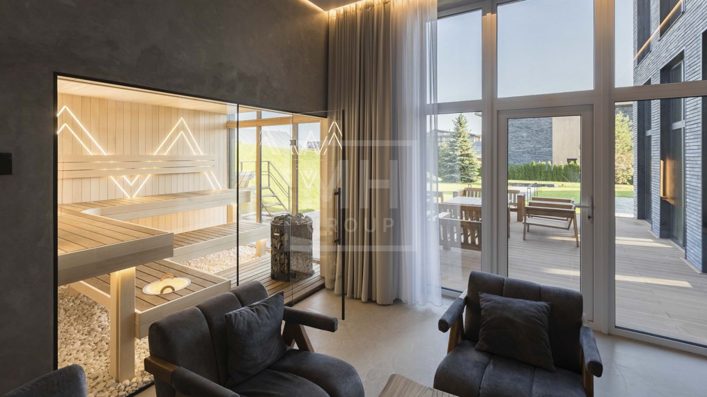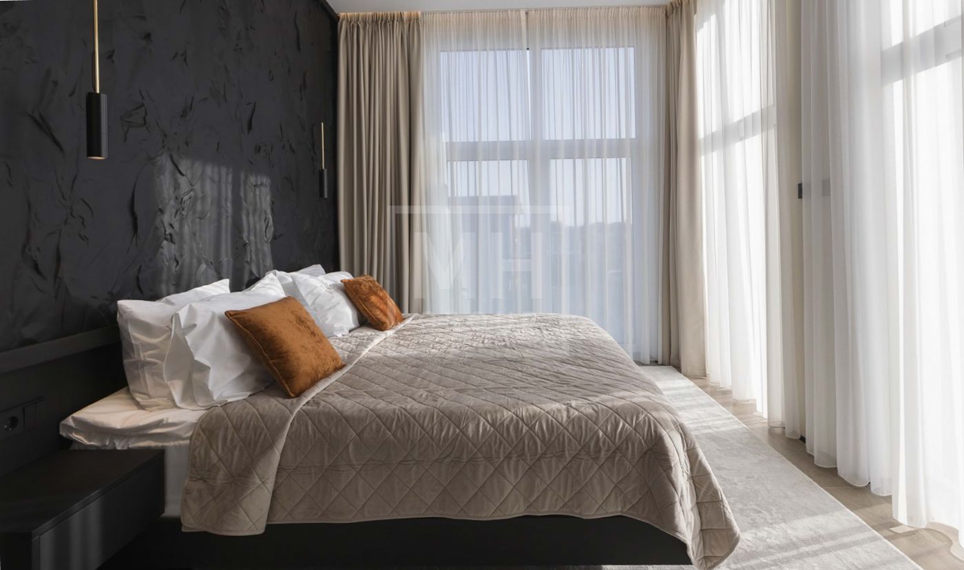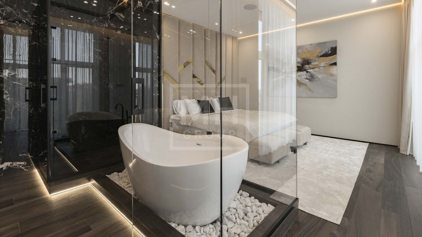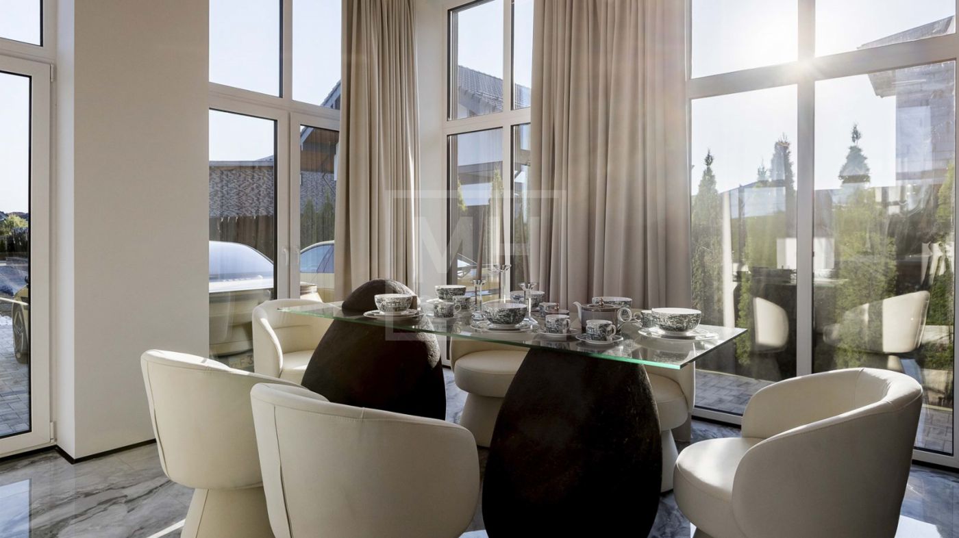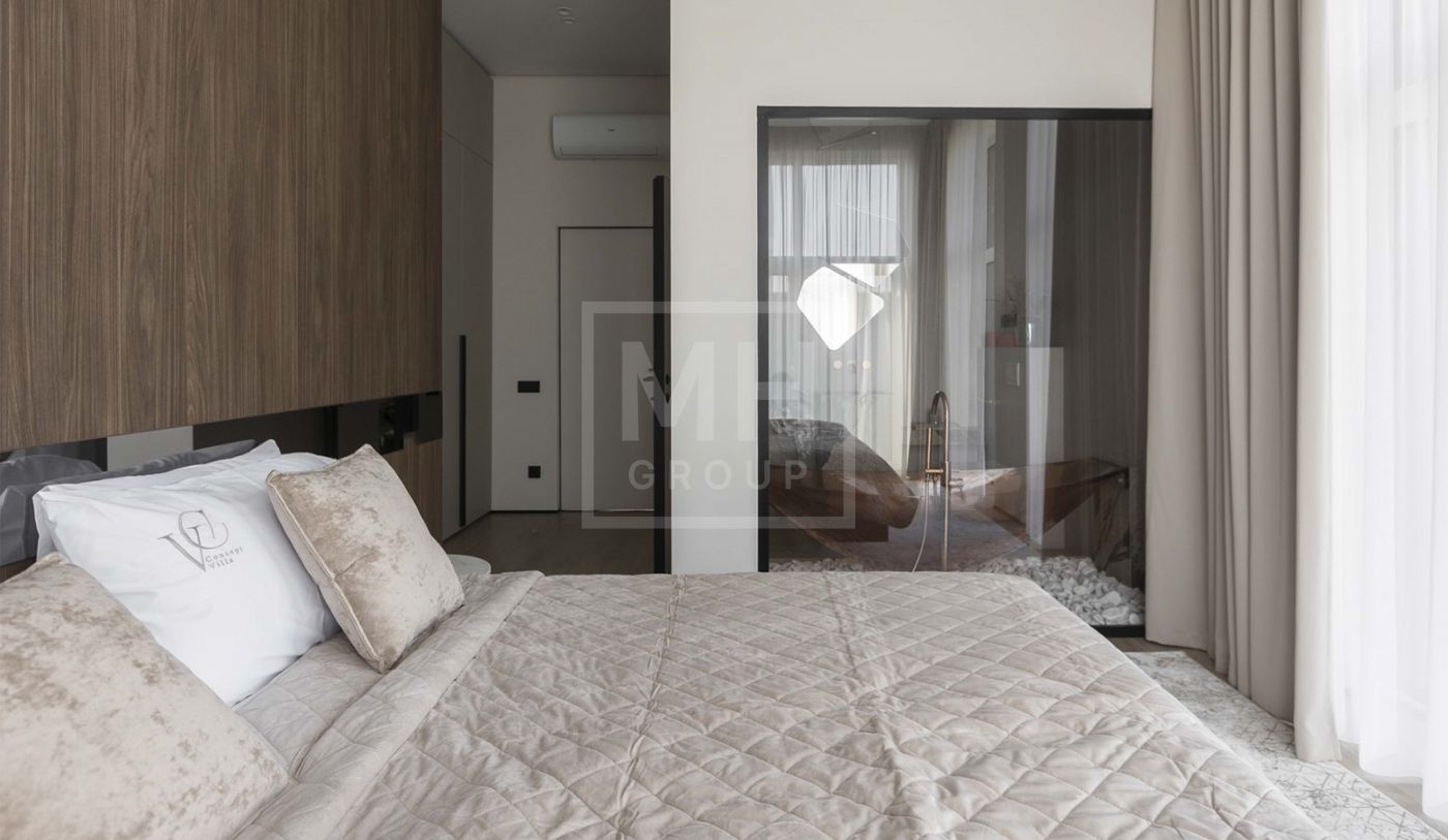 латунными вставками, стильной мебелью и сантехникой от Grohe, Omoikiri и Abber. Продуманная система освещения с изящными люстрами и подсветкой позволяет сформировать подходящую атмосферу. Для безупречного комфорта оборудованы система «умный дом», приточная вентиляция, кондиционирование и подогрев пола.