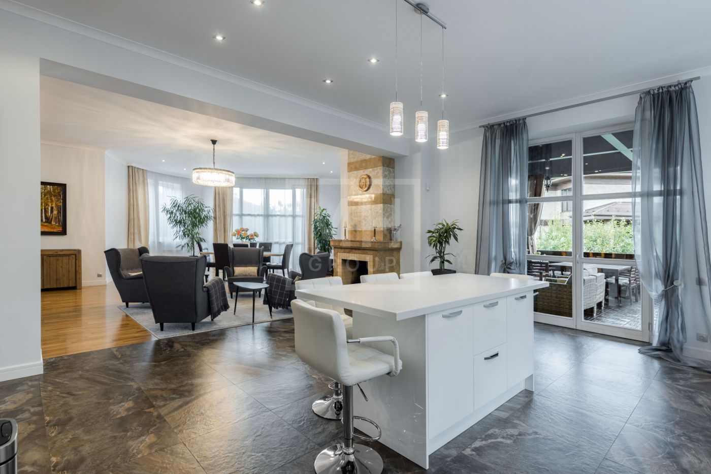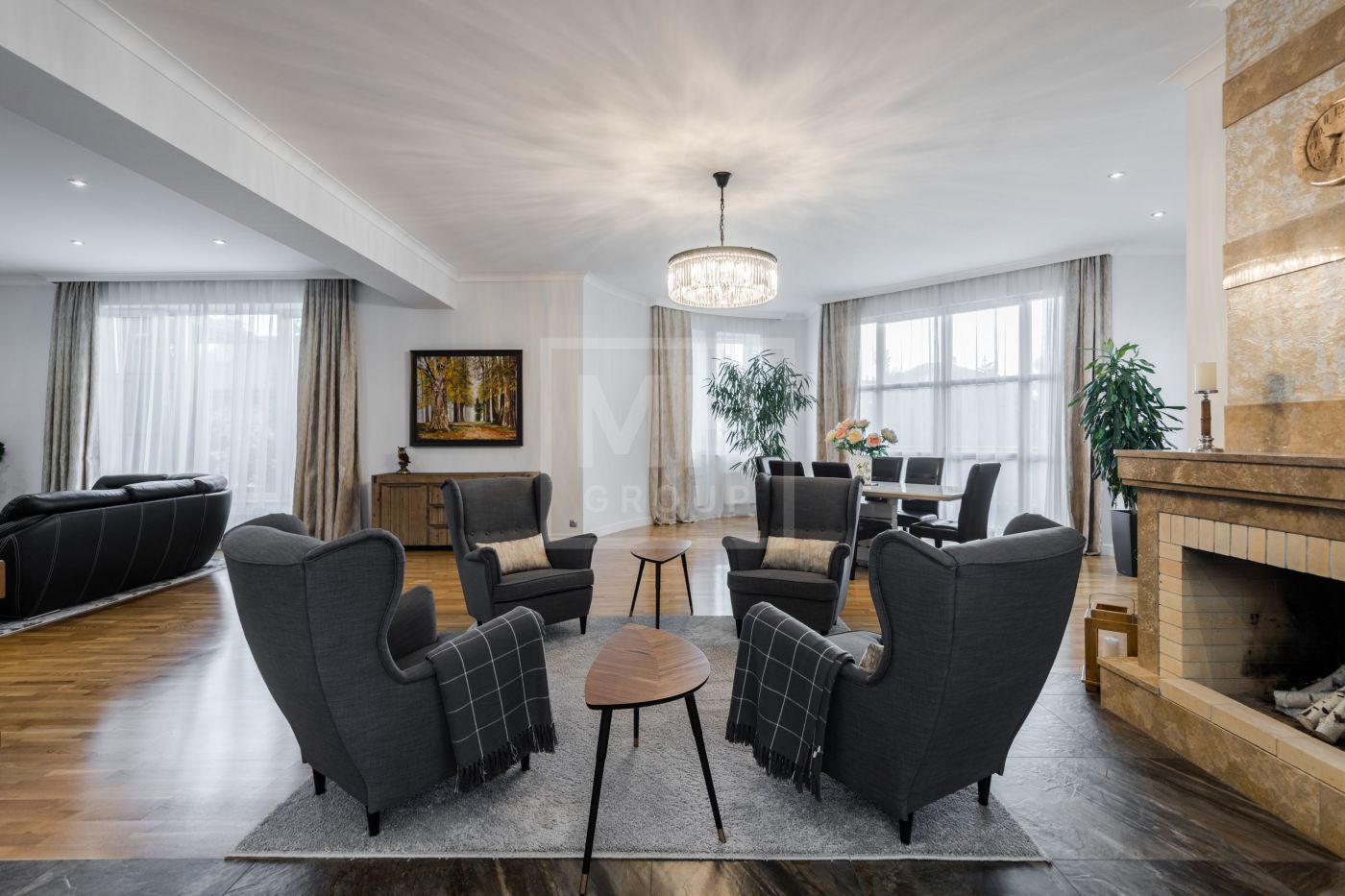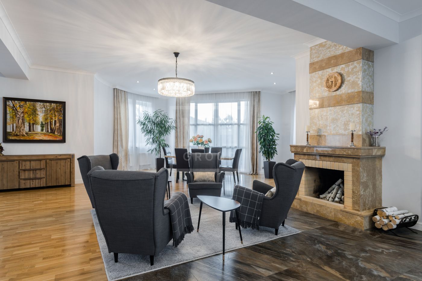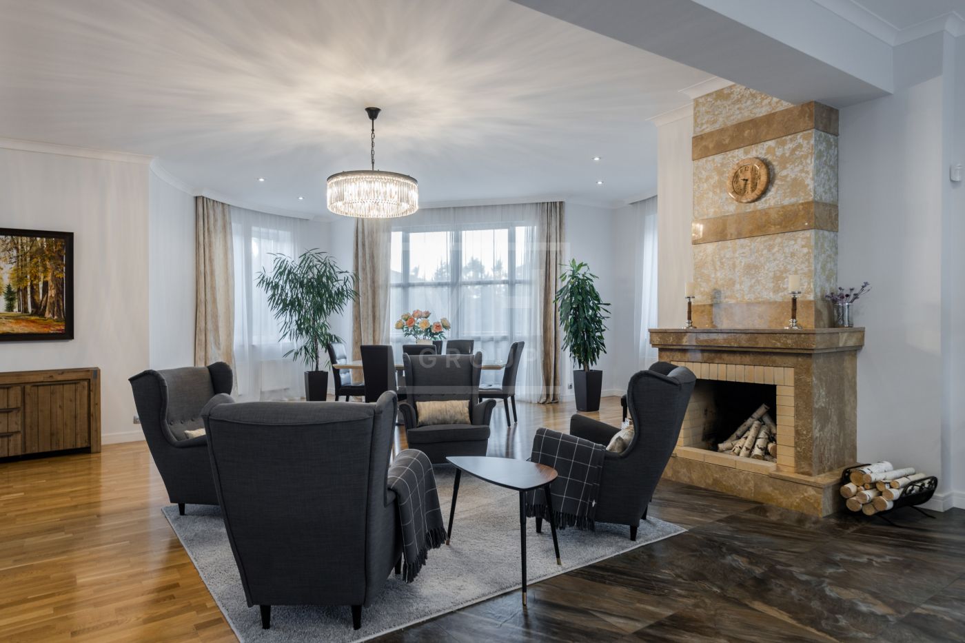 Этаж 1: кухня, гостиная с камином, столовая, объединенные открытой планировкой, гардеробная, с/у