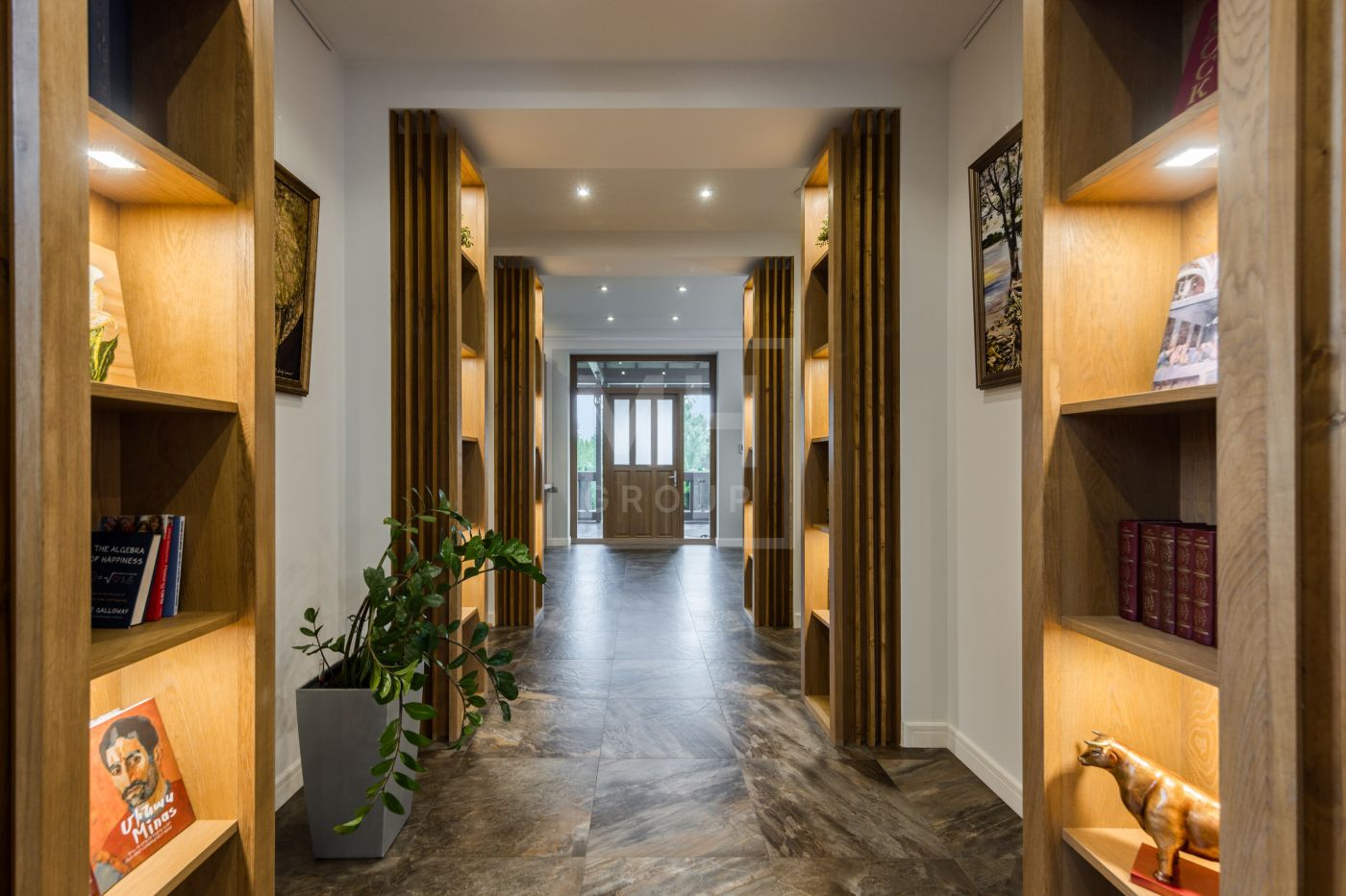 На участке высажены хвойные и садовые деревья, оборудована зона барбекю с мангалом под навесом, отдельно расположен гараж на 2 авто, помещение для персонала и бойлерная.